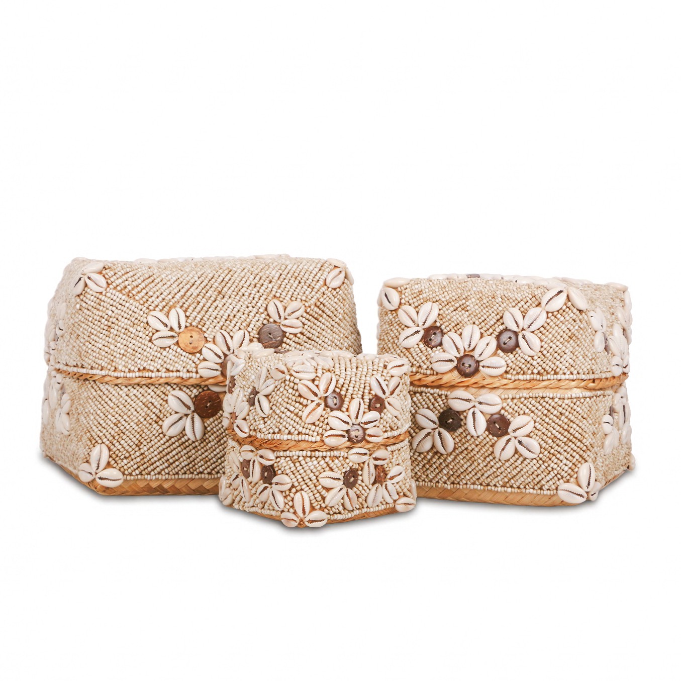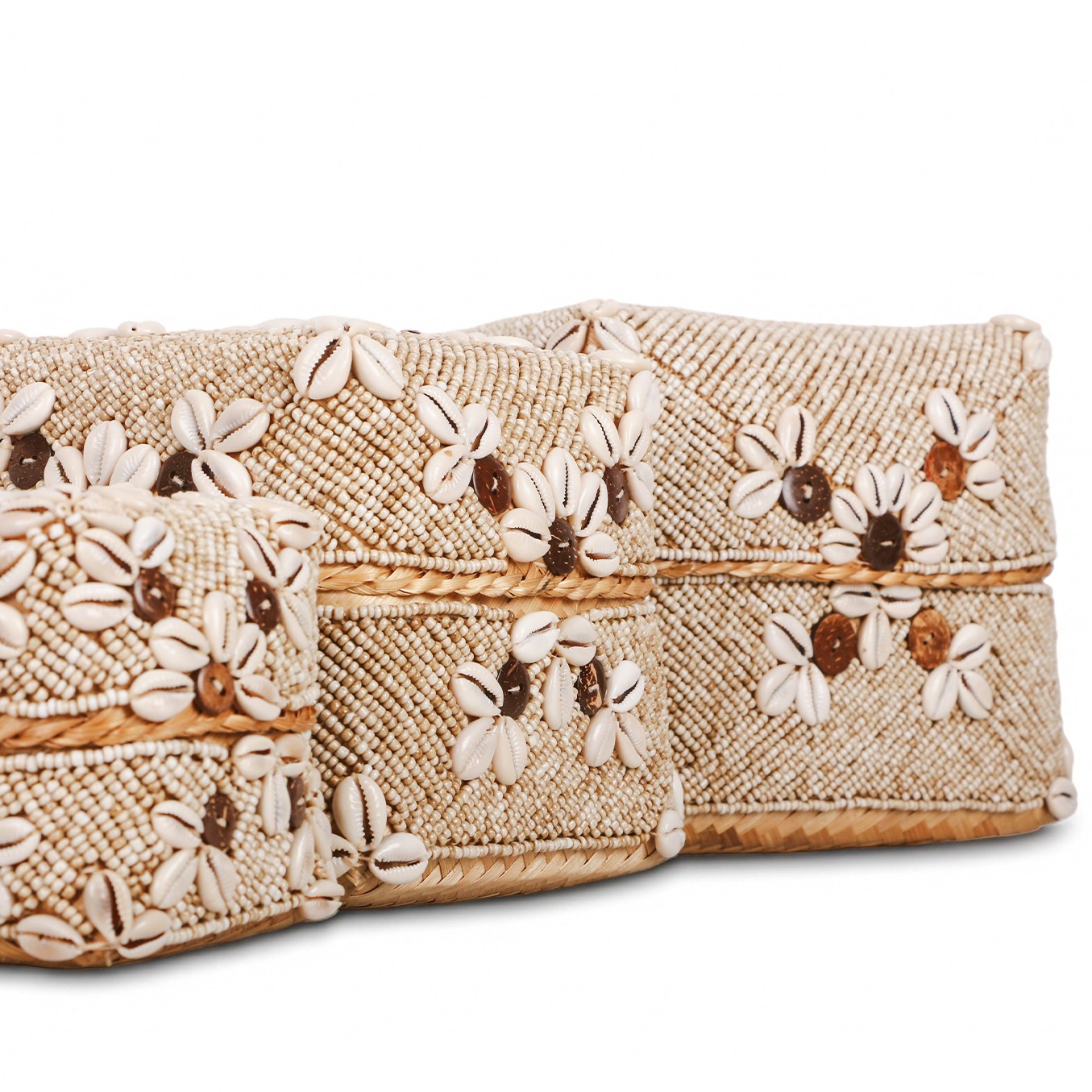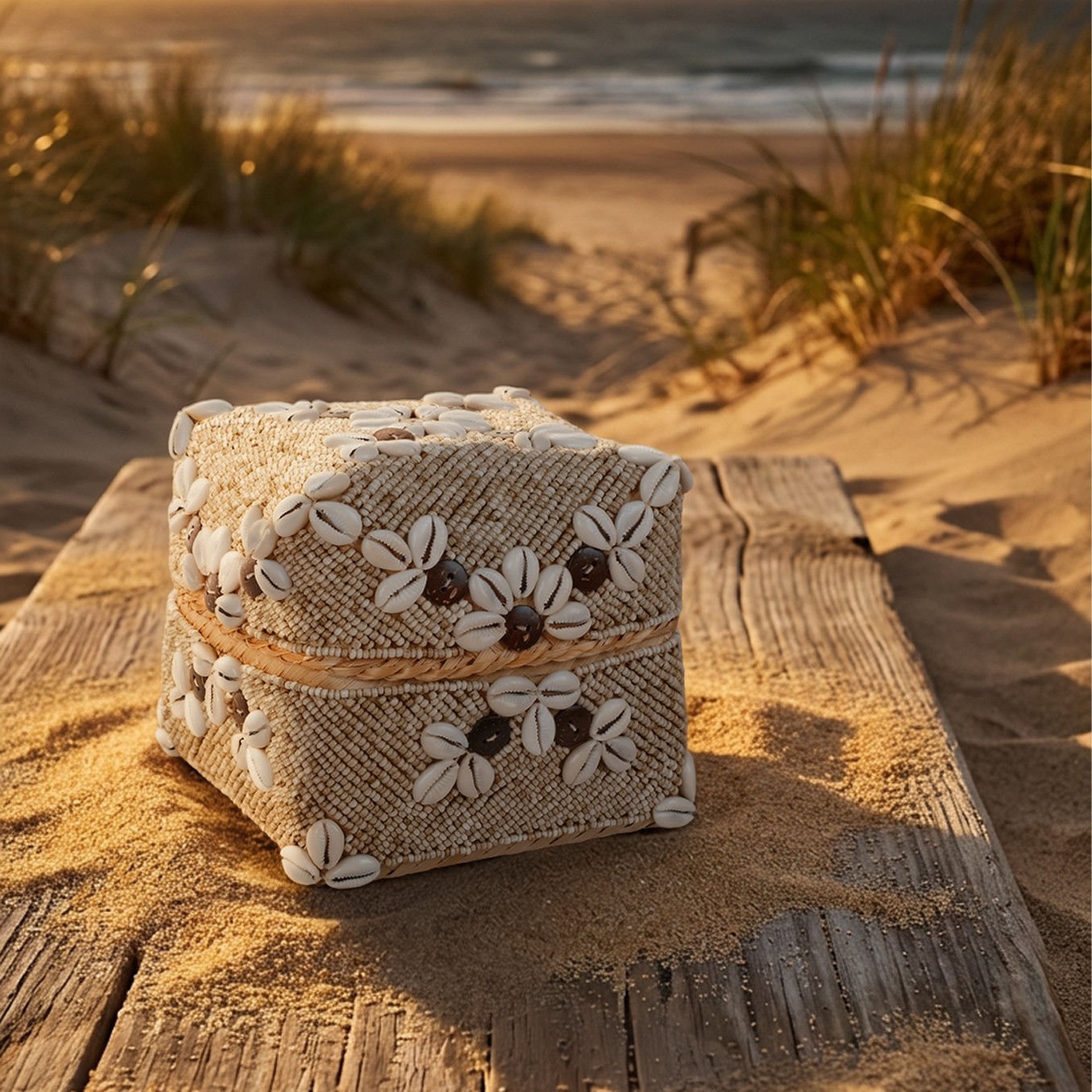 Setin her parçası, dayanıklı bambu veya doğal liflerin sıkı bir örgü tekniğiyle tamamen el işçiliğiyle üretilmiştir. Kutuların kapak ve yan yüzeyleri, geleneksel Bali el sanatlarından ilham alan yoğun krem/bej tonlu boncuk işçiliği ile kaplanmıştır. Bu boncukların arasına yerleştirilen deniz kabukları (cowrie shell), zarif çiçek motifleri oluşturarak sete doğal ve otantik bir hava katar.