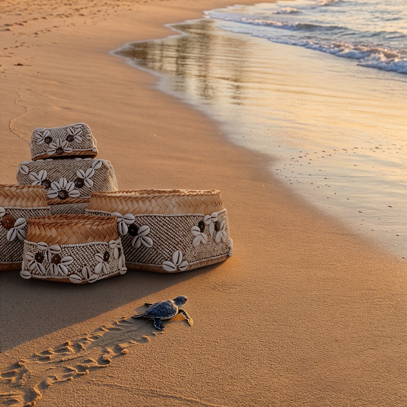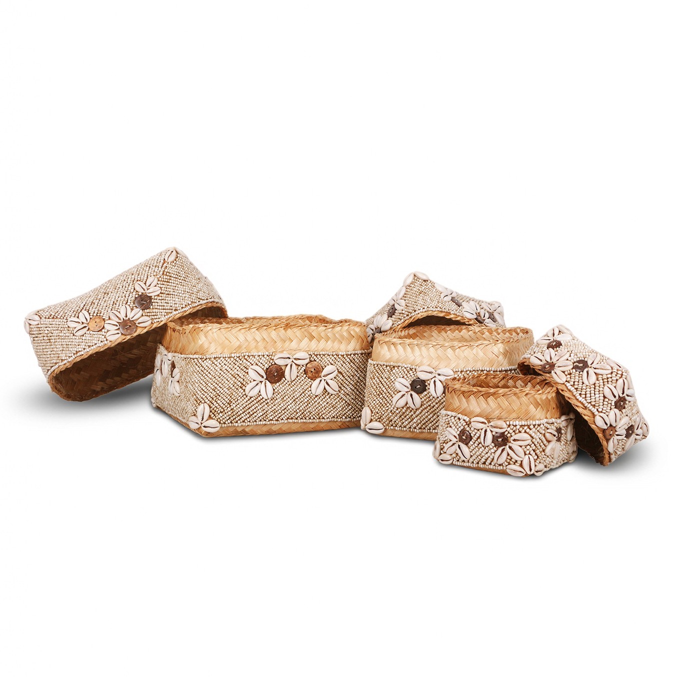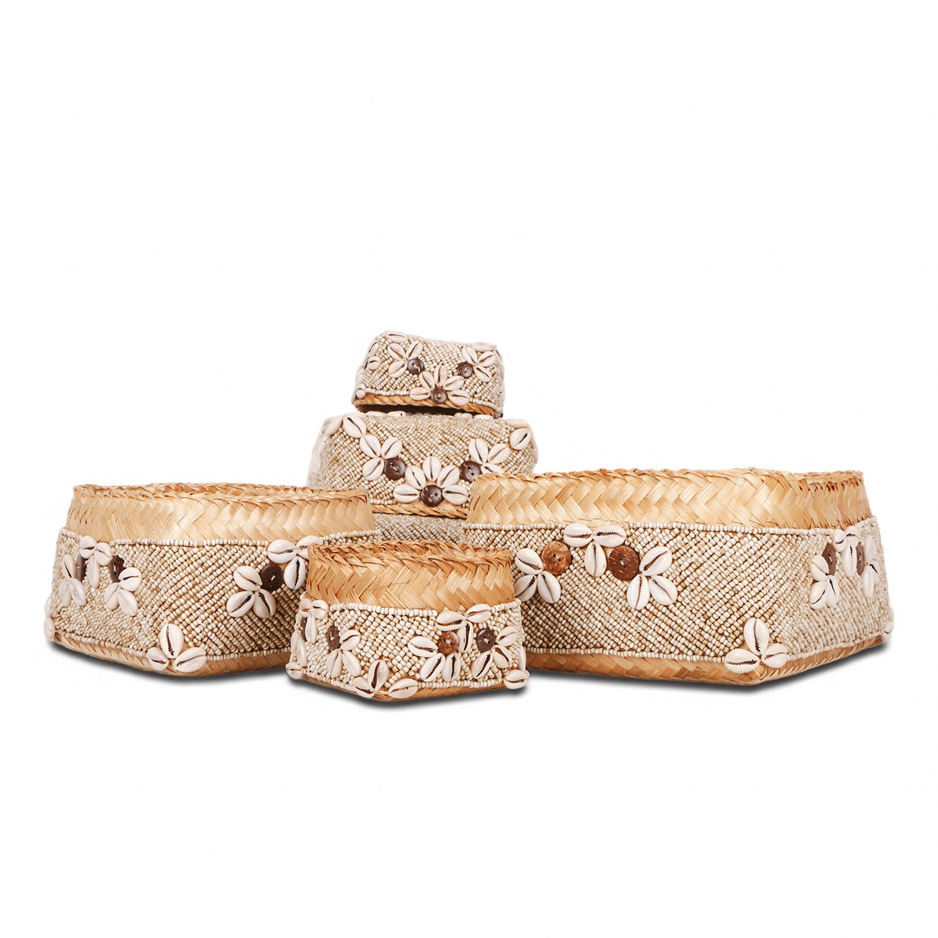 Setin her parçası, dayanıklı bambu veya doğal liflerin sıkı bir örgü tekniğiyle tamamen el işçiliğiyle üretilmiştir. Kutuların kapak ve yan yüzeyleri, geleneksel Bali el sanatlarından ilham alan yoğun krem/bej tonlu boncuk işçiliği ile kaplanmıştır. Bu boncukların arasına yerleştirilen deniz kabukları (cowrie shell), zarif çiçek motifleri oluşturarak sete doğal ve otantik bir hava katar.