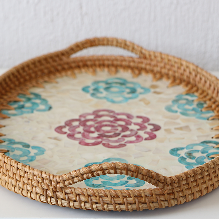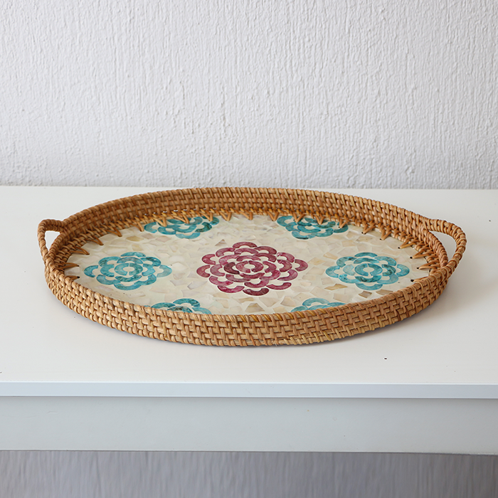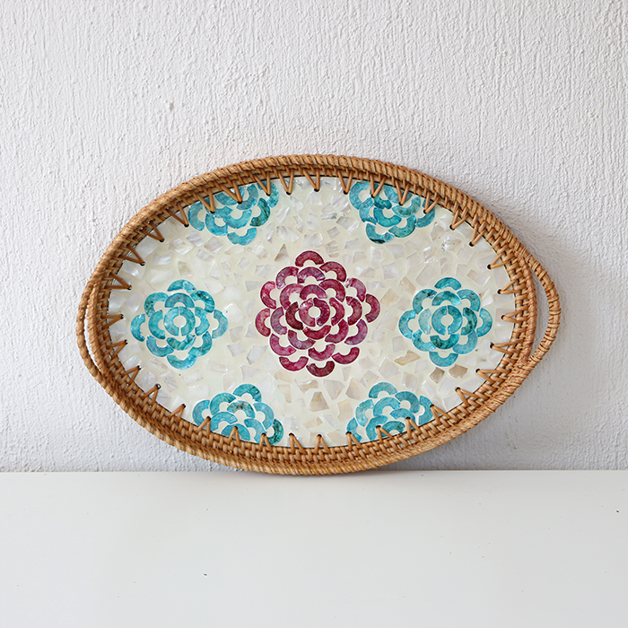 Anita Oval Orta Boy Mavi & Bordo Desenli Sedefli Mozaik Tepsi & Duvar Dekoru 40x27x5 cm