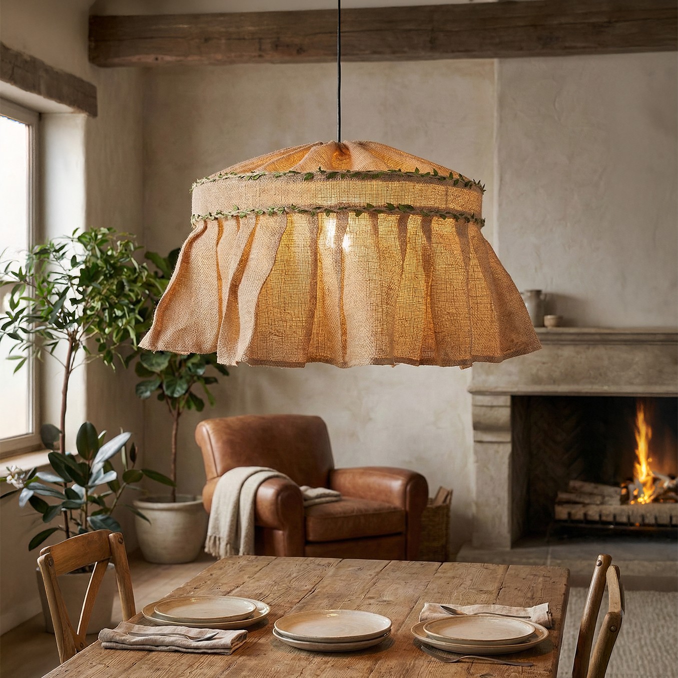 Geleneksel jüt dokumasının sıcak ışığı yumuşatma yeteneği sayesinde, bu avize oturma odası, yatak odası veya koridorlar için ideal, davetkâr ve yumuşak bir ortam ışığı sağlar. Bohem, rustik veya İskandinav tarzı dekorasyonlar için mükemmel bir tamamlayıcıdır.