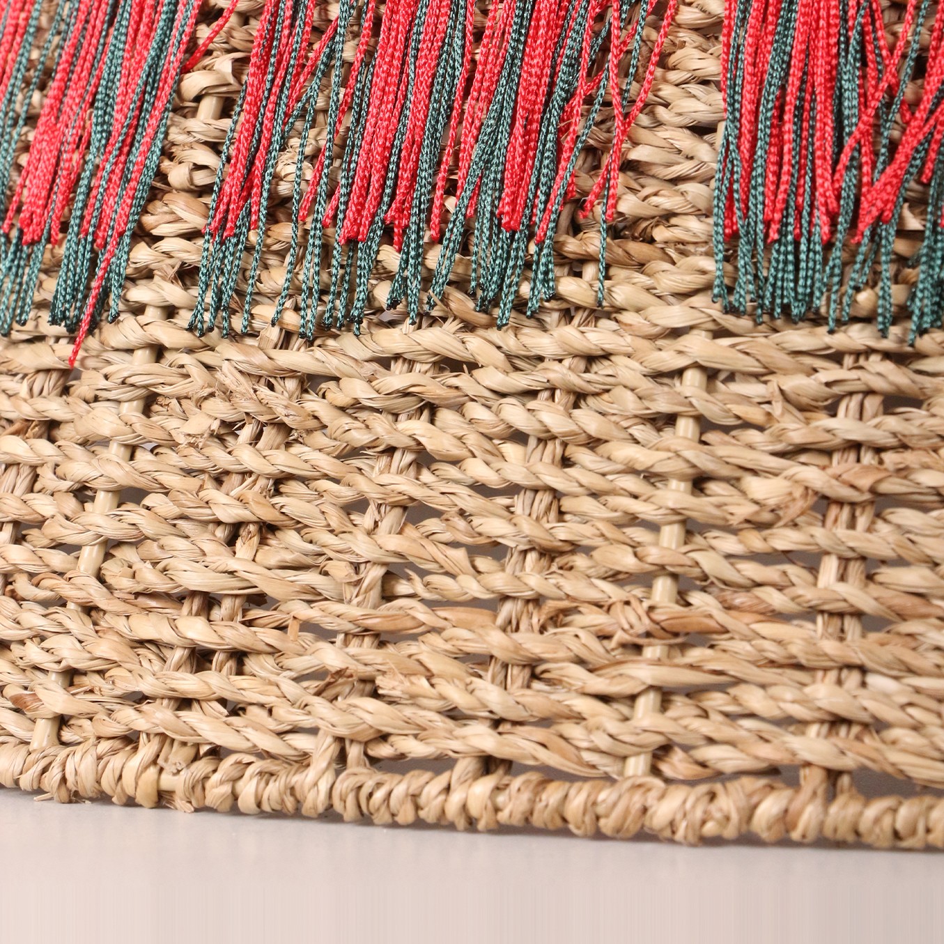 Malzeme Gövde: Kalın örgü Doğal Hasır/Saman Ot & Süsleme: Kalın iplikten Kontrast Renkli Püsküller (Kırmızı ve Yeşil İplikler)
