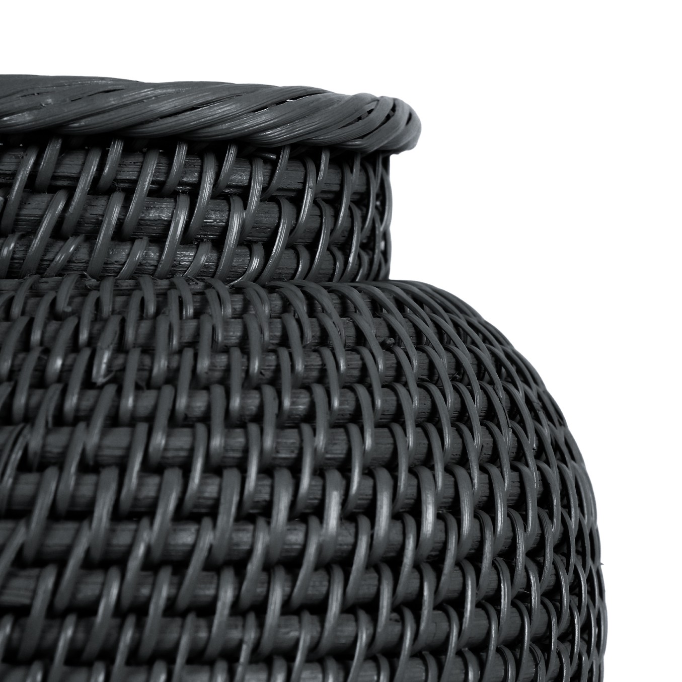 Bu vazo, dayanıklı rattan liflerinin usta ellerde sıkı ve düzenli bir örgü tekniğiyle şekillendirilmesiyle üretilmiştir. Mat siyah rengi, malzemenin rustik dokusunu ön plana çıkarırken, her türlü dekorasyon stiline (özellikle minimalist, modern veya İskandinav) anında derinlik ve karakter katar.