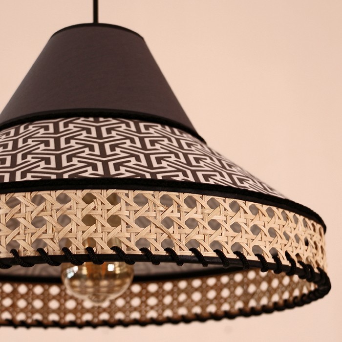 Çap; 40 cm Yükseklik: 35 cm Ürünümüz Doğal hazeran malzemeden ve ışık geçirgenliği olan Abajur kumaşından statik boyalı tel üzerine el işçiliği ile üretilmiştir. Ürünümüz siyah askı tesisatı ile birlikte gönderilecektir.