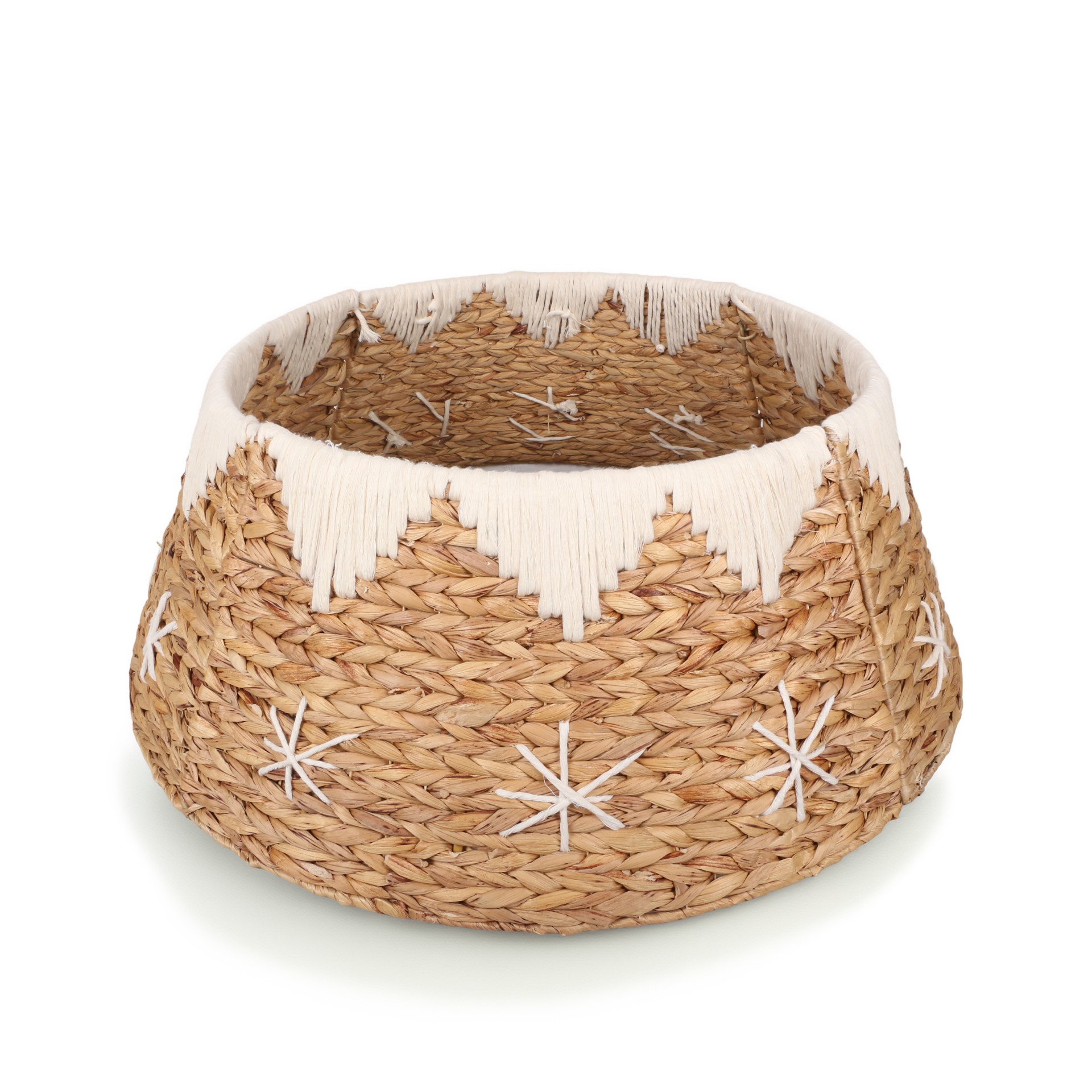 Doğal Su Sümbülü & Makrome Detaylı Yılbaşı Ağacı Eteği, doğallığın zarafetini el işçiliğiyle birleştirir. El örgüsü Su Sümbülü lifleri, üst kenarındaki makrome ipi dokusuyla buluşarak her detayıyla sıcak ve bohem bir görünüm oluşturur.