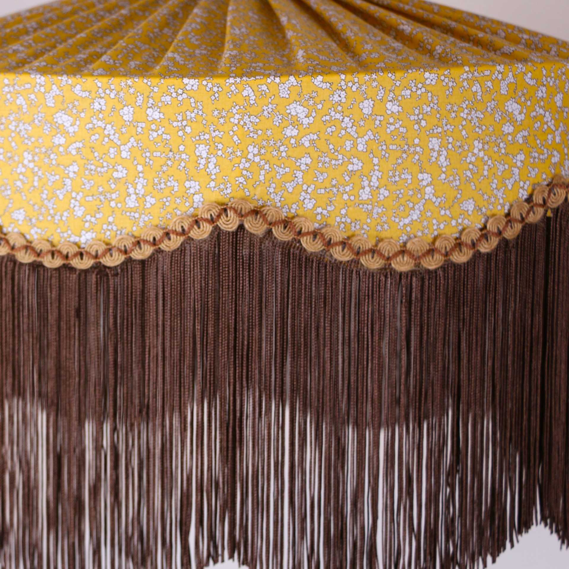 İmalat Ürünümüz; ışık geçirgenliği olan abajur kumaşından statik boyalı tel üzerine el işçiliği ile üretilmiştir. İmalat ürünümüzde, bütün detaylar düşünülerek saçak, kadife biyeler, sutaşı ve özel ipler kullanılmıştır.