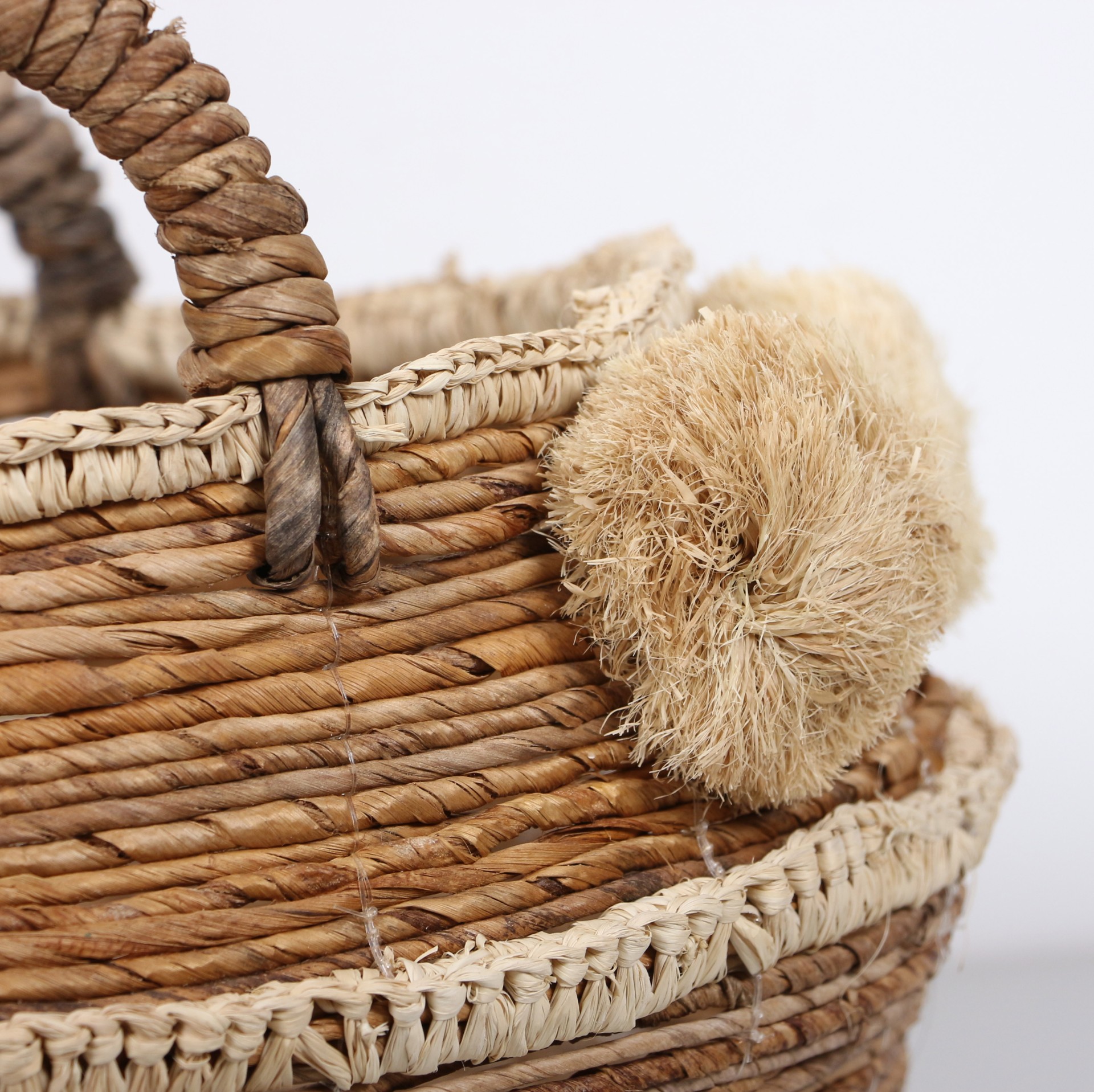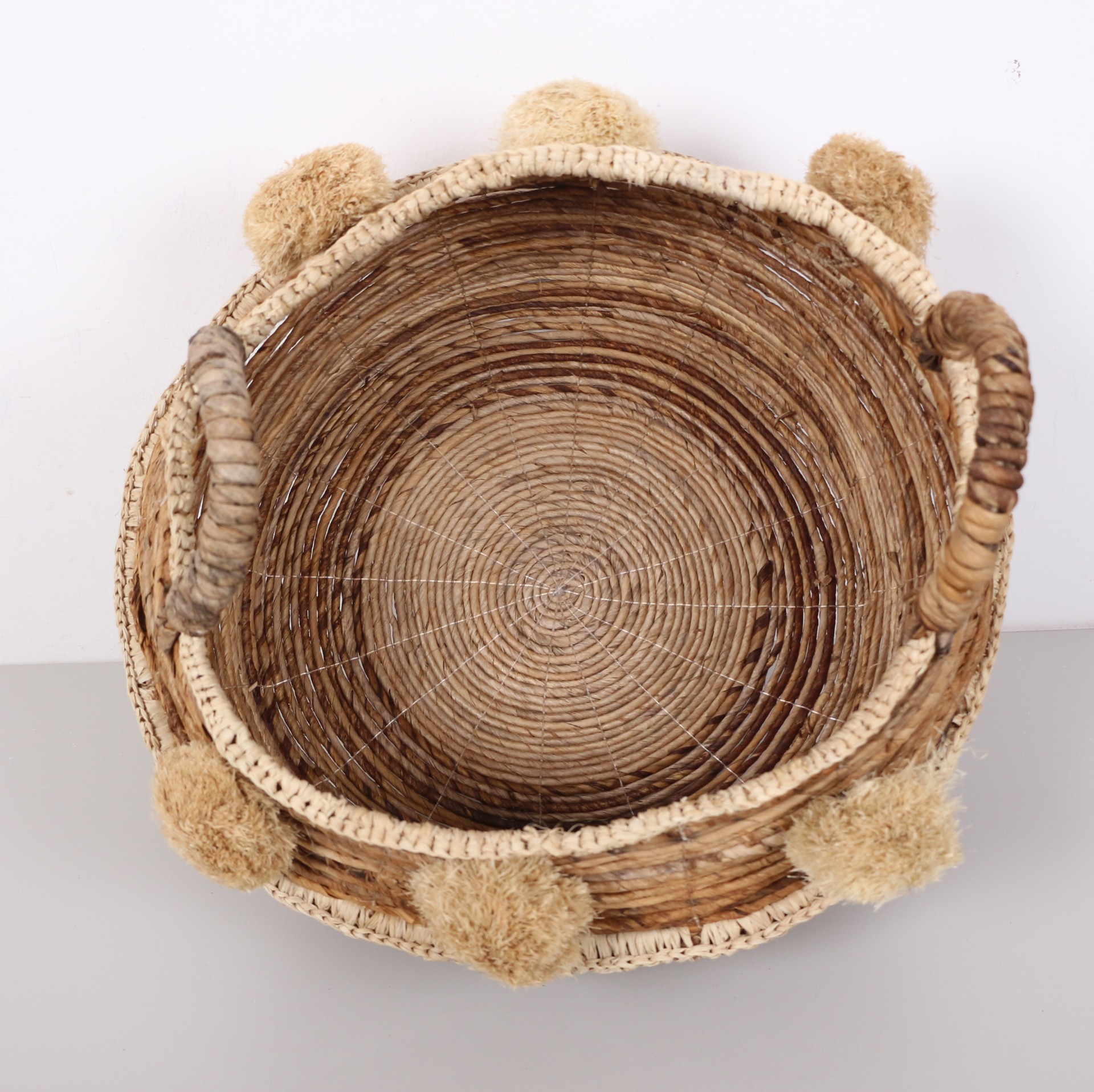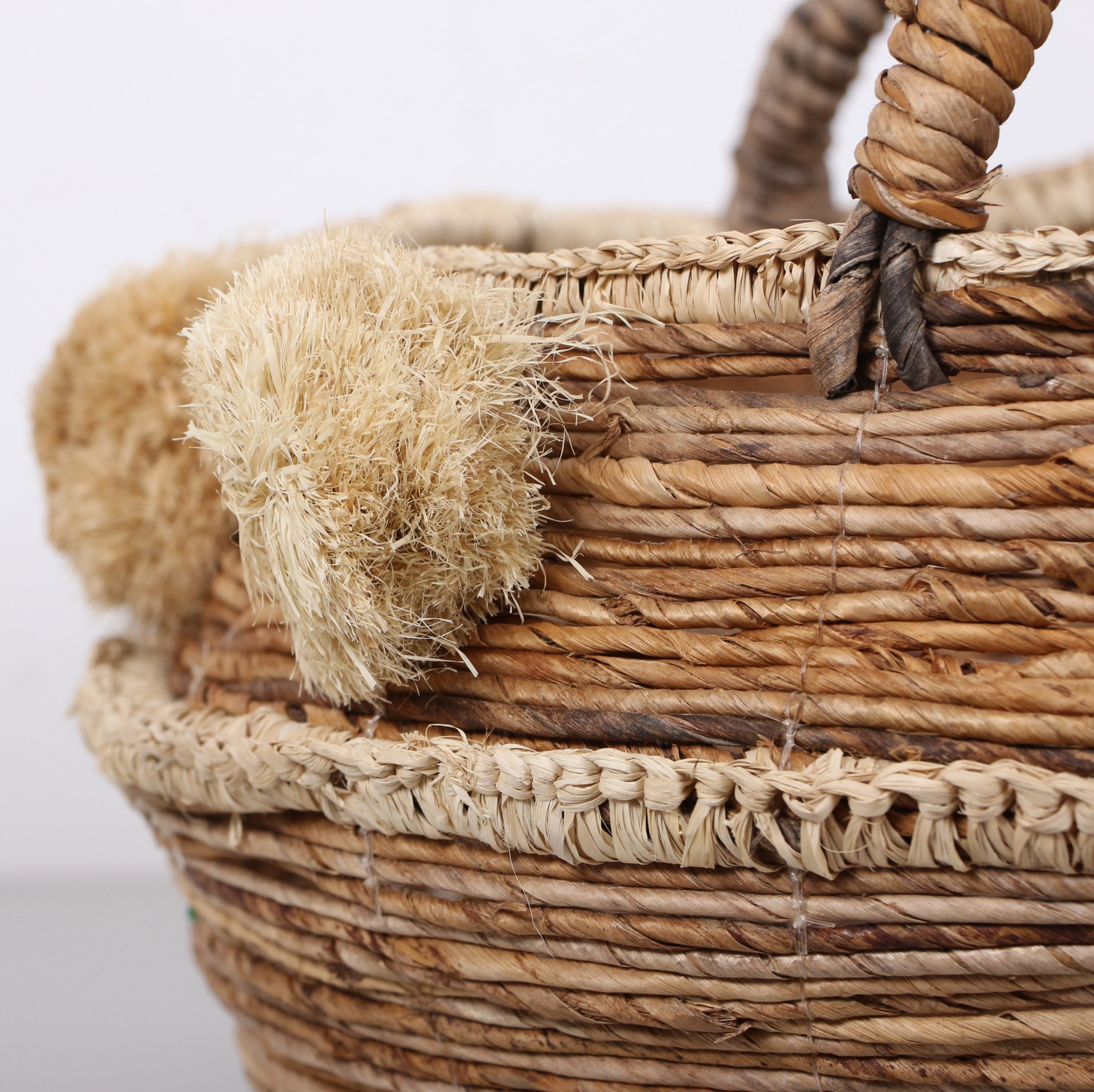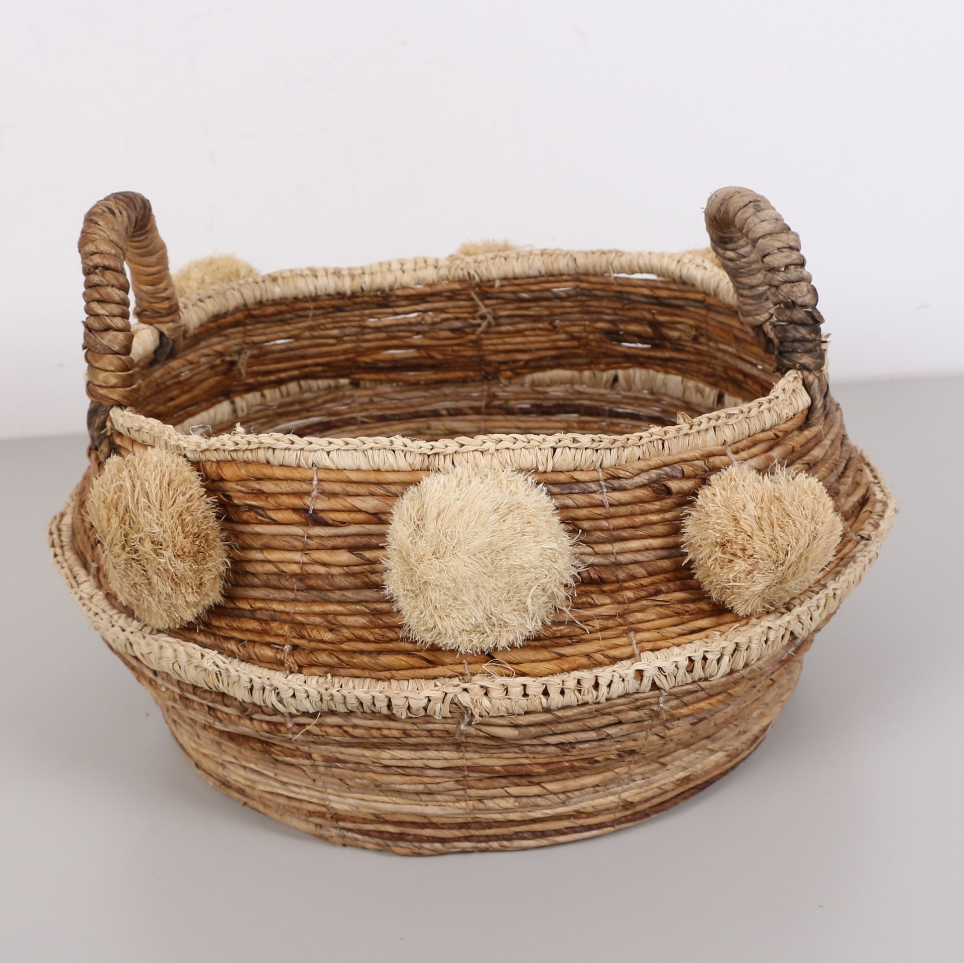 - Ürünümüz Doğal Abaka bitkisi ve kenarlarındaki ponponlar doğal rafya bitkisinden örülmüştür . Abaka bitkisinin yapraklarından örülen bu sepetler sık aralıklarla iple dikildiği için Sert ve Tok bir duruşu sağlanmıştır.
