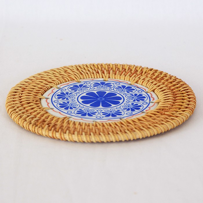 Rattan Çerçeveli 20 cm. Mavi Çiçekler Desenli Dekoratif Obje & Nihale