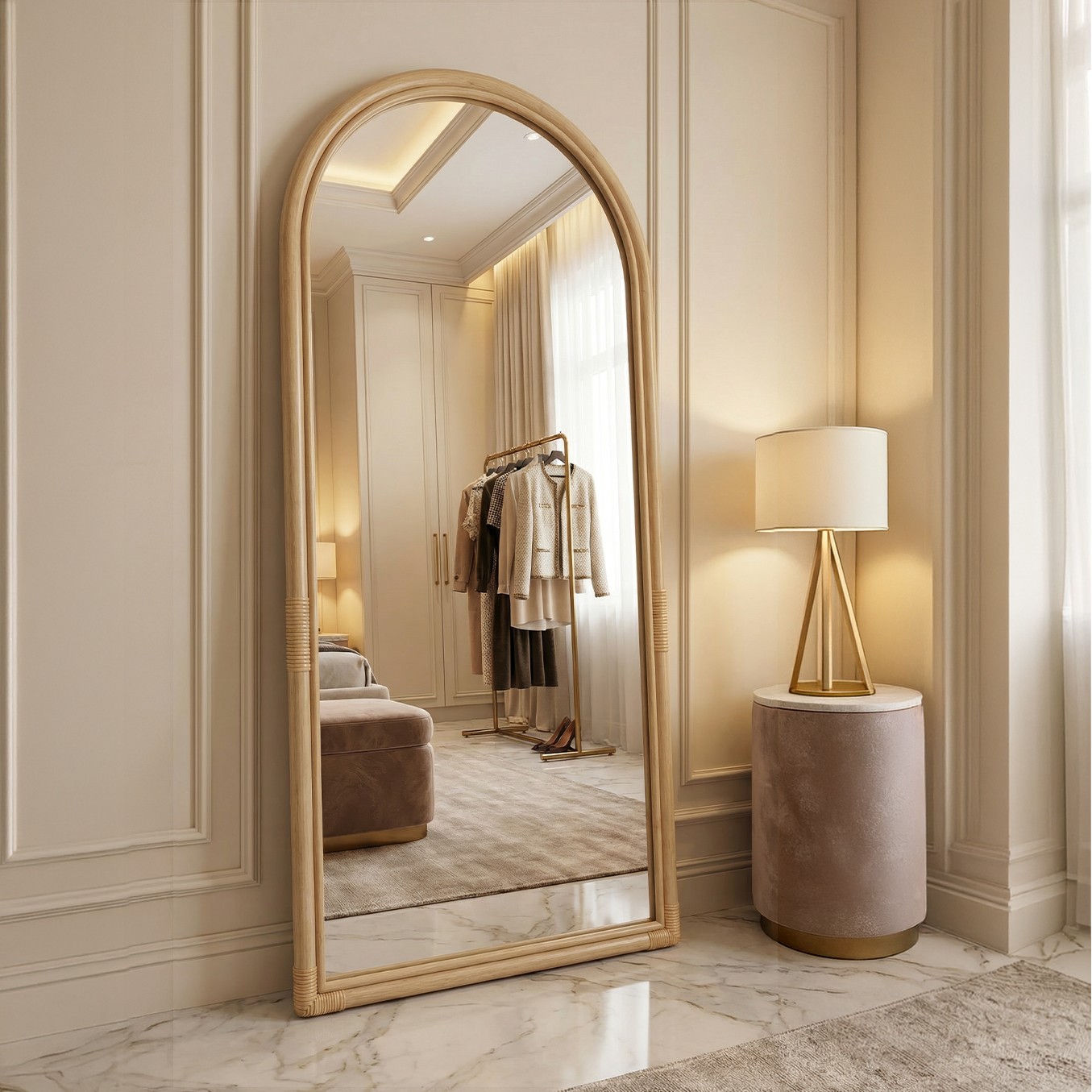 Mimari estetiğin en zarif detaylarından biri olan kemer formu, Della Açık Renek Doğal Rattan Boy Aynası ile yaşam alanlarına taşınıyor. Üst kısmı yumuşak bir kemer çizgisiyle tamamlanan bu tasarım, klasik zarafeti modern minimalizm ile buluşturur.