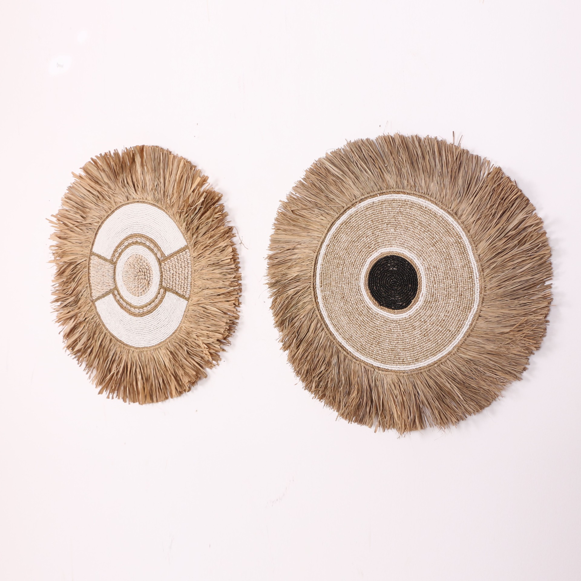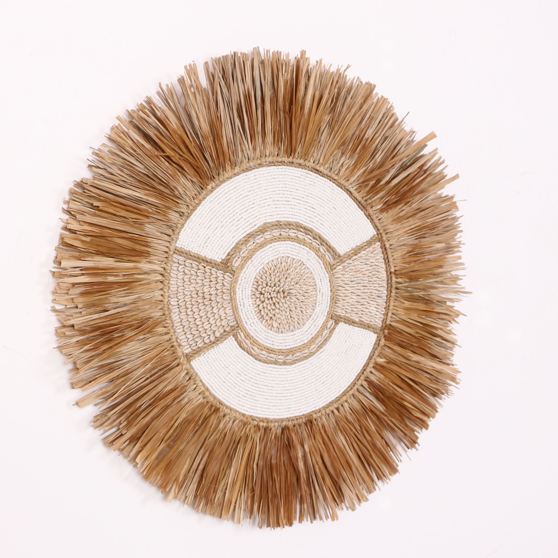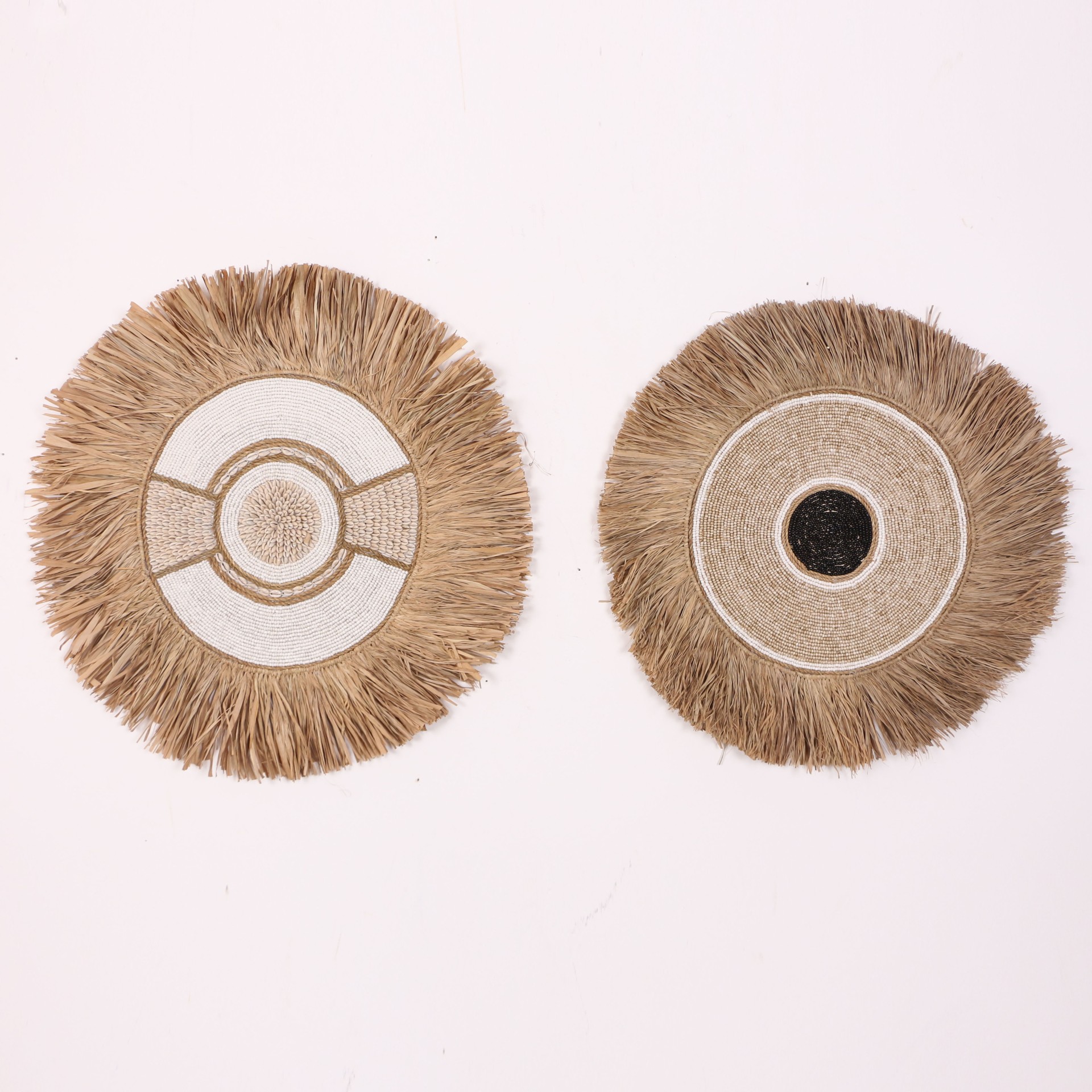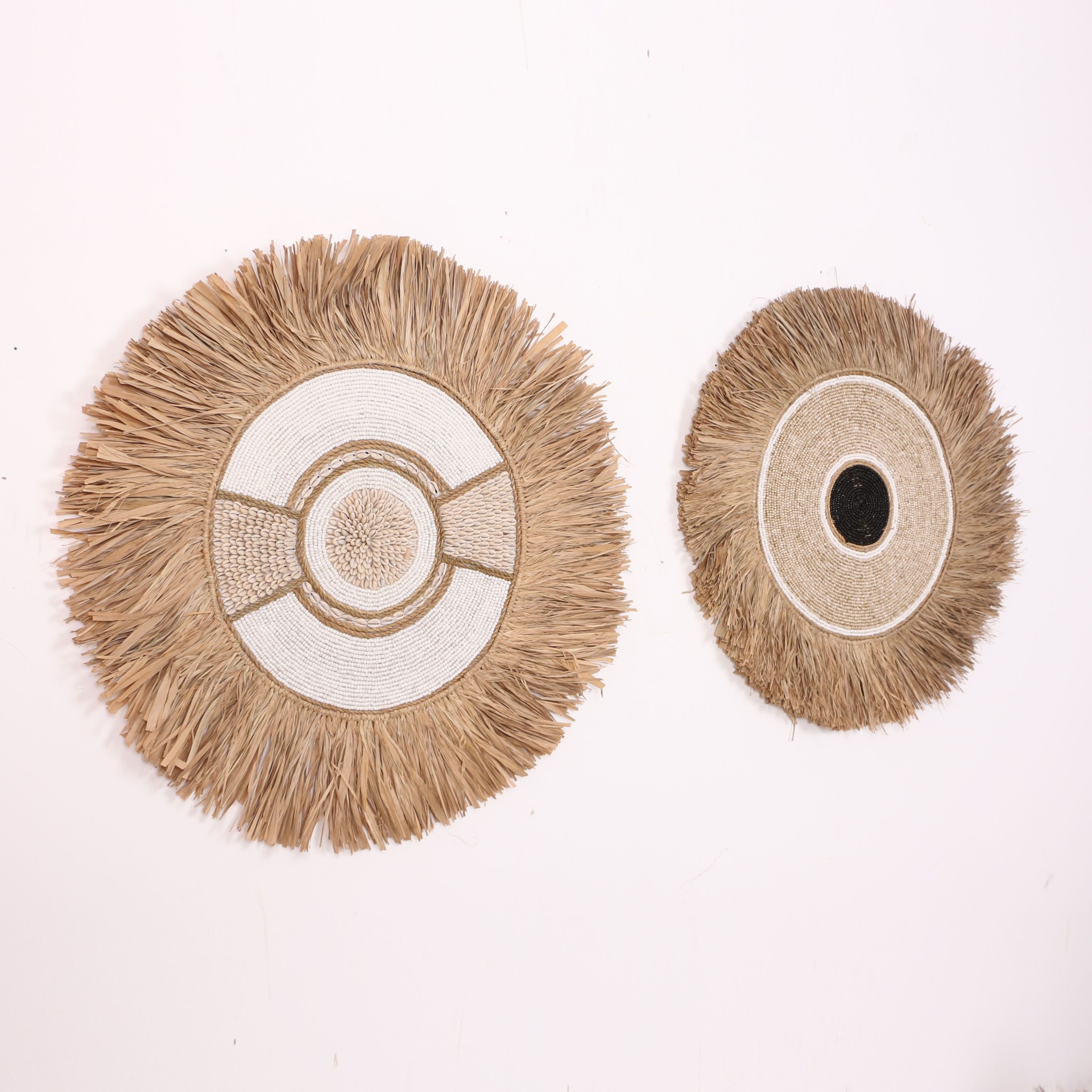 - Tamamı el işçiliği ile Doğal Rafya, Cam boncuklardan ve Deniz Kabuklularından yapılan ürünümüzün; arkası kumaş kaplı ince mdf üzerine yapılmıştır. El işçiliği olduğu için her biri eşsizdir.