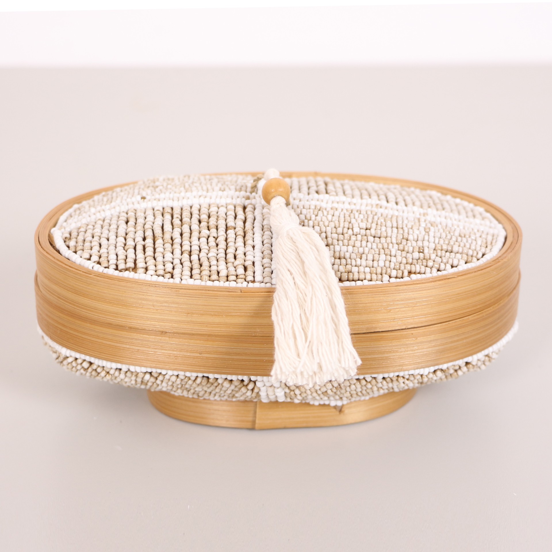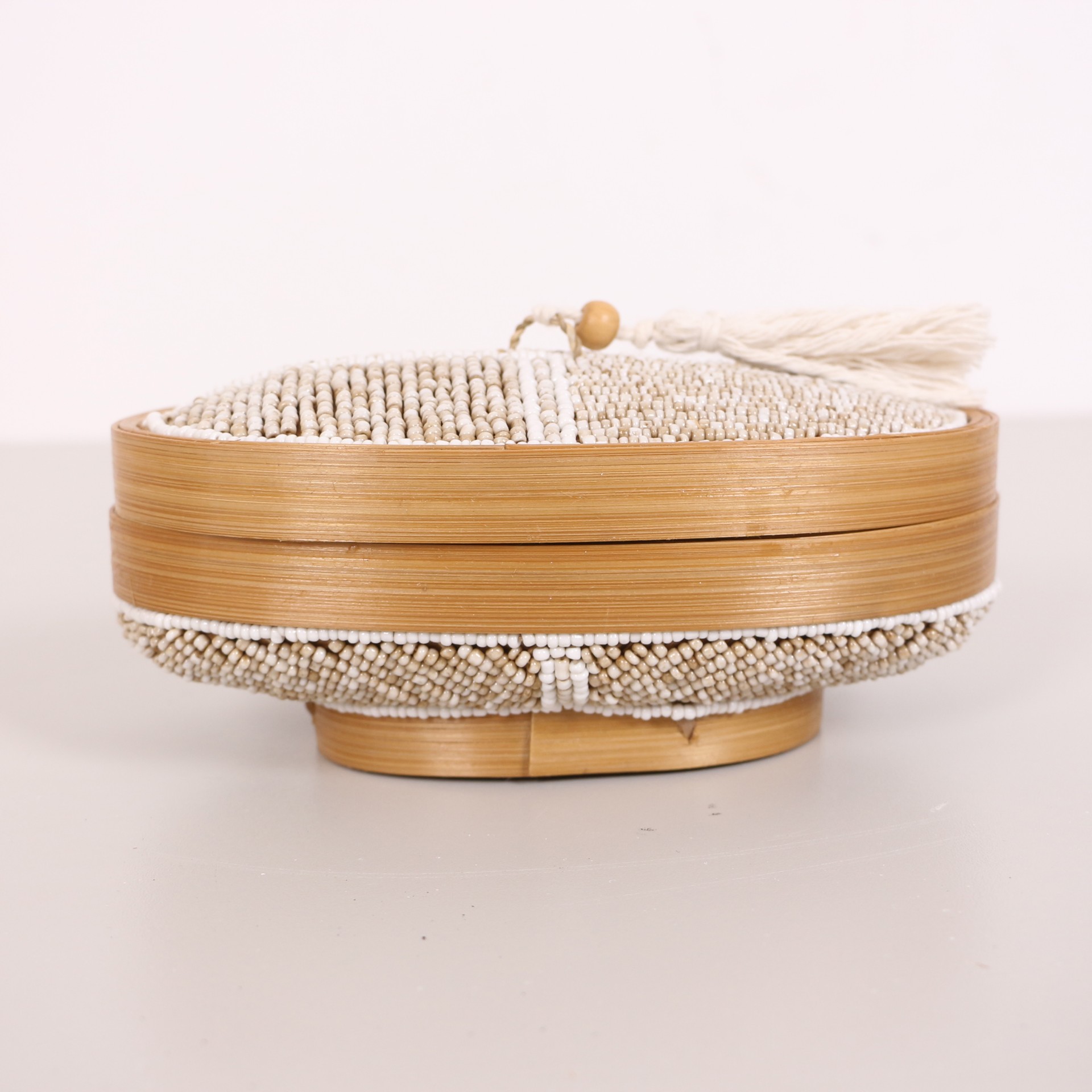 - Doğal Bambunun dış kabuğundan el işçiliği ile örülmüştür. Minik Cam boncuklarla farklı desen ve renklerde bambu kutunun üzerinde el işçiliği ile dekor verilerek, kapak kısmında püskülle tamamlanmıştır.