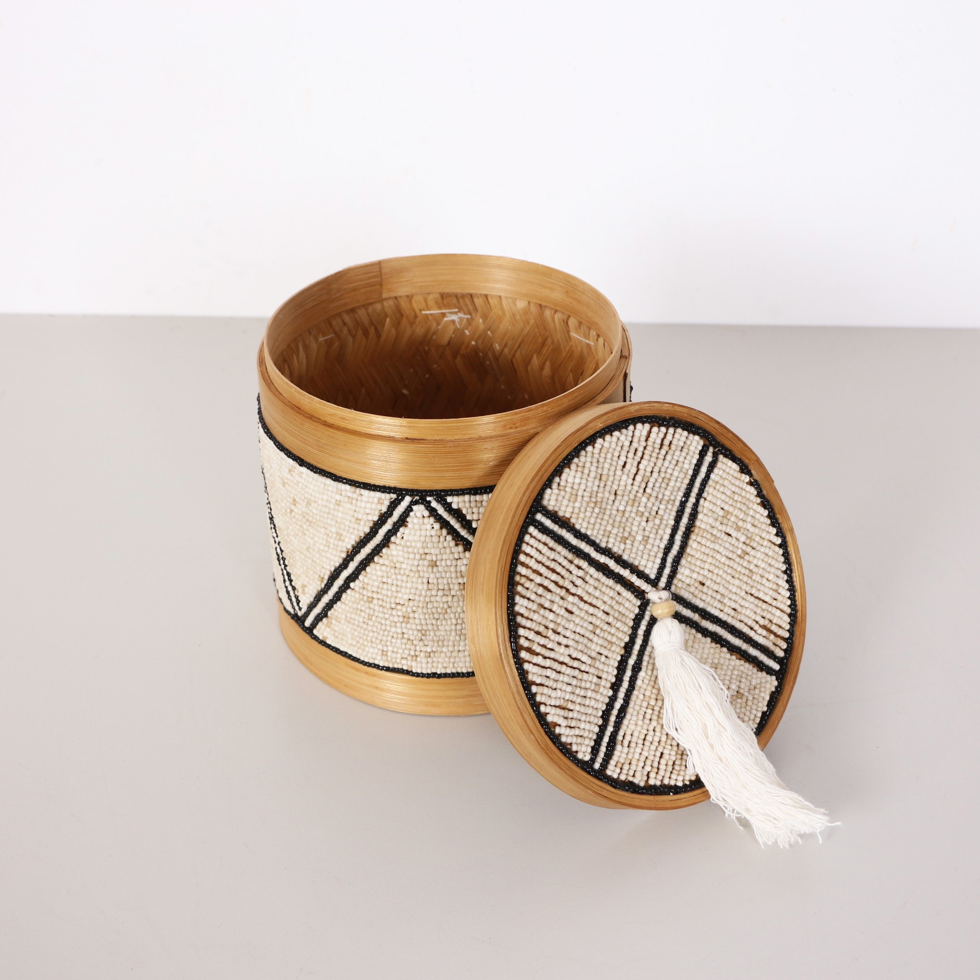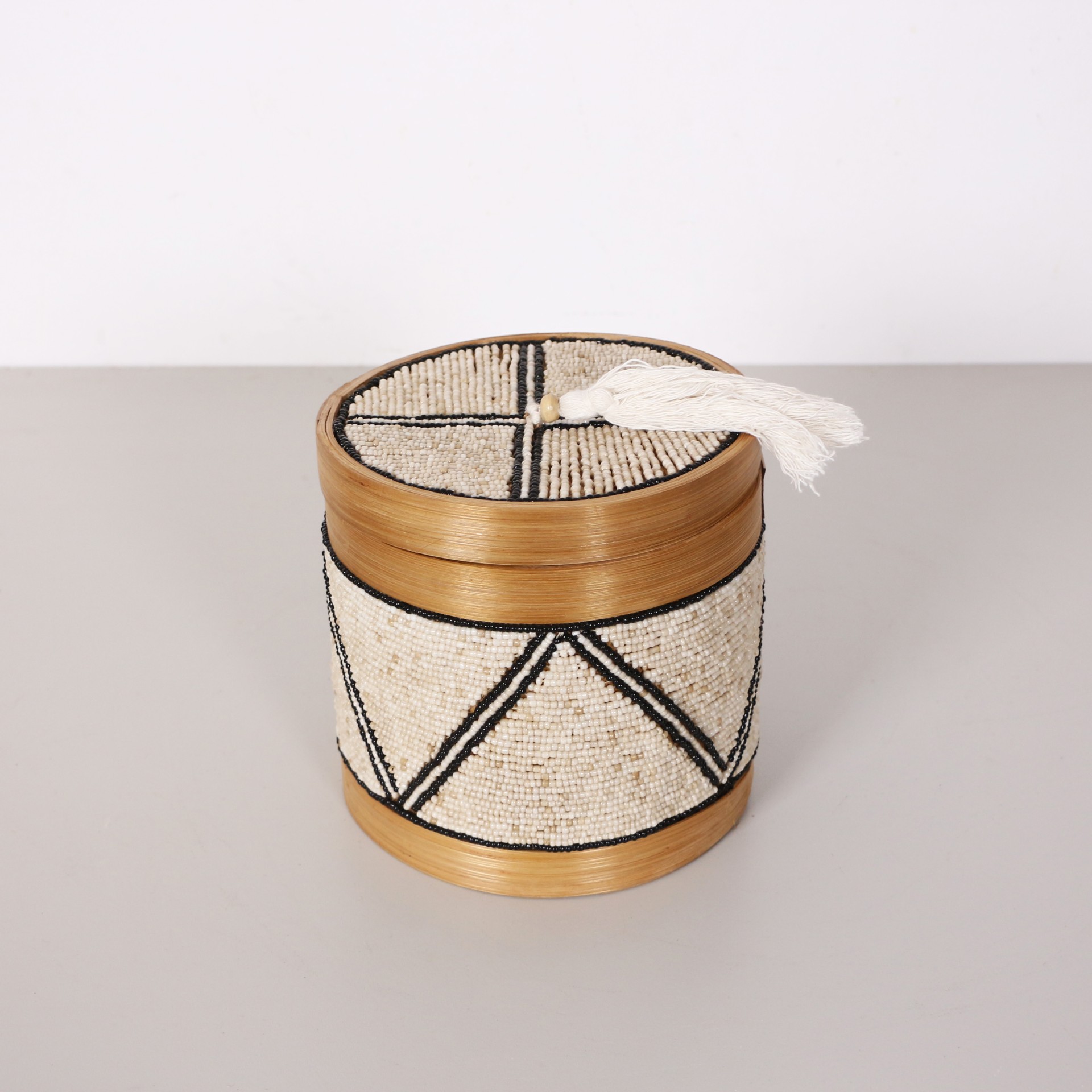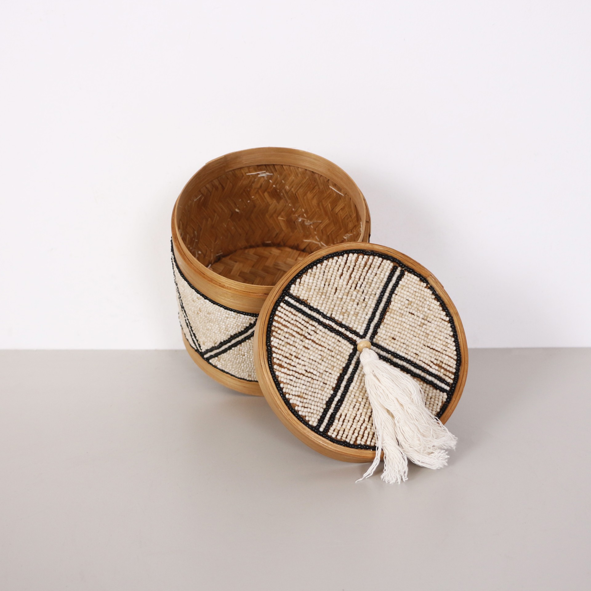 - Doğal Bambunun dış kabuğundan el işçiliği ile örülmüştür. Minik Cam boncuklarla farklı desen ve renklerde bambu kutunun üzerinde el işçiliği ile dekor verilerek, kapak kısmında püskülle tamamlanmıştır.