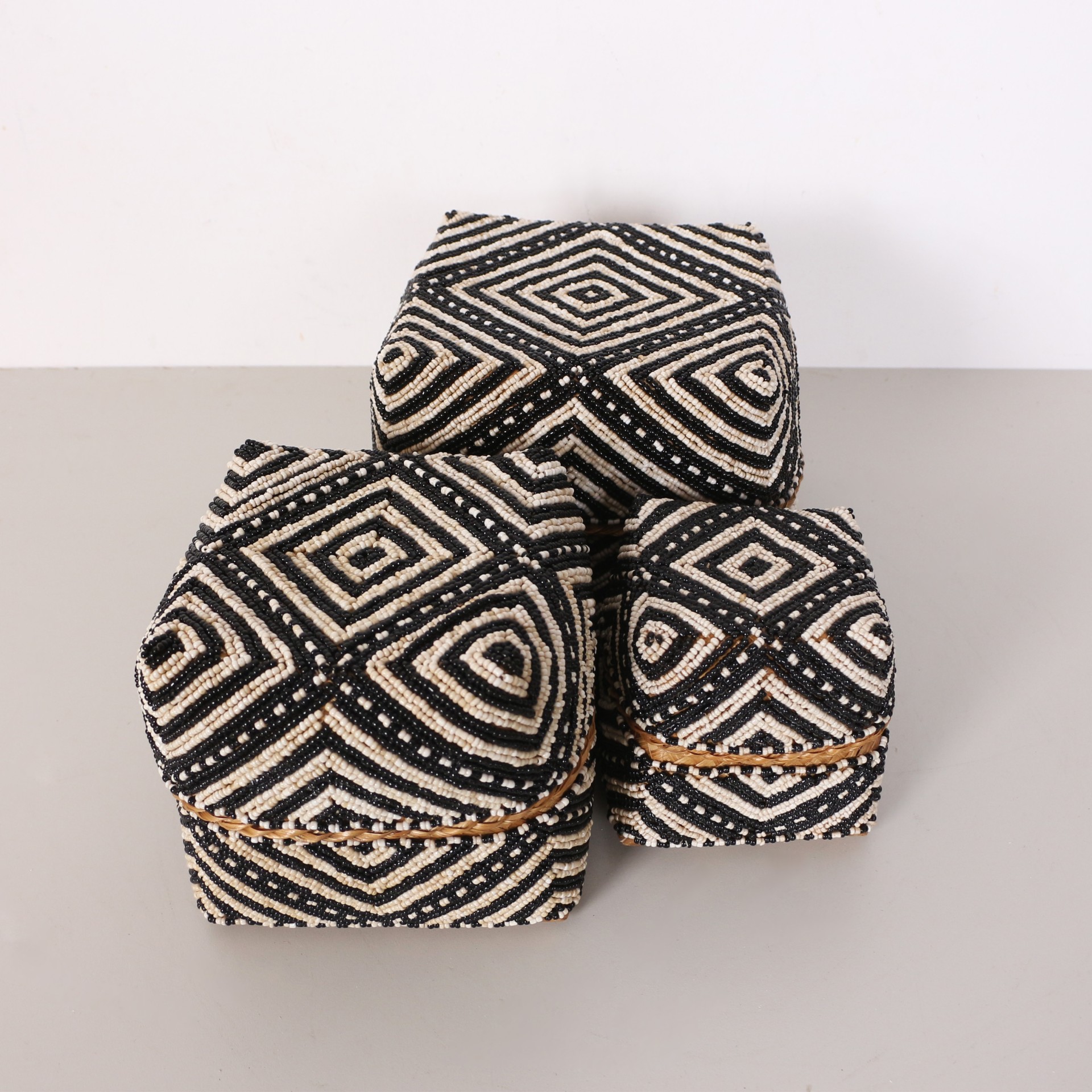 - Doğal Bambunun dış kabuğundan el işçiliği ile örülmüştür. Minik Cam boncuklarla farklı desen ve renklerde bambu kutunun üzerinde el işçiliği ile dekor verilerek, kapak kısmında püskülle tamamlanmıştır.