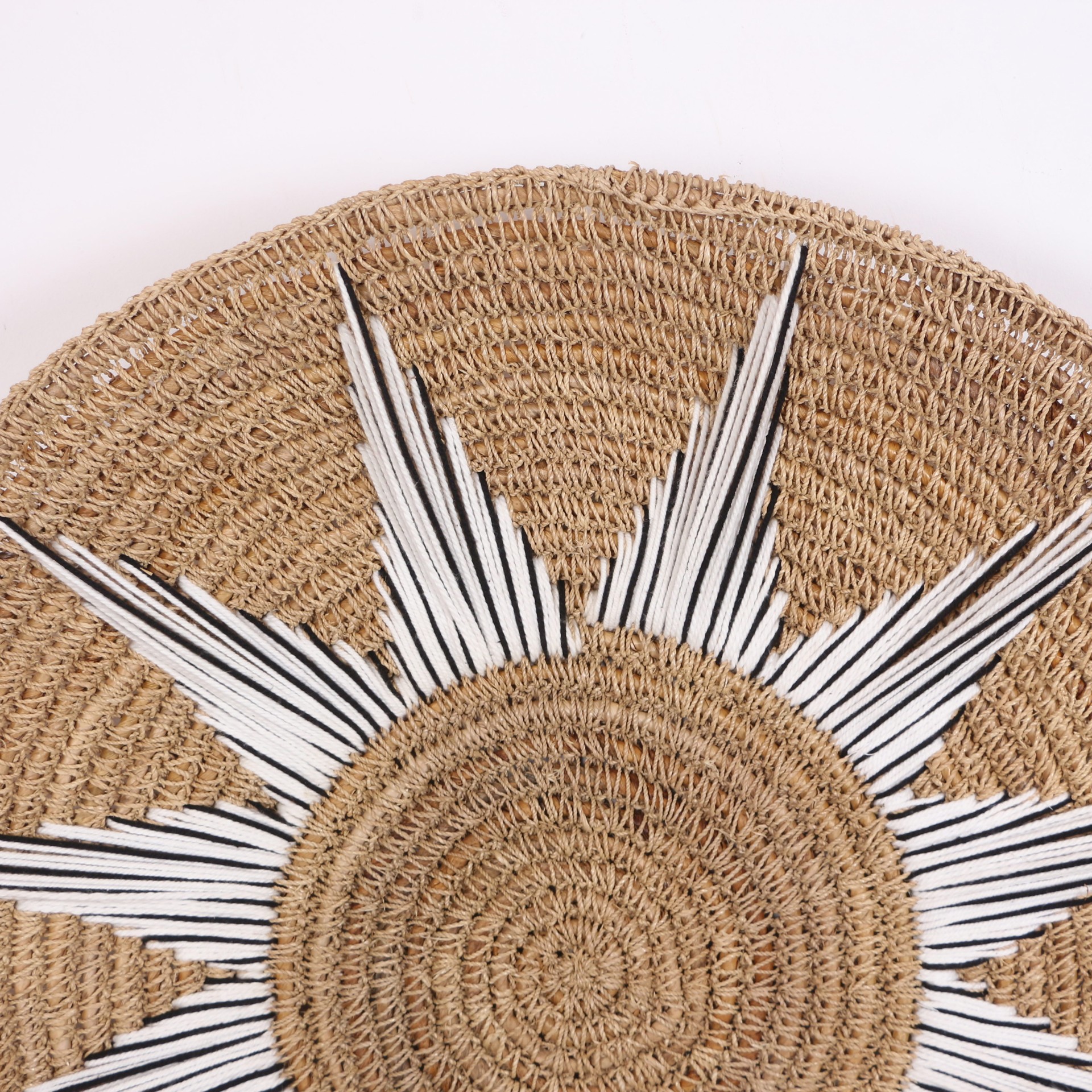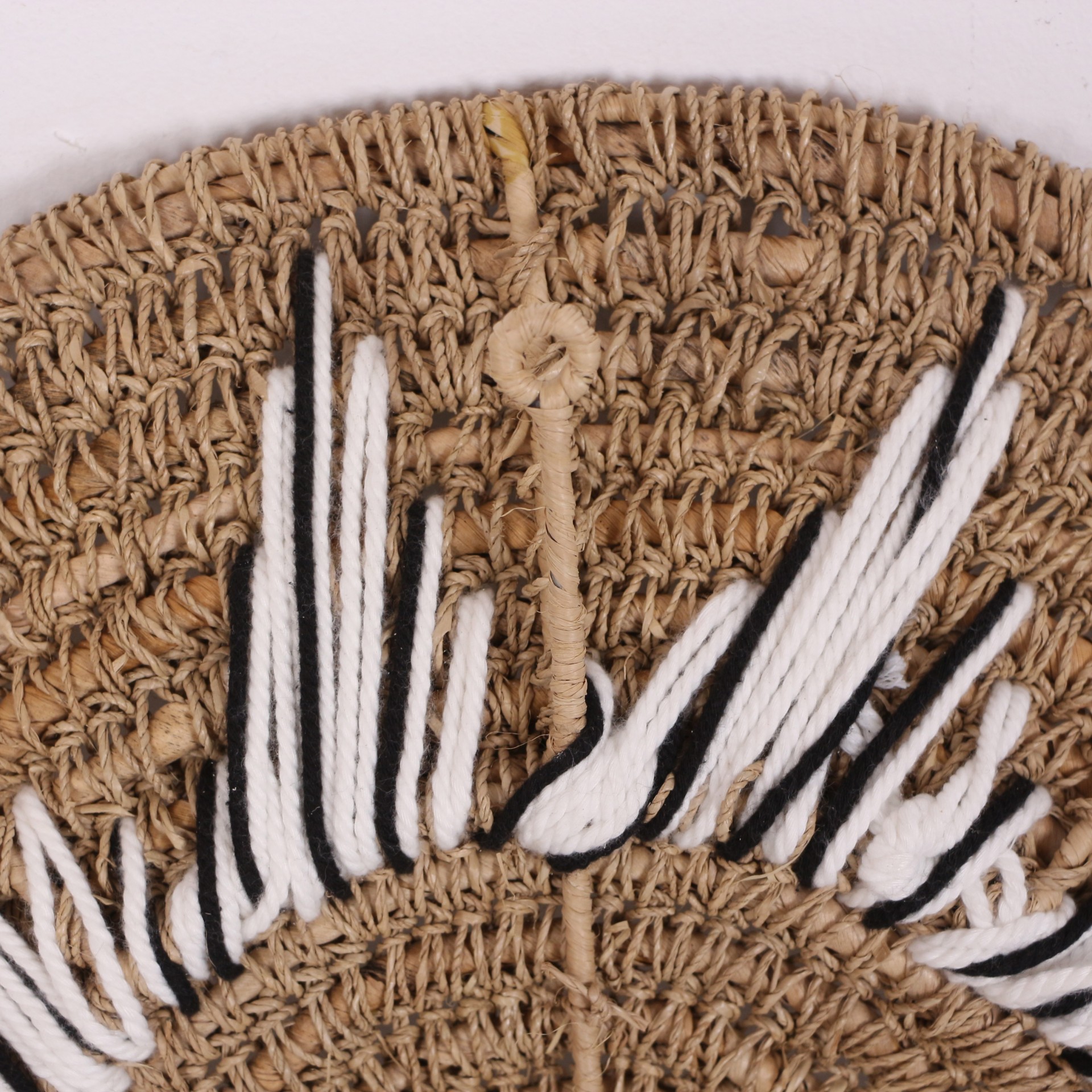 - Ürünümüzün tamamı doğal rafya bitkisinden zanaatkar ustalarımızca, yine rafya sarılı tabak şeklinde tel kafes üzerine pamuk ipliği ile desen verilerek el işçiliği ile üretilmiştir. Arkasında tel kafese sabit metal askılık ürünün duvarda daha belirgin ve tok durmasını sağlamıştır.