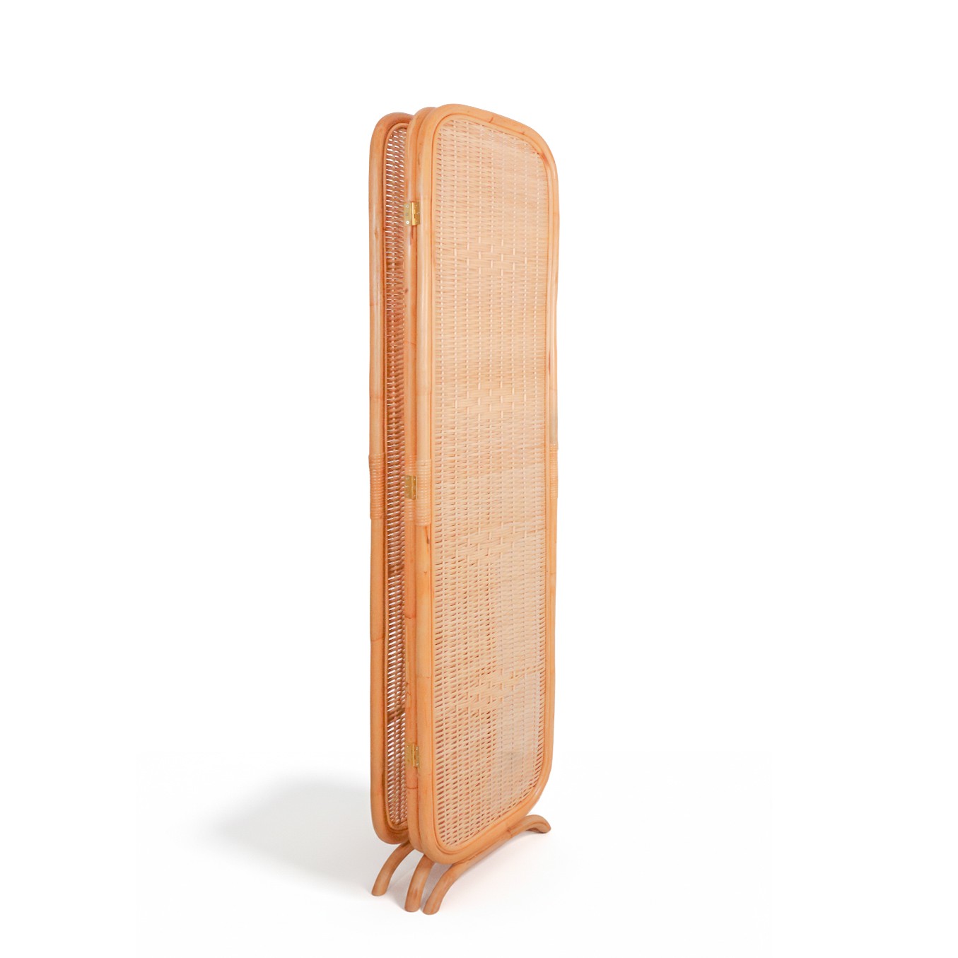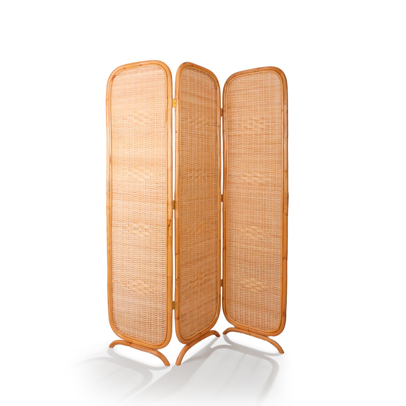 Yüzeyinde kullanılan sık ve el örgüsü doğal rattan malzeme, mahremiyeti sağlarken, mekana sıcak bir bal tonu ve organik bir doku kazandırır. 3 adet katlanabilir kanat yapısı sayesinde, alanları esnek bir şekilde bölme, gizlilik sağlama veya sadece dekoratif bir arka plan oluşturma imkanı tanır. El işçiliğiyle şekillendirilmiş her bir parça, kendine özgü doğal bir karaktere sahiptir. Salon, yatak odası veya konsept dekorasyon alanlarında dikkat çekici bir tasarım unsuru haline gelir.