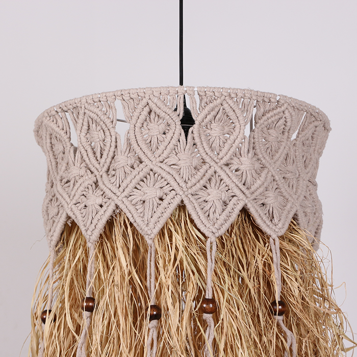 - Statik boyalı tel kafes üzerine makrome ipi, doğal rafya ve ahşap boncuk kullanılarak el işçiliği ile örülmüştür.
