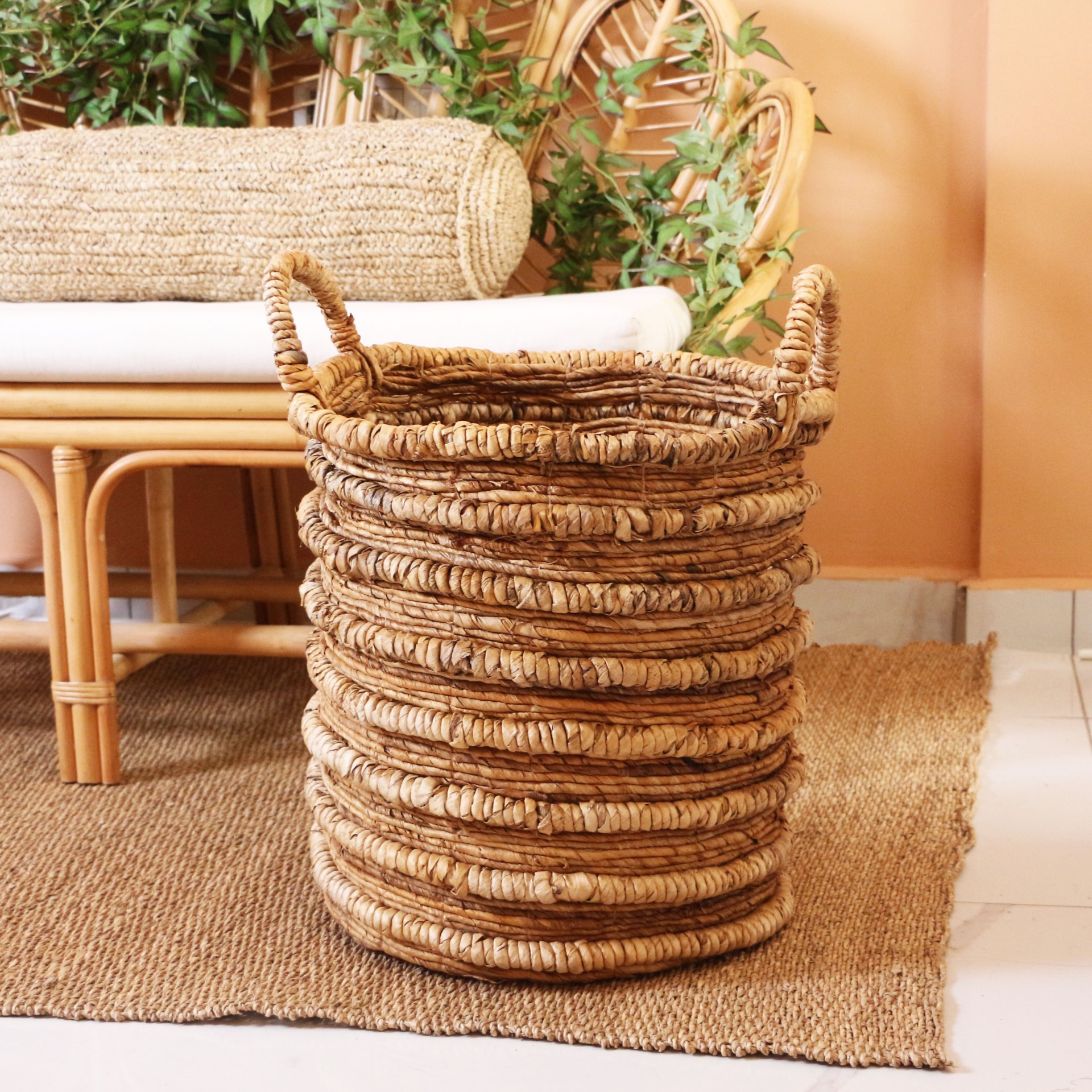 - Doğal Abaka bitkisinin yapraklarından örülen bu sepetlerimiz sağlam ve tok durması için bitkinin dokusuna uygun statik boyalı tel kafes üzerine tamamı el işçiliği ile örülmüştür.