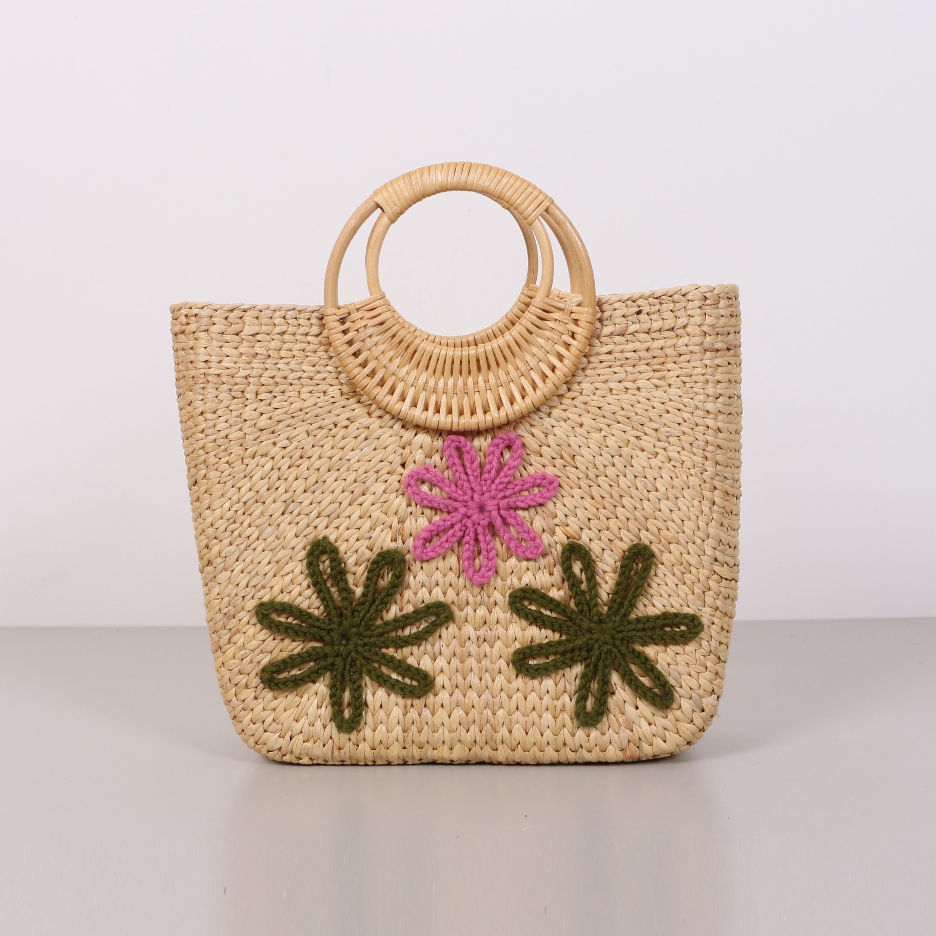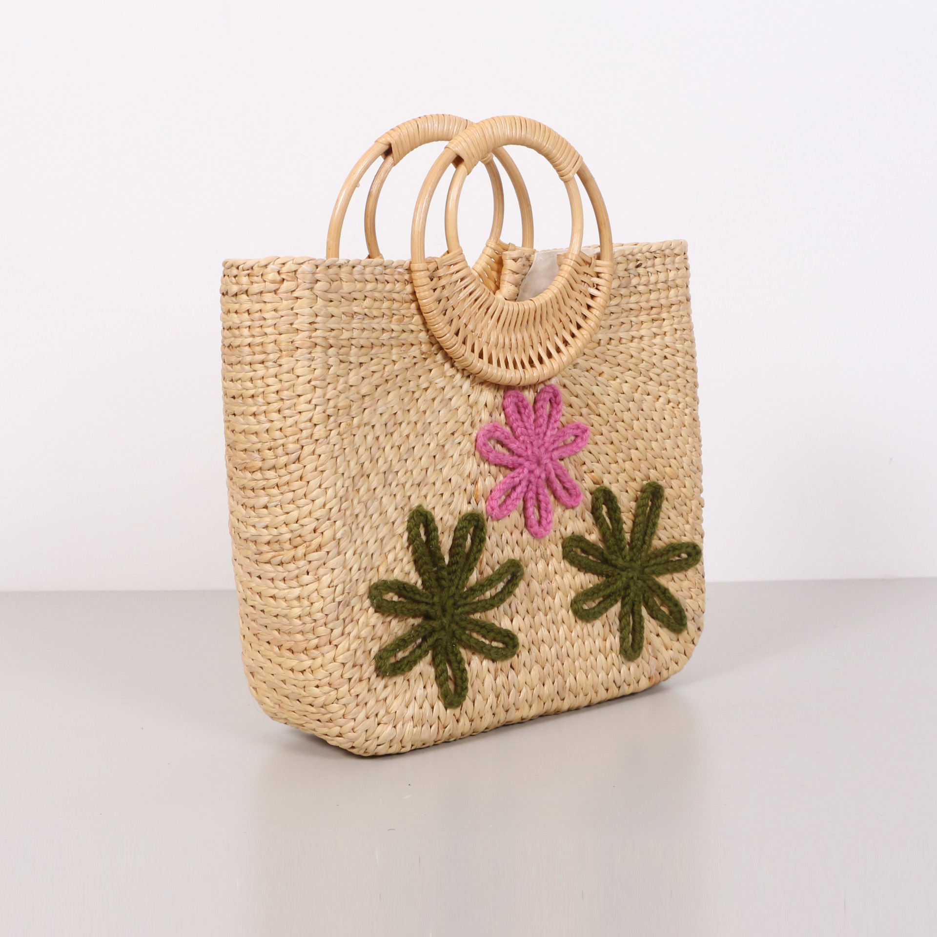 Ürünümüz doğal su sümbülünden tamamı elde üretilmiştir. Ağız kısmı fermuarlı ve keten kumaş ile kaplıdır. Dişbudak ağacından yapılsn sap kısmı rattan ile kaplanarak dekor edilmiştir. Süslemeler pamuk ipliği ile elde örülmüştür.