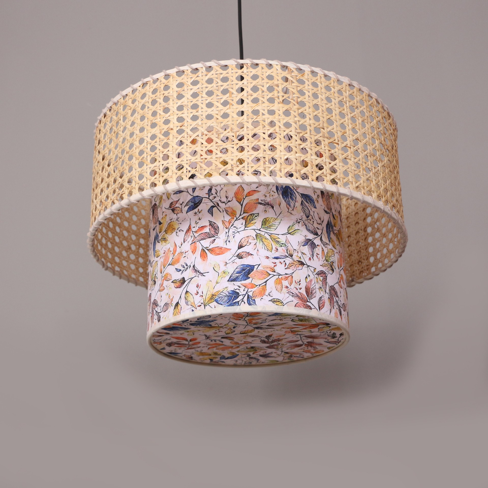 - İmalat Ürünümüz; doğal hazeran malzemeden ve ışık geçirgenliği olan özel baskılı abajur kumaşından, statik boyalı tel üzerine el işçiliği ile üretilmiştir..