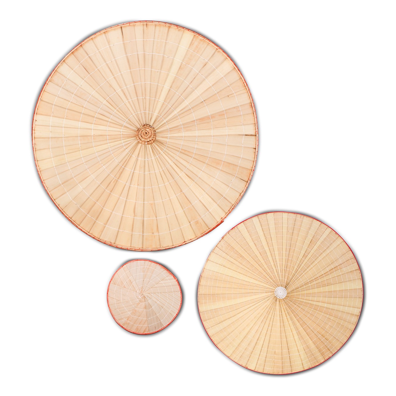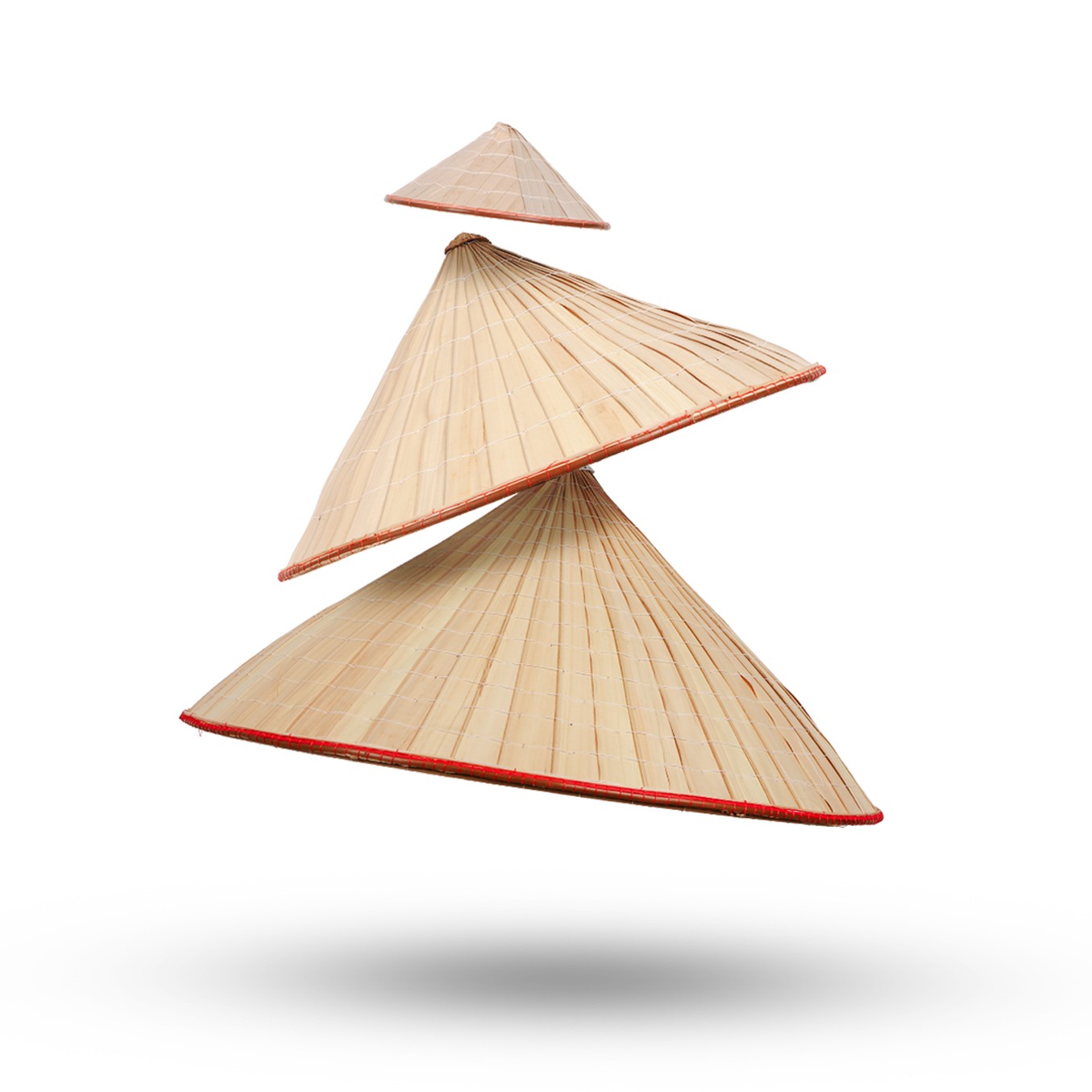 ölçülerine sahip üç adet konik şapkadan oluşuyor. Her biri geleneksel tekniklerle işlenmiş, doğal bambu liflerinin tek tek dokunmasıyla hafif ama dayanıklı bir yapı elde edilmiş.