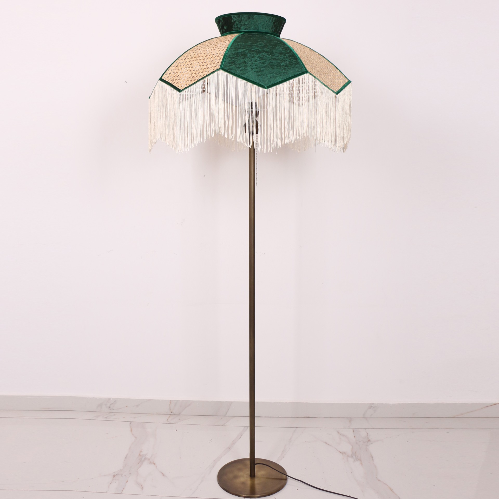 - İmalat Ürünümüz; doğal hazeran malzemeden ve ışık geçirgenliği olan abajur kumaşından statik boyalı tel üzerine el işçiliği ile üretilmiştir. İmalat ürünümüzde, bütün detaylar düşünülerek saçak, kadife biyeler, sutaşı ve özel ipler kullanılmıştır