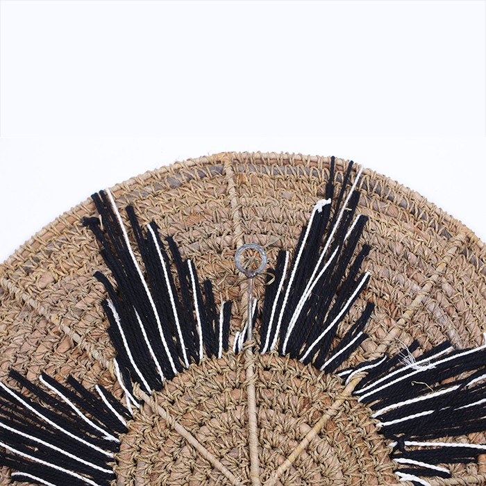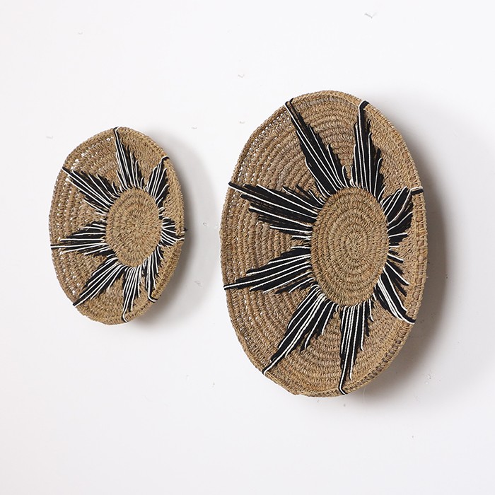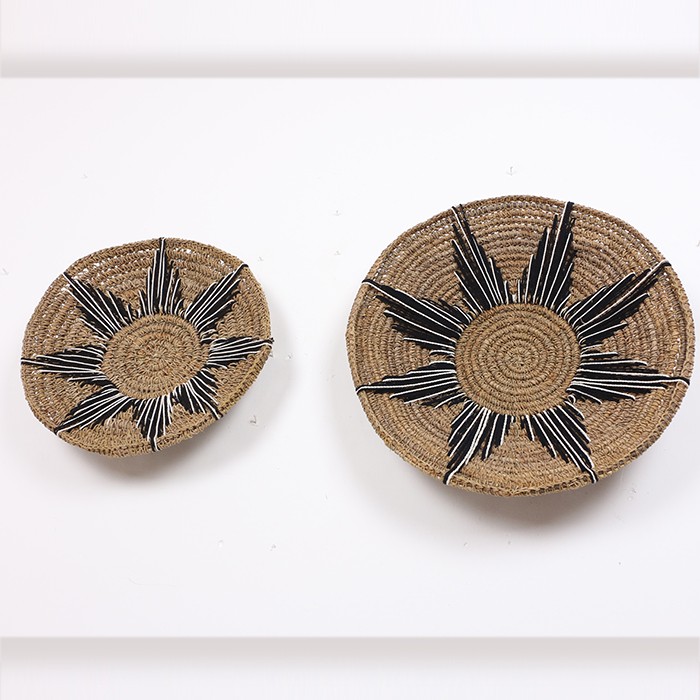 - Ürünümüzün tamamı doğal rafya bitkisinden zanaatkar ustalarımızca, yine rafya sarılı tabak şeklinde demir kafes, üzerine pamuk ipliği ile desen verilerek el işçiliği ile üretilmiştir. Arkasında demir gövdeye sabit metal askılık ürünün duvarda daha belirgin ve tok durmasını sağlamıştır.