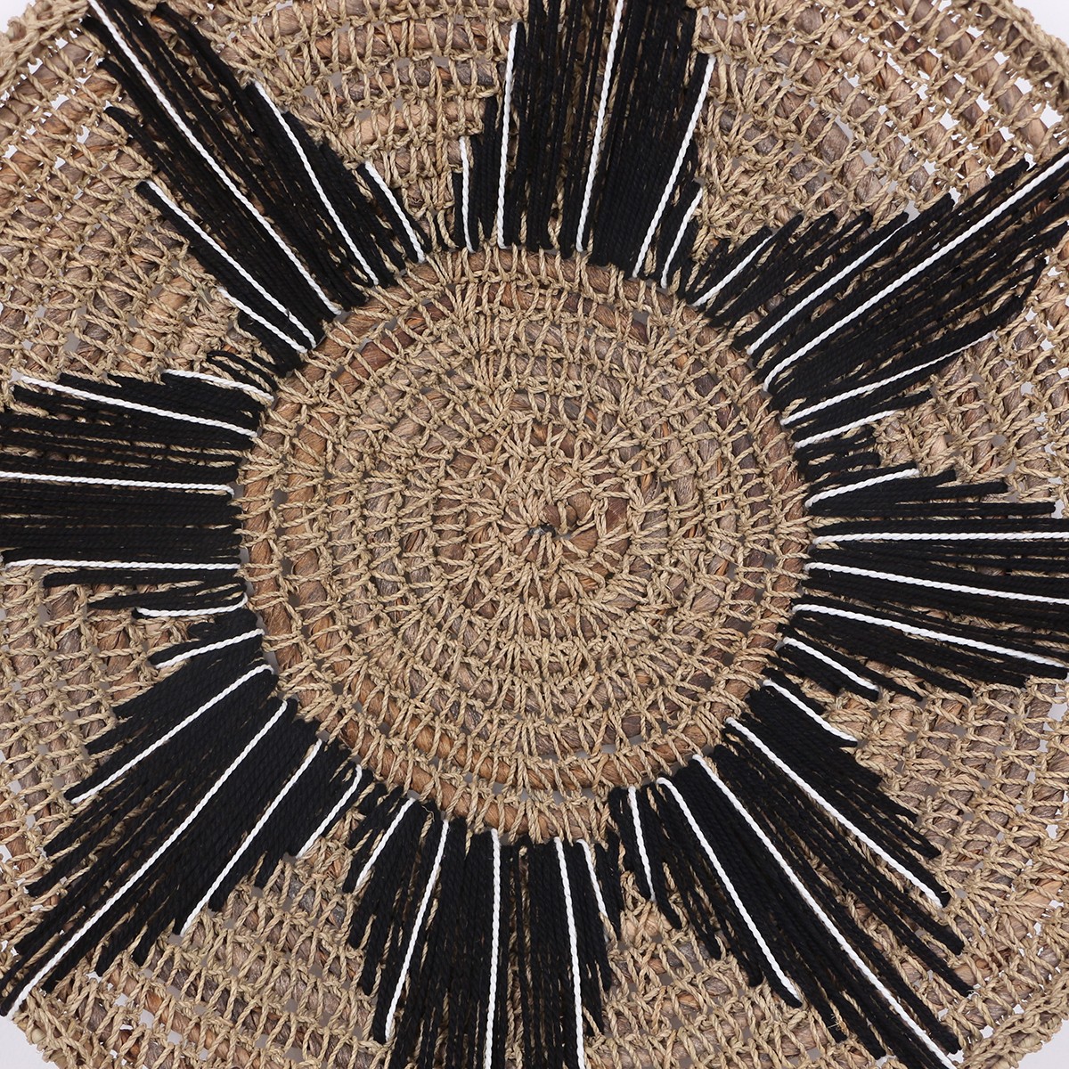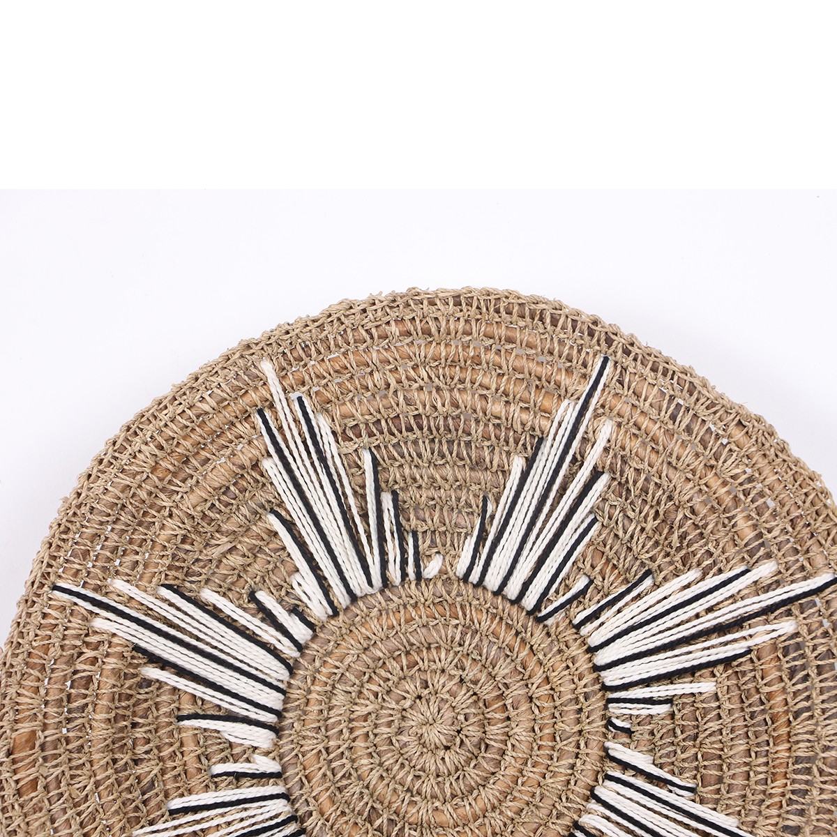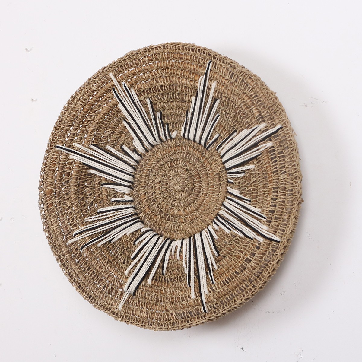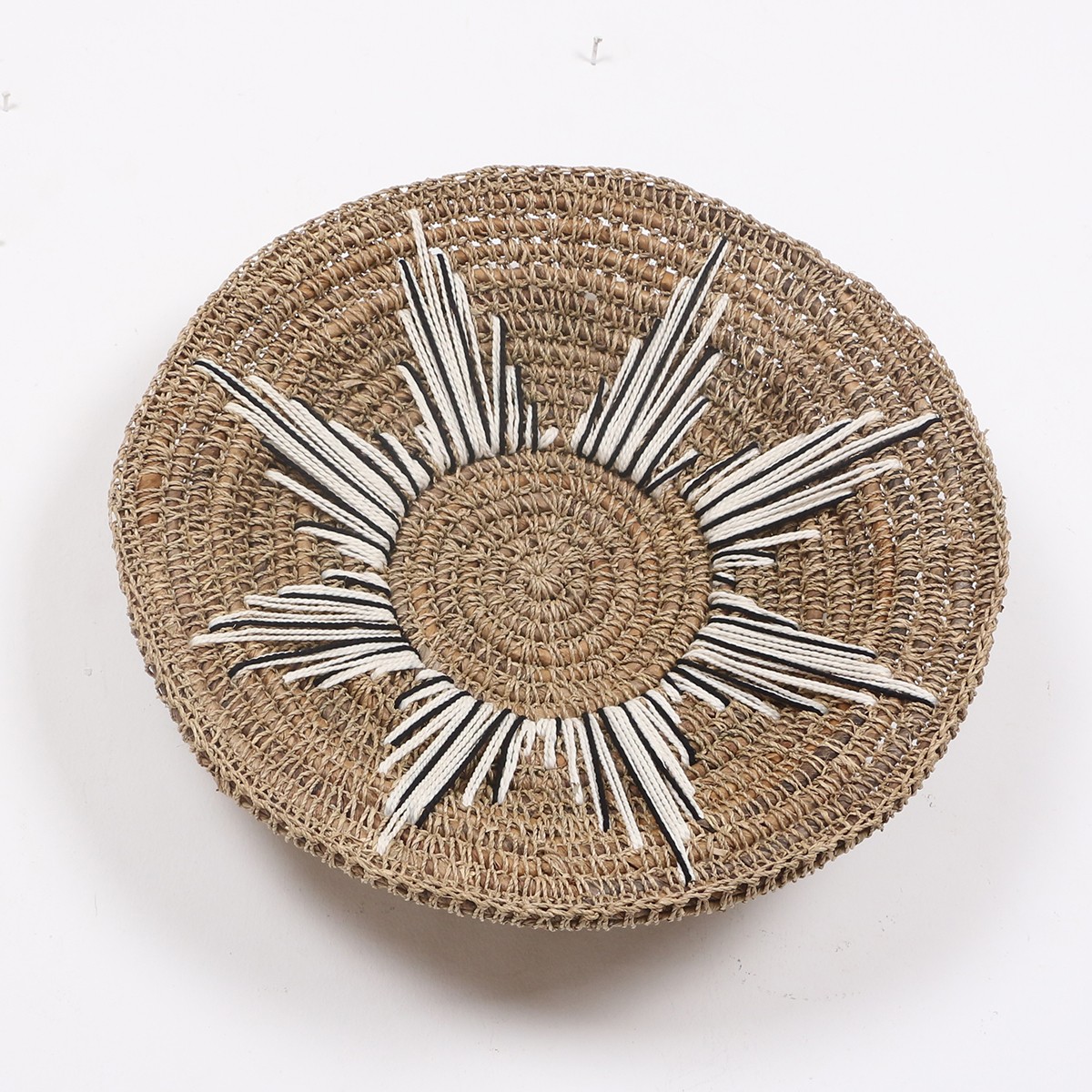 - Ürünümüzün tamamı doğal rafya bitkisinden zanaatkar ustalarımızca, yine rafya sarılı tabak şeklinde statik boyalı demir tel kafes üzerine pamuk ipliği ile desen verilerek el işçiliği ile üretilmiştir. Arkasında demir gövdeye sabit metal askılık ürünün duvarda daha belirgin ve tok durmasını sağlamıştır.