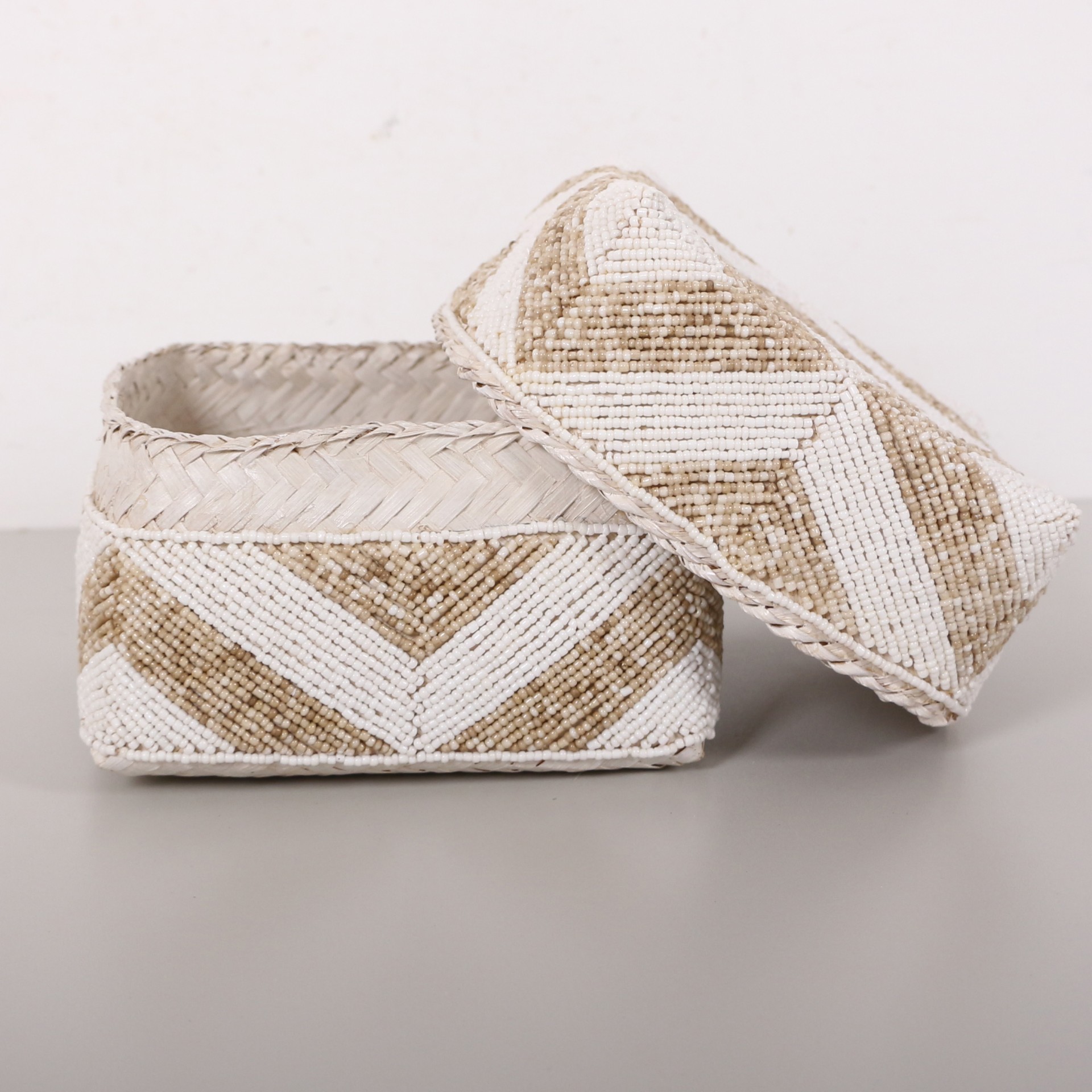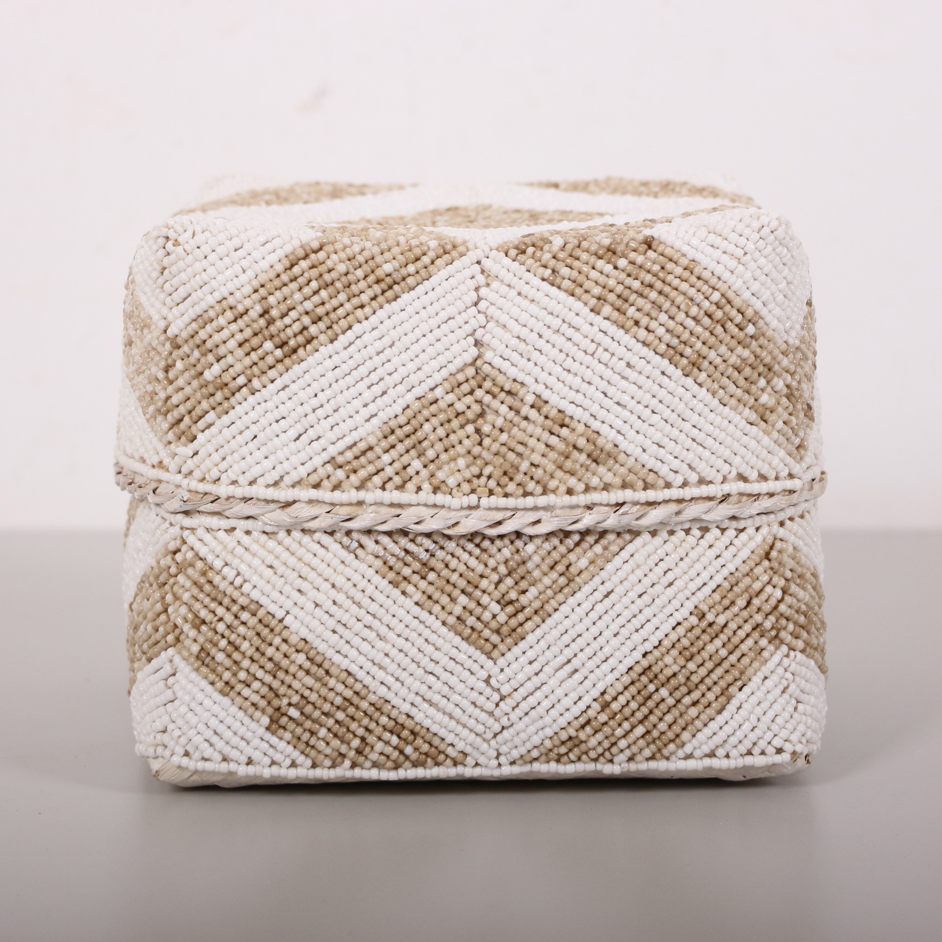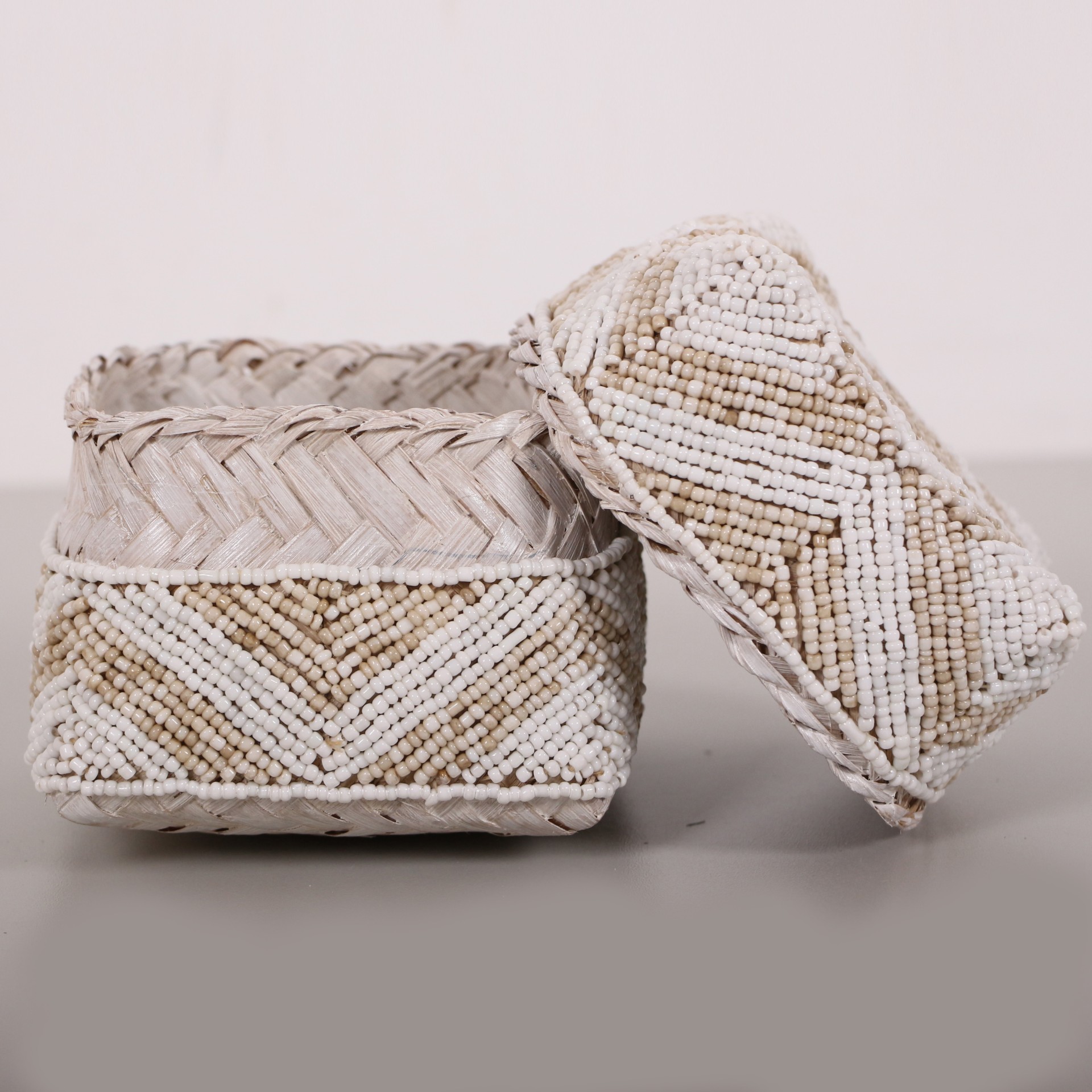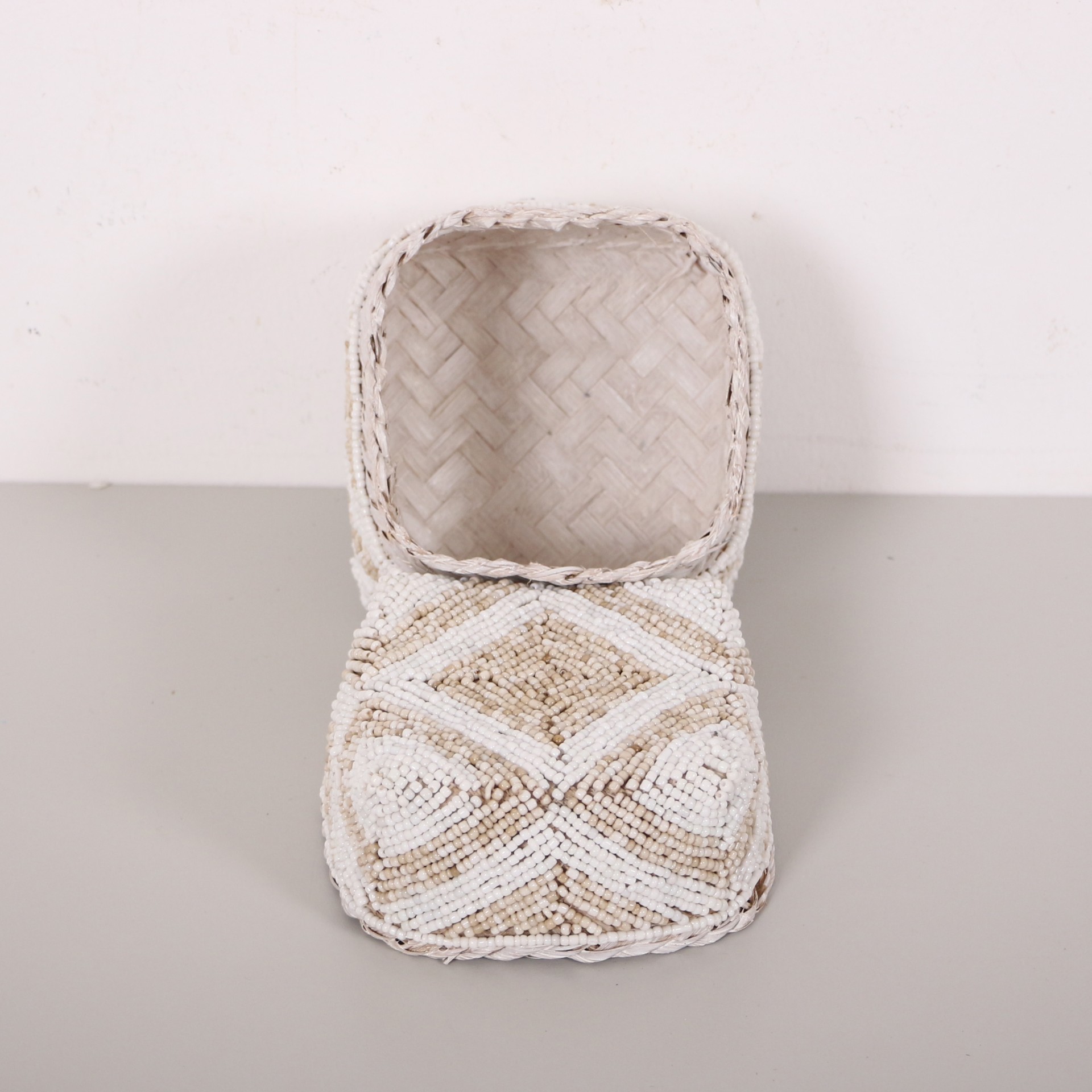 - Doğal Bambunun dış kabuğundan el işçiliği ile örülmüştür. Minik Cam boncuklarla farklı desen ve renklerde bambu kutunun üzerinde el işçiliği ile dekor verilerek, kapak kısmında püskülle tamamlanmıştır.
