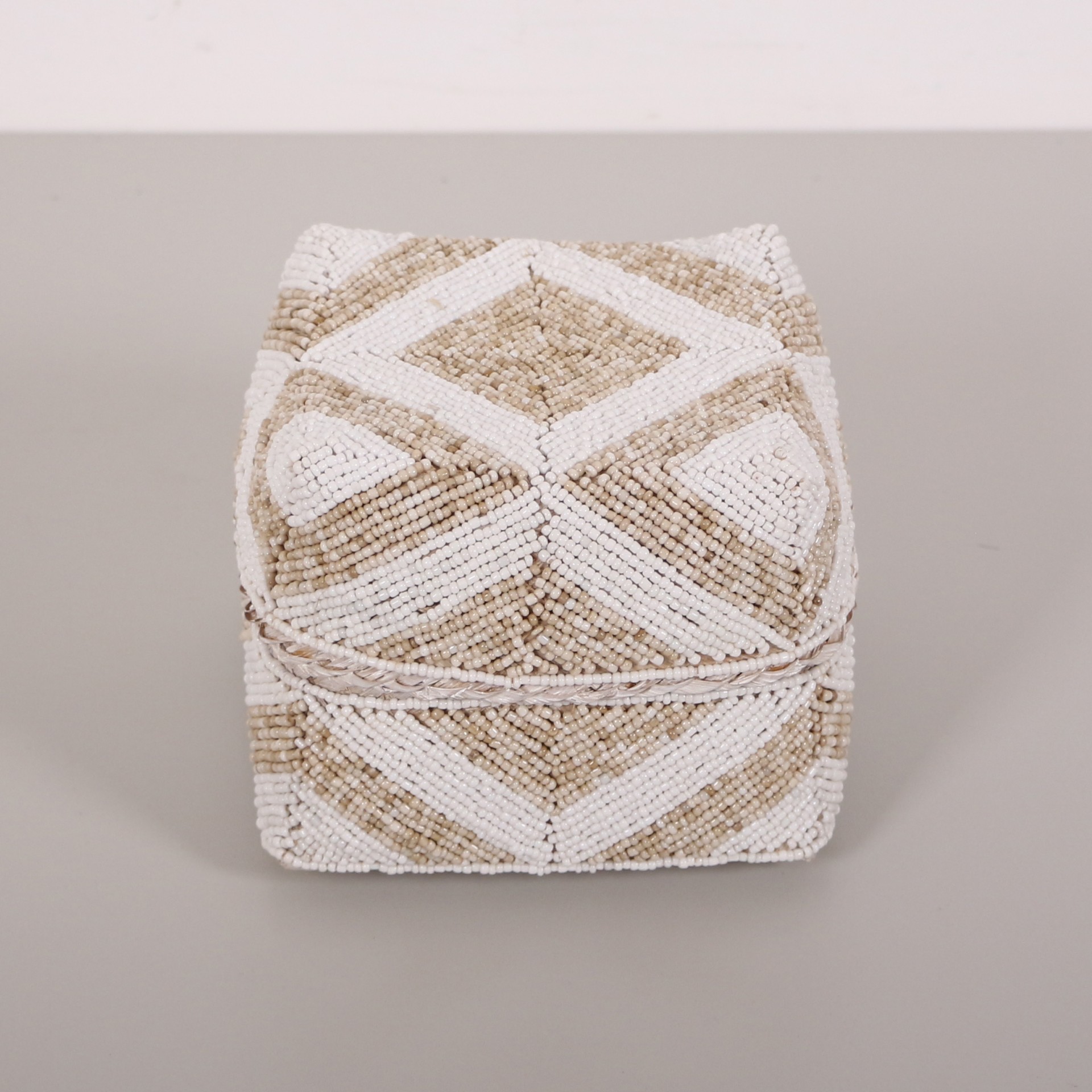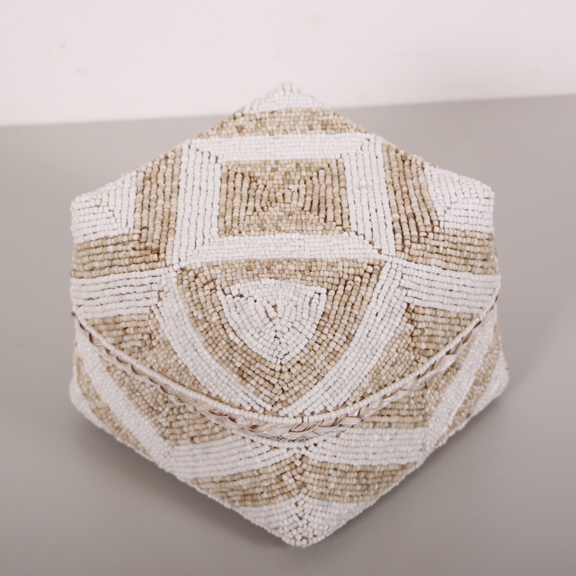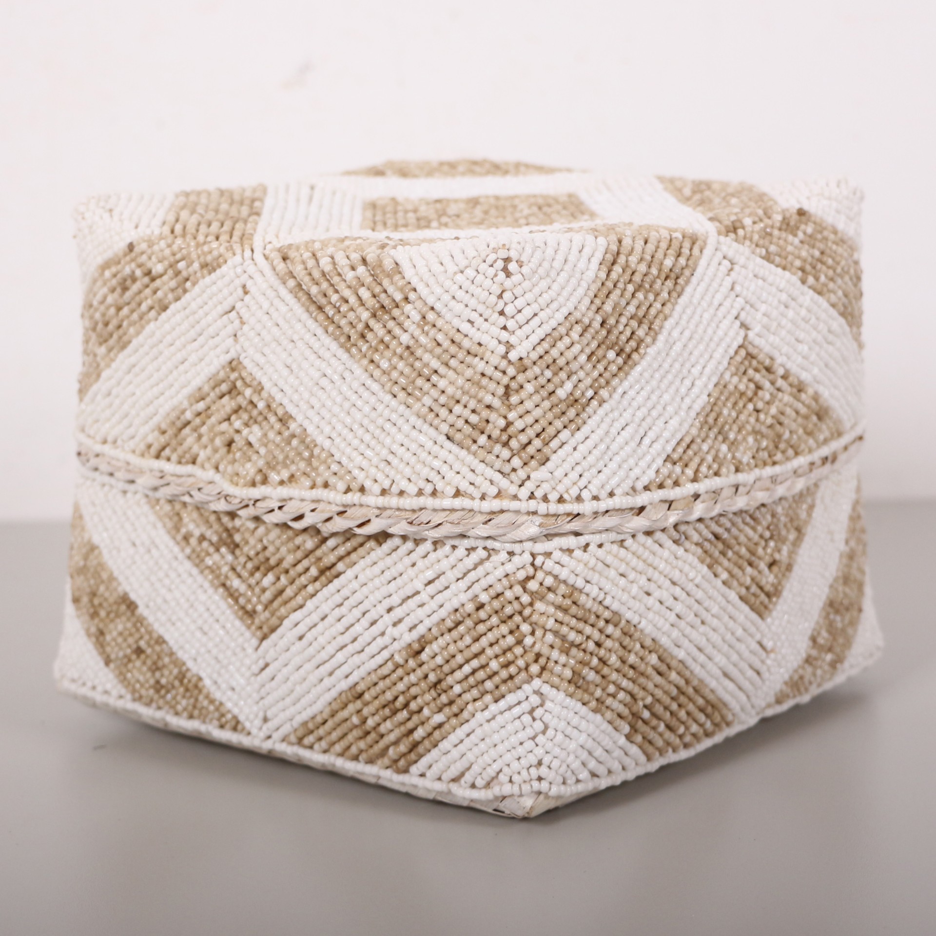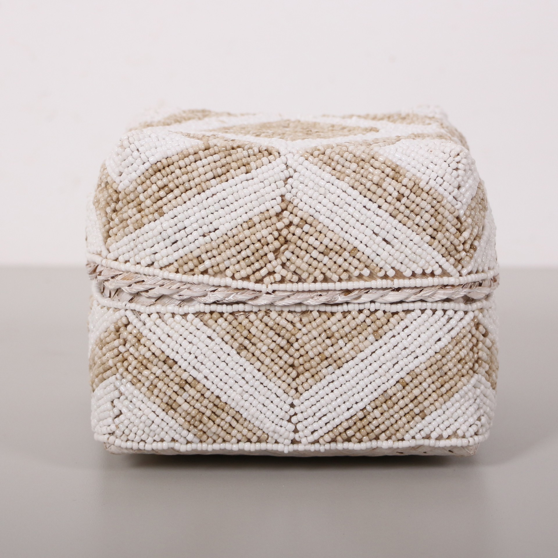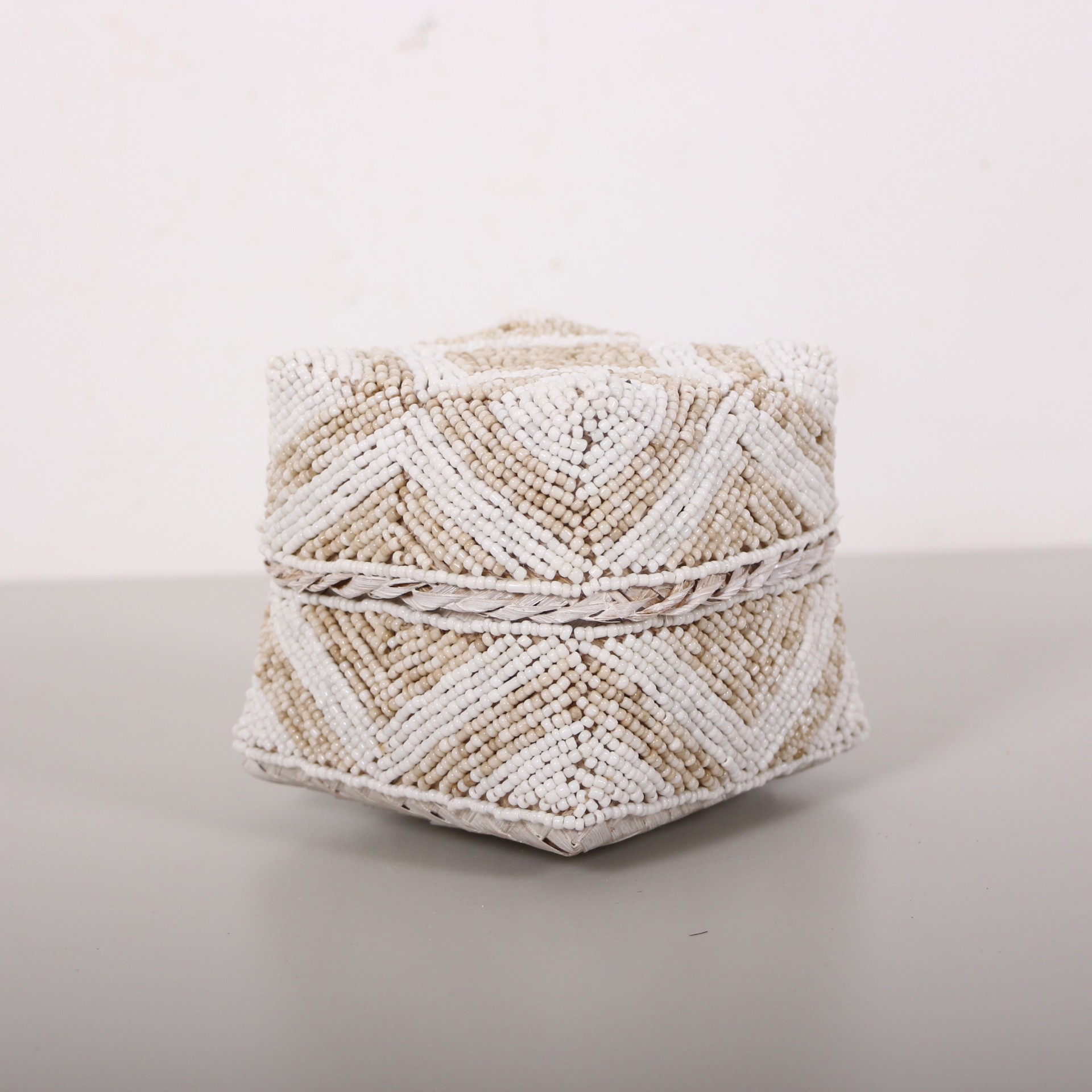 - Doğal Bambunun dış kabuğundan el işçiliği ile örülmüştür. Minik Cam boncuklarla farklı desen ve renklerde bambu kutunun üzerinde el işçiliği ile dekor verilerek, kapak kısmında püskülle tamamlanmıştır.