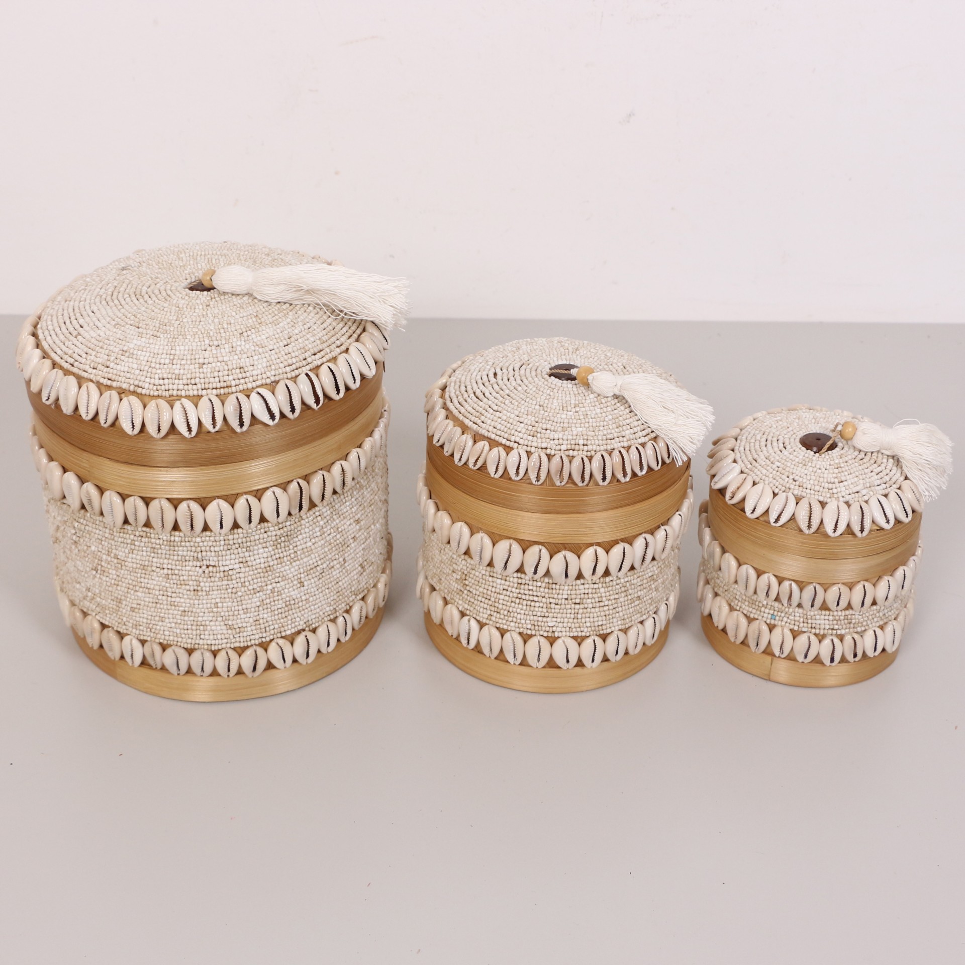 - Doğal Bambunun dış kabuğundan el işçiliği ile örülmüştür. Minik Cam boncuklarla farklı desen ve renklerde bambu kutunun üzerinde el işçiliği ile dekor verilerek, kapak kısmında püskülle tamamlanmıştır.