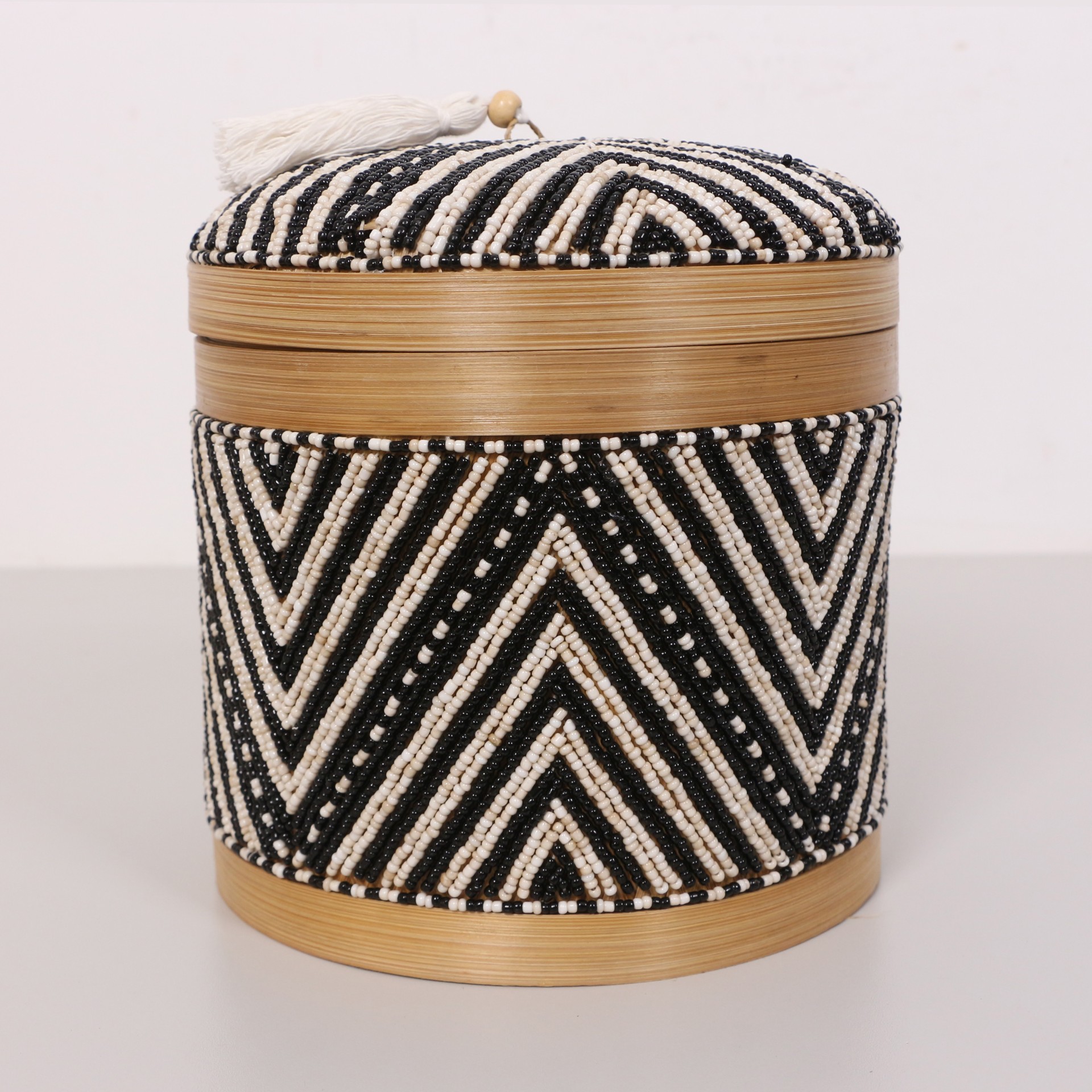 - Doğal Bambunun dış kabuğundan el işçiliği ile örülmüştür. Minik Cam boncuklarla farklı desen ve renklerde bambu kutunun üzerinde el işçiliği ile dekor verilerek, kapak kısmında püskülle tamamlanmıştır.