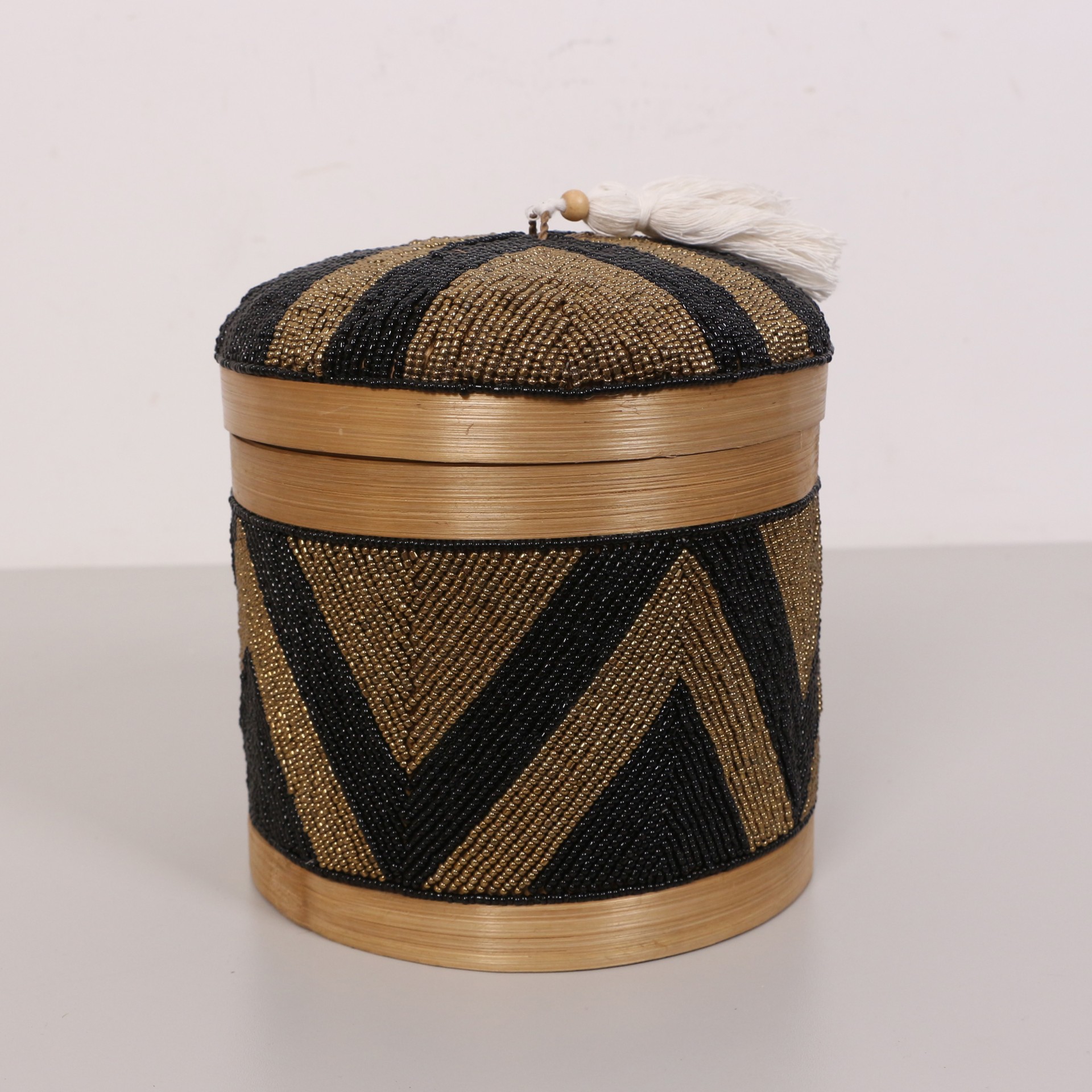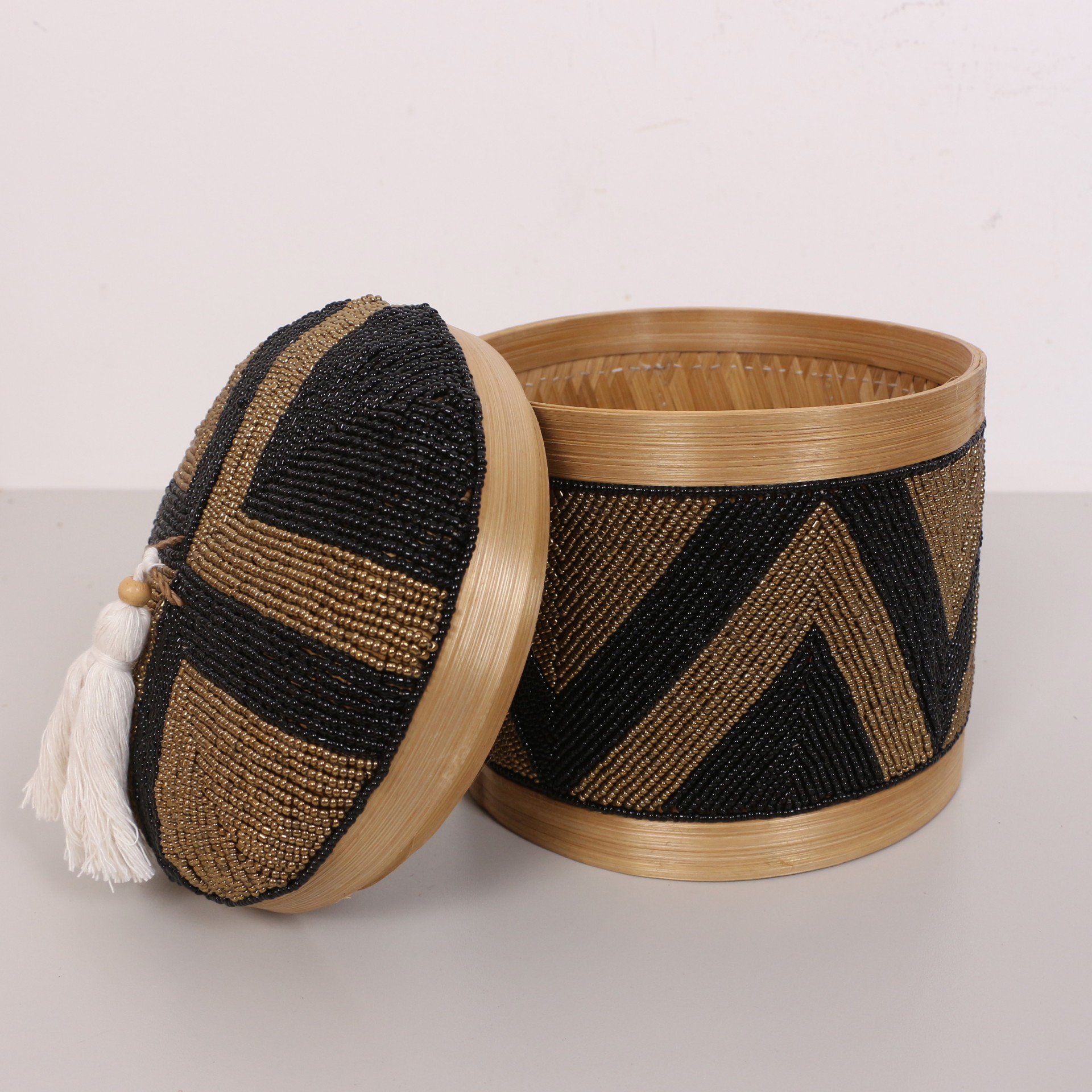 • Doğal Bambunun dış kabuğundan el işçiliği ile örülmüştür. Minik Cam boncuklarla farklı desen ve renklerde bambu kutunun üzerinde el işçiliği ile dekor verilerek, kapak kısmında püskülle tamamlanmıştır.