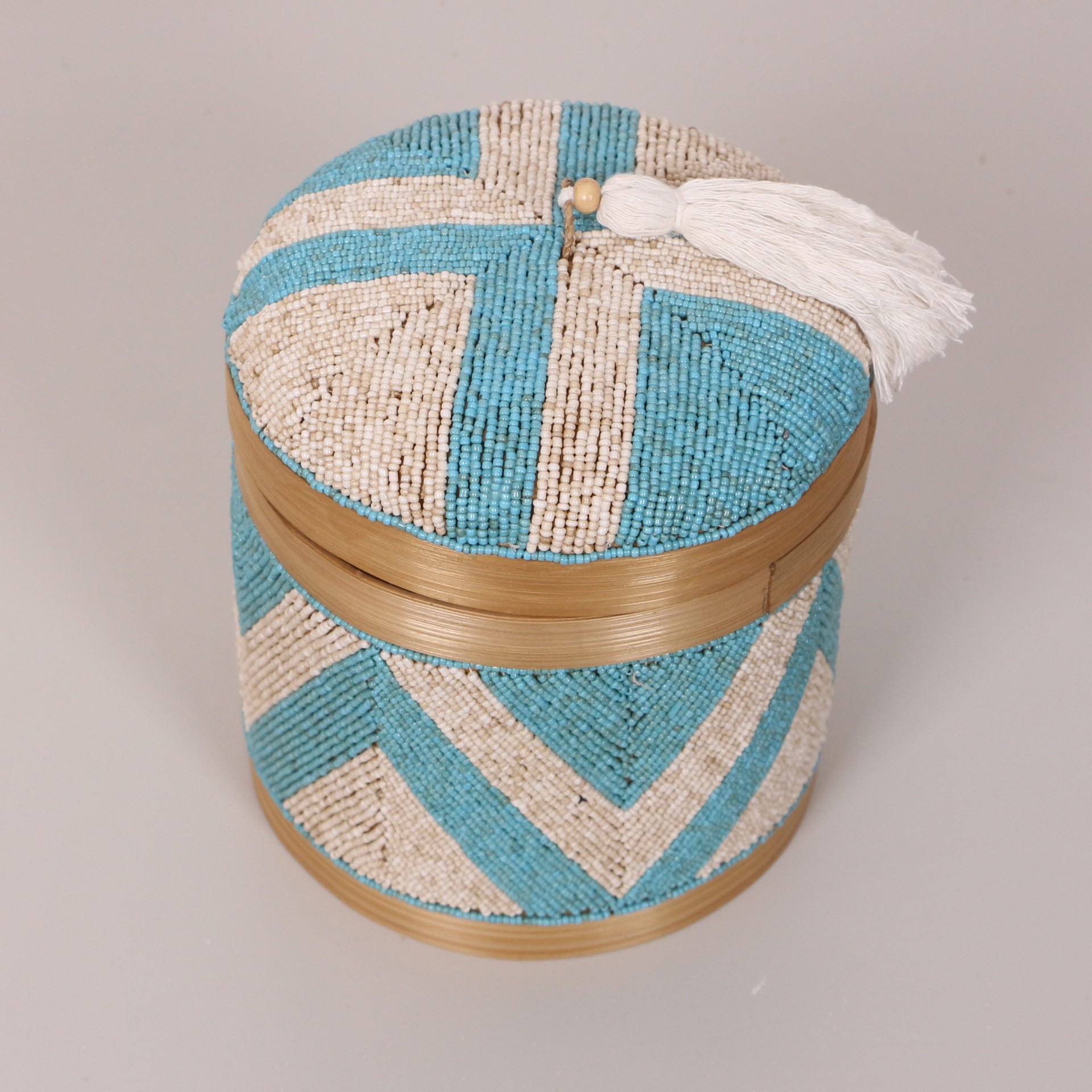 - Doğal Bambunun dış kabuğundan el işçiliği ile örülmüştür. Minik Cam boncuklarla farklı desen ve renklerde bambu kutunun üzerinde el işçiliği ile dekor verilerek, kapak kısmında püskülle tamamlanmıştır.
