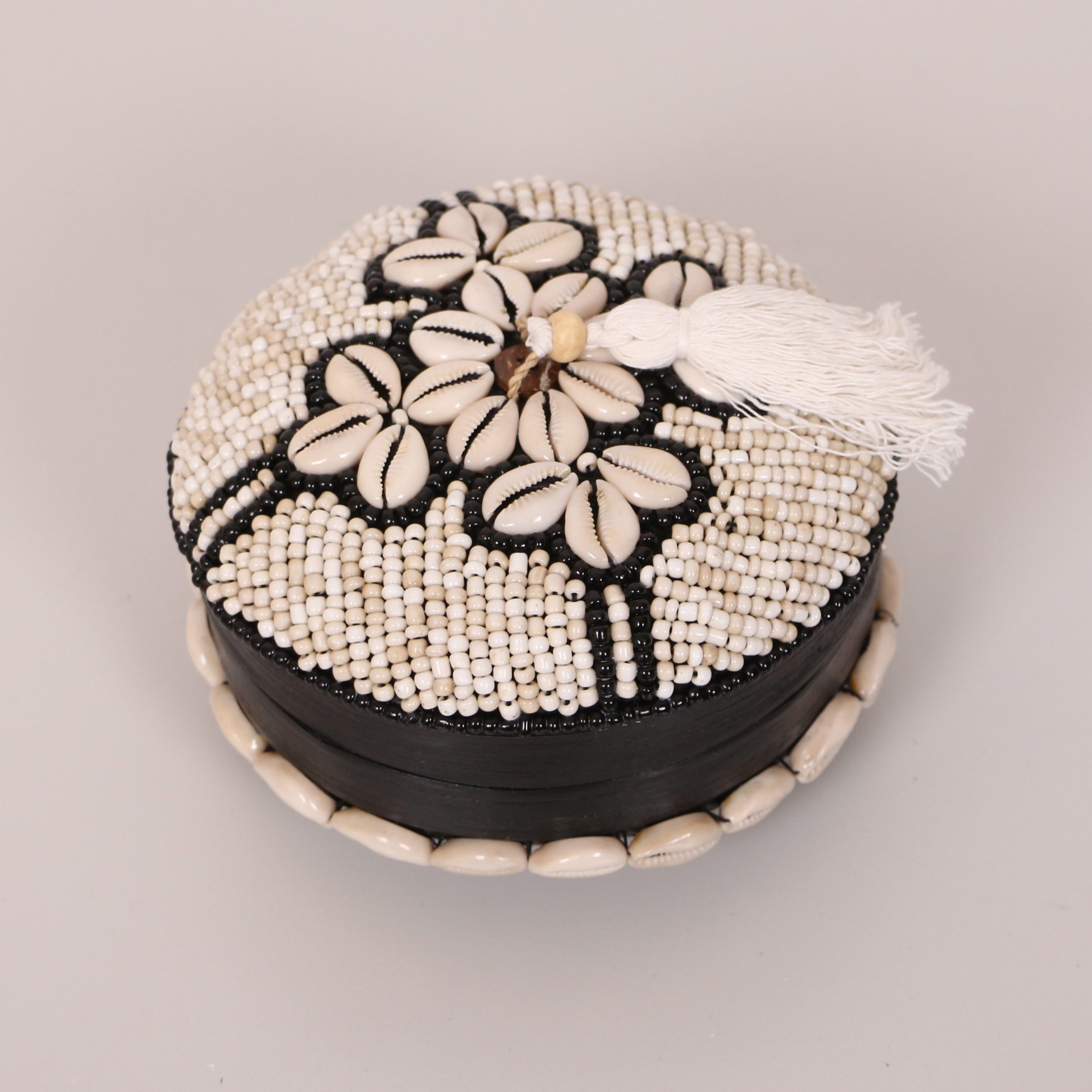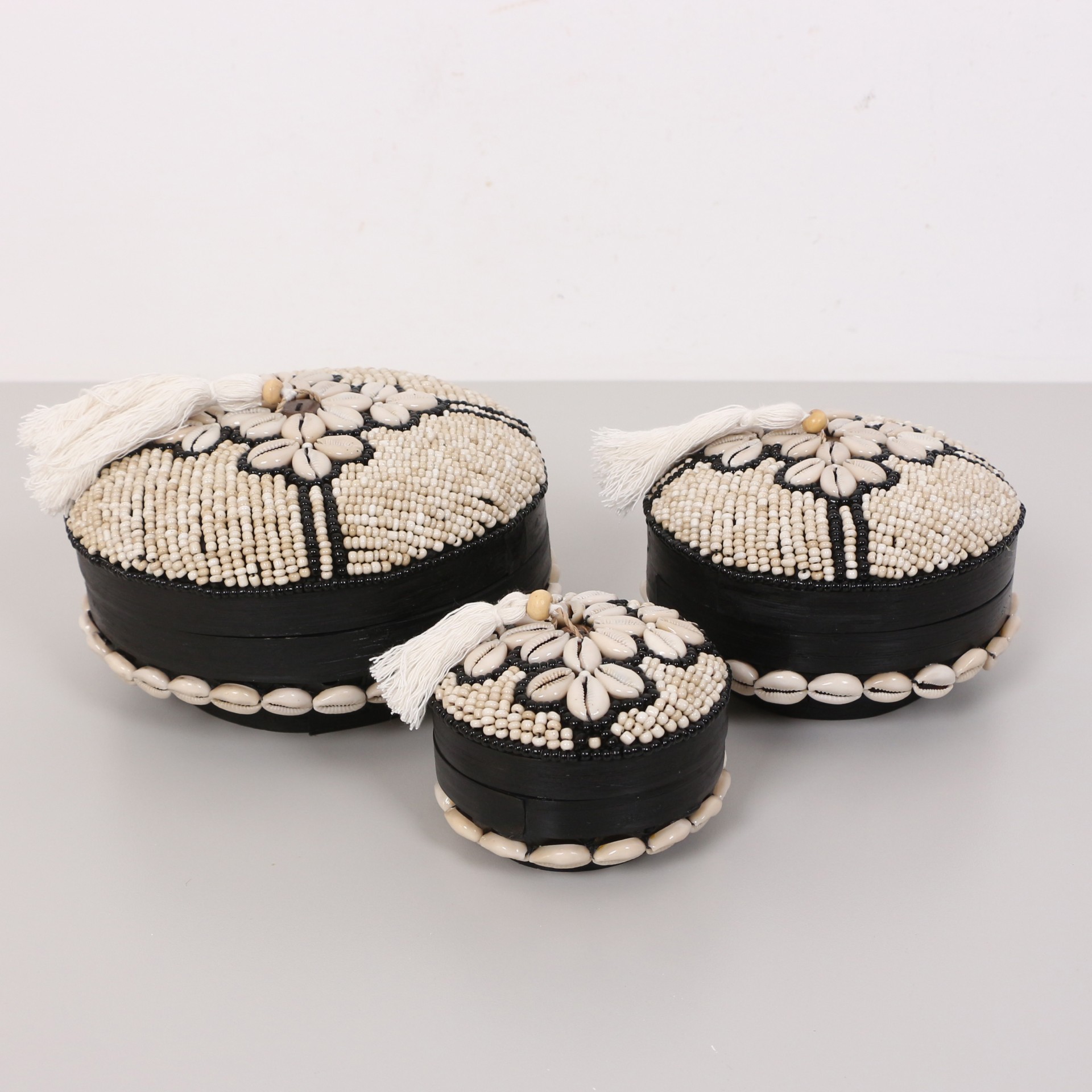 - Doğal Bambunun dış kabuğundan el işçiliği ile örülmüştür. Minik Cam boncuklarla farklı desen ve renklerde bambu kutunun üzerinde el işçiliği ile dekor verilerek, kapak kısmında püskülle tamamlanmıştır.