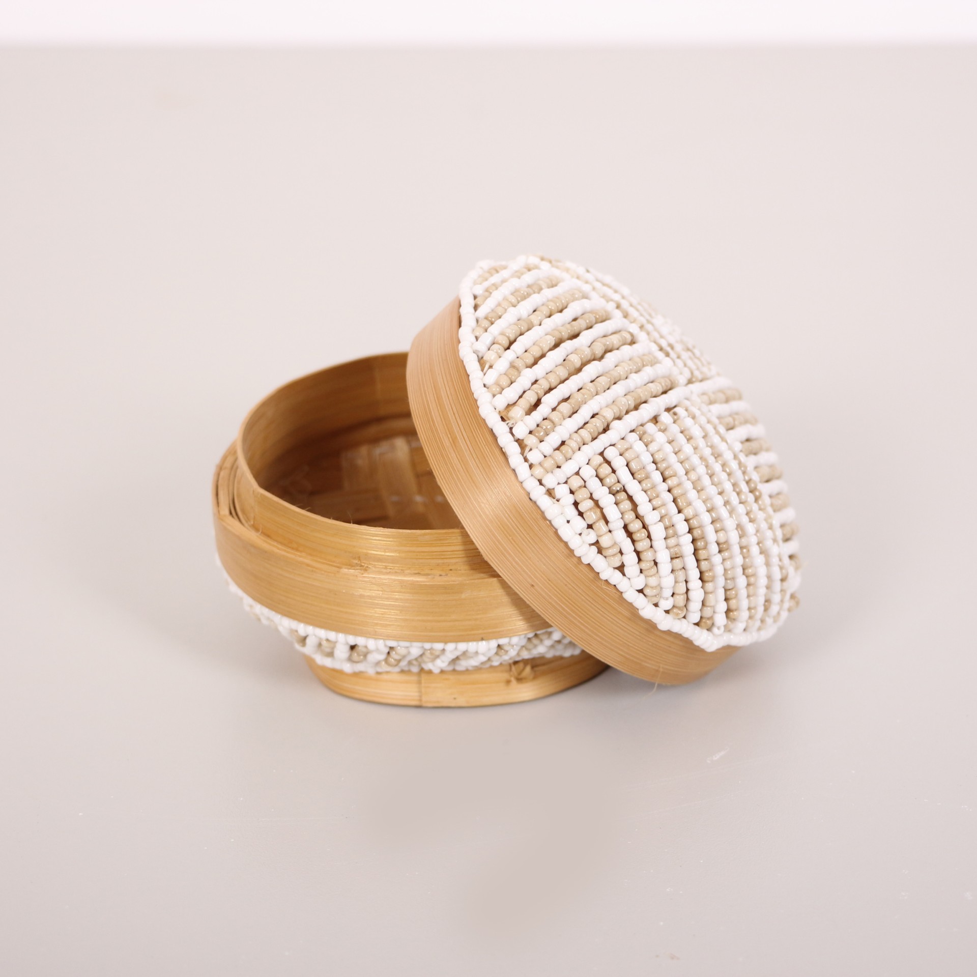 - Doğal Bambunun dış kabuğundan el işçiliği ile örülmüştür. Minik Cam boncuklarla farklı desen ve renklerde bambu kutunun üzerinde el işçiliği ile dekor verilerek, kapak kısmında püskülle tamamlanmıştır.