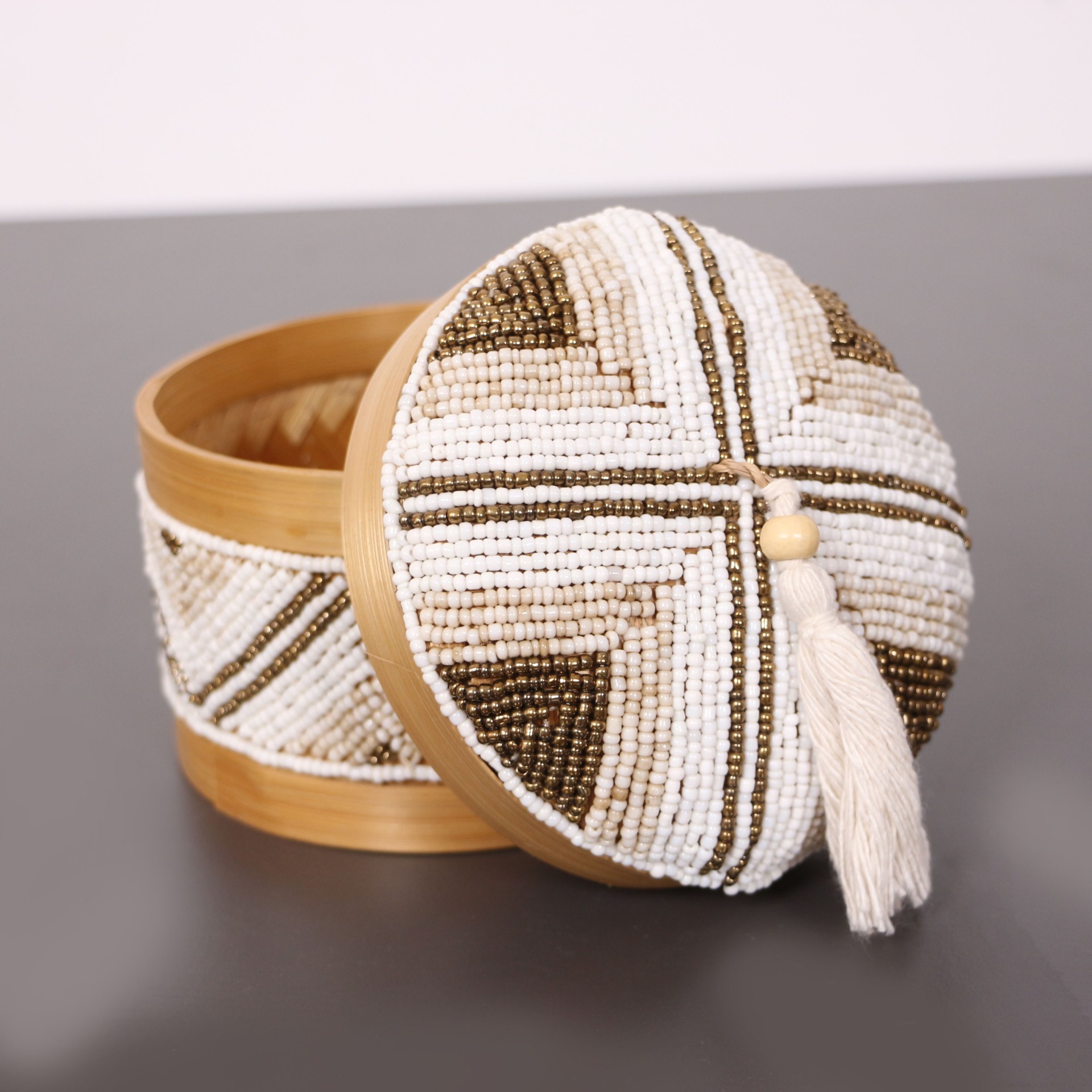 - Doğal Bambunun dış kabuğundan el işçiliği ile örülmüştür. Minik Cam boncuklarla farklı desen ve renklerde bambu kutunun üzerinde el işçiliği ile dekor verilerek, kapak kısmında püskülle tamamlanmıştır.