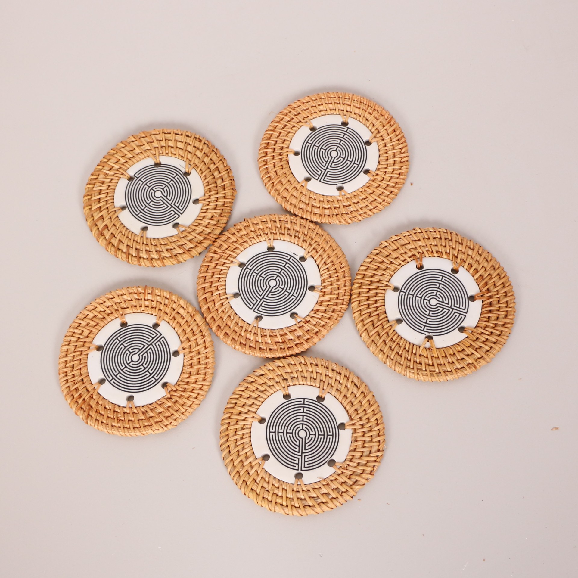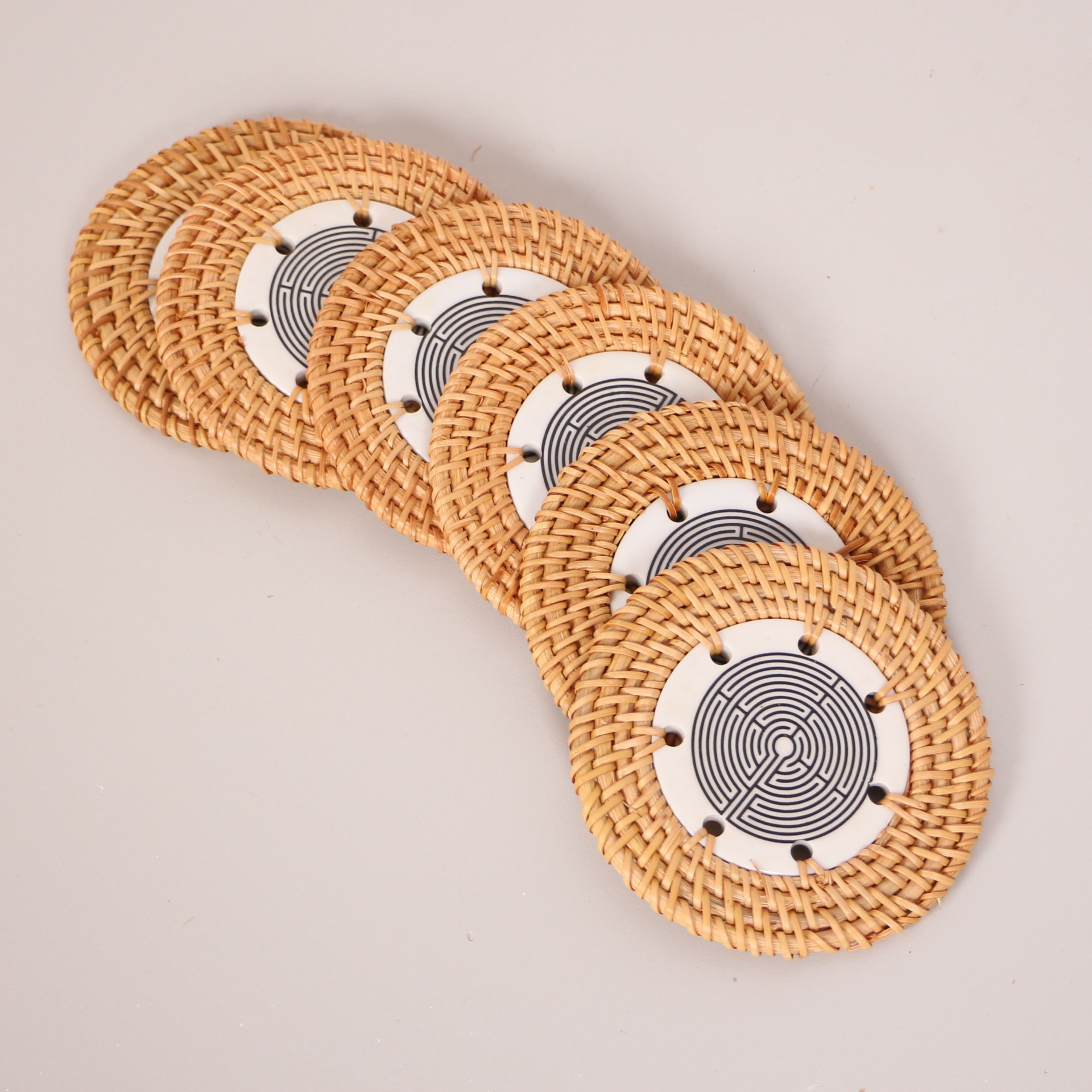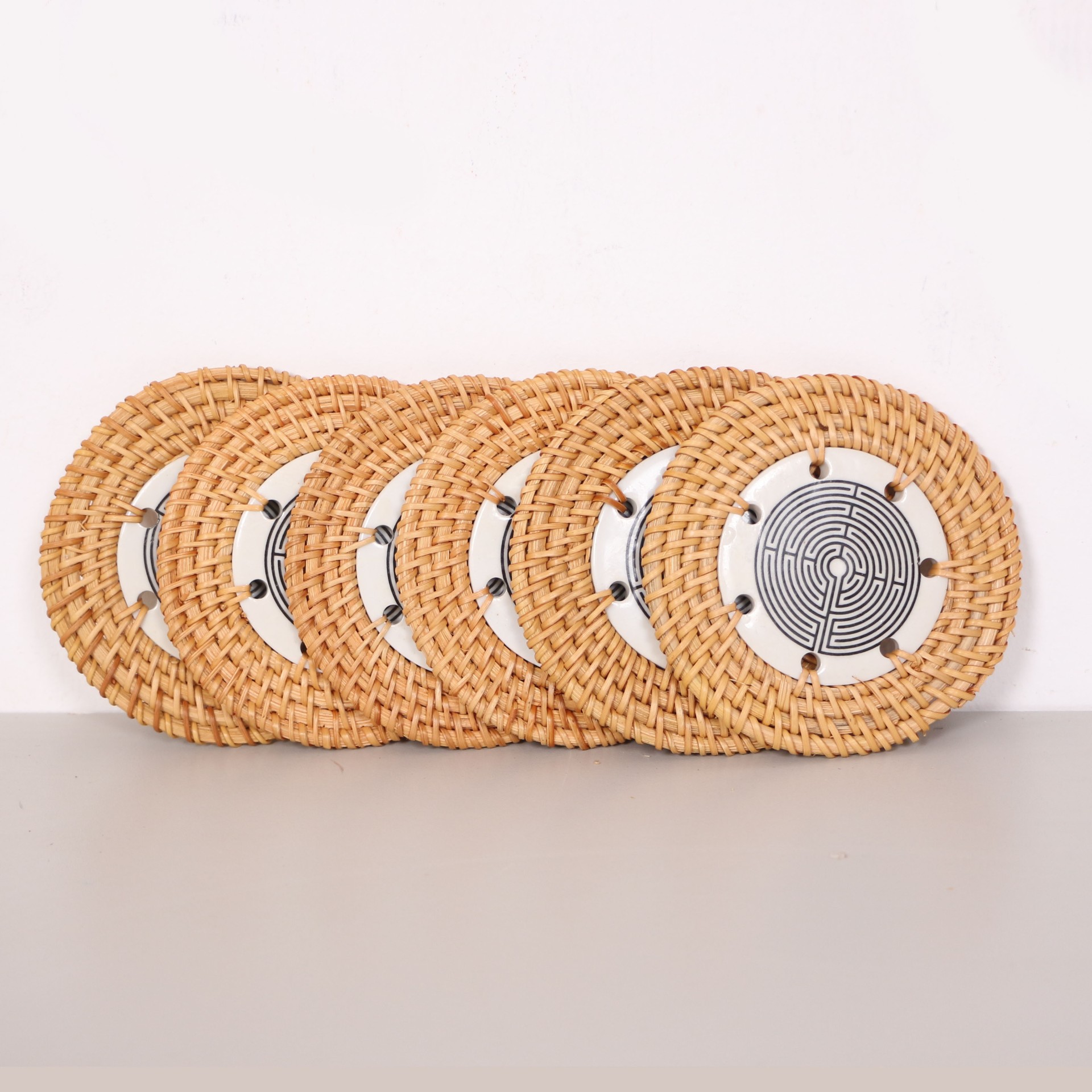 Labirent 6'lı Doğal Rattan ve El Yapımı Seramikli Bardak Altlığı