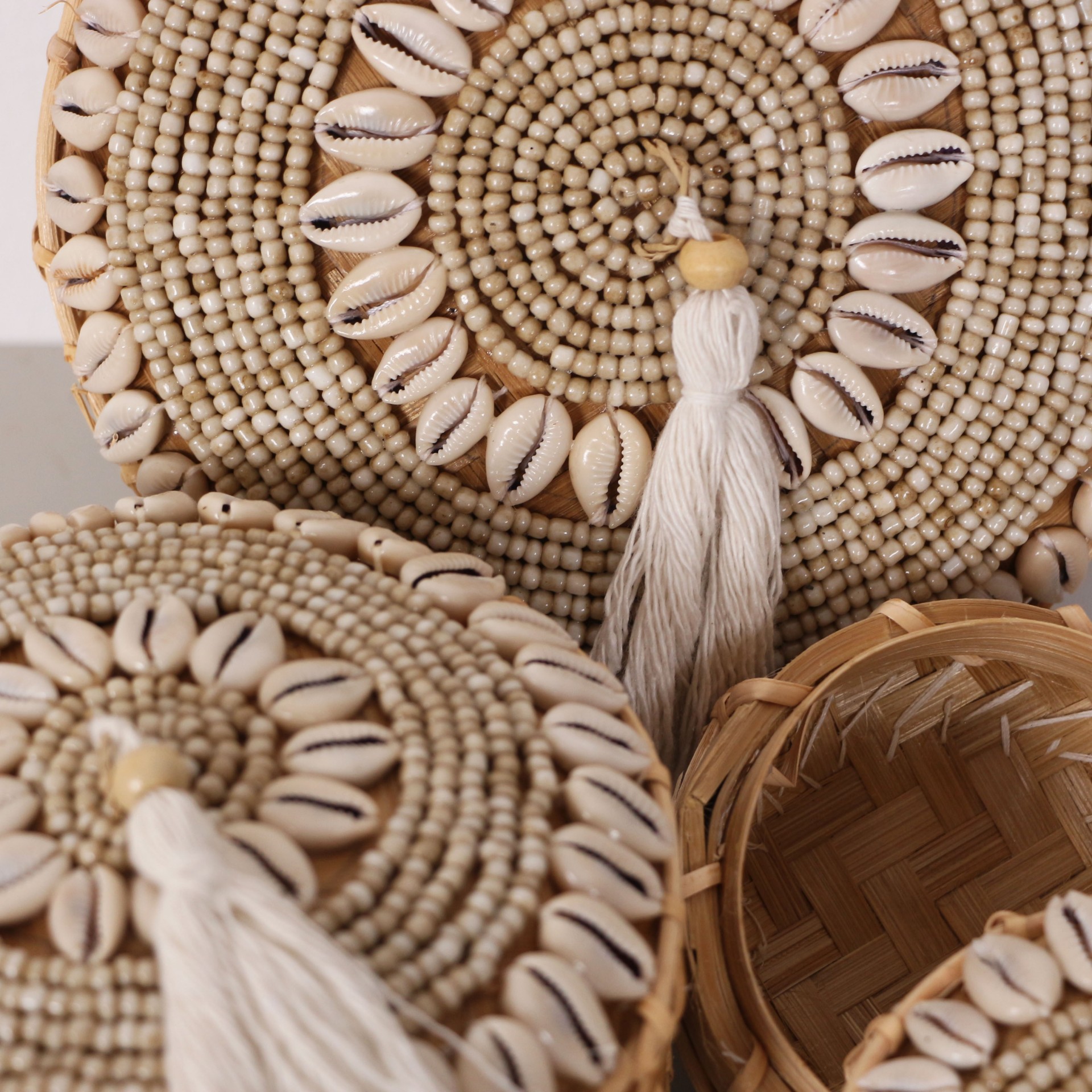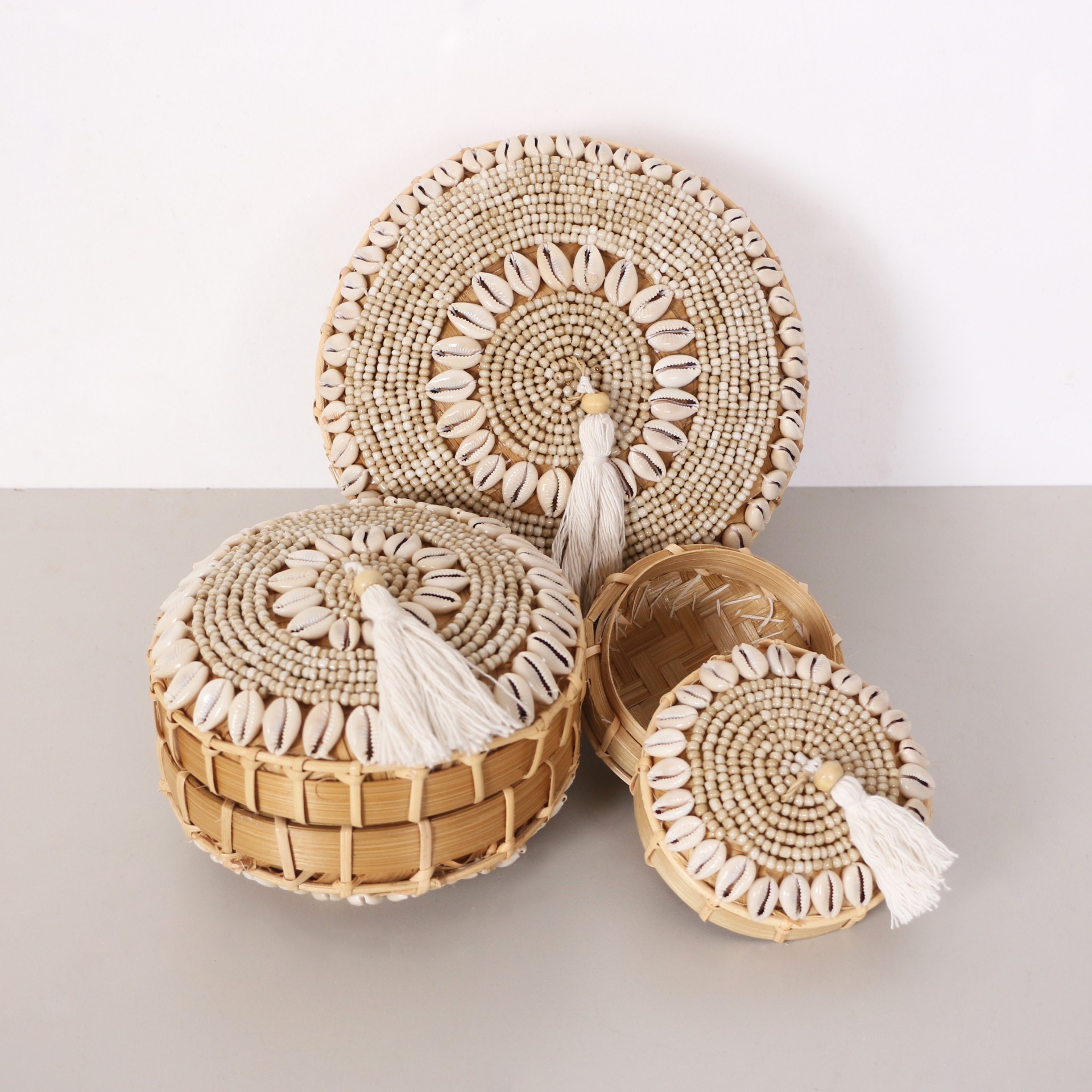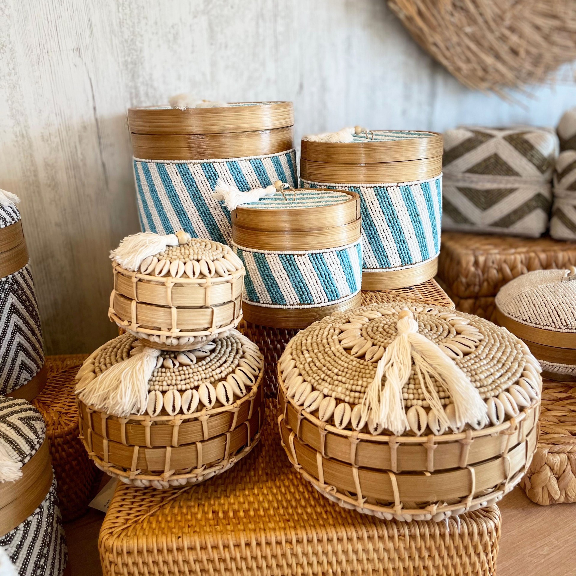 - Doğal Bambunun dış kabuğundan el işçiliği ile örülmüştür. Minik Cam boncuklarla farklı desen ve renklerde bambu kutunun üzerinde el işçiliği ile dekor verilerek, kapak kısmında püskülle tamamlanmıştır.