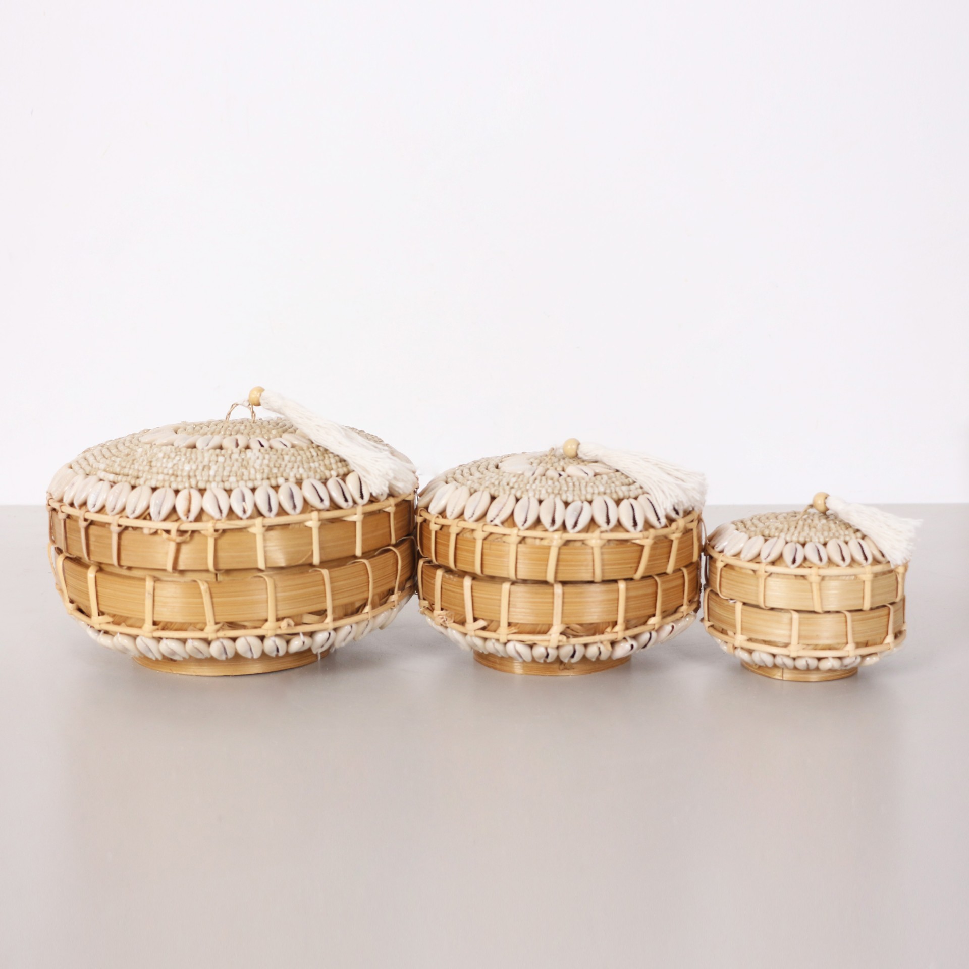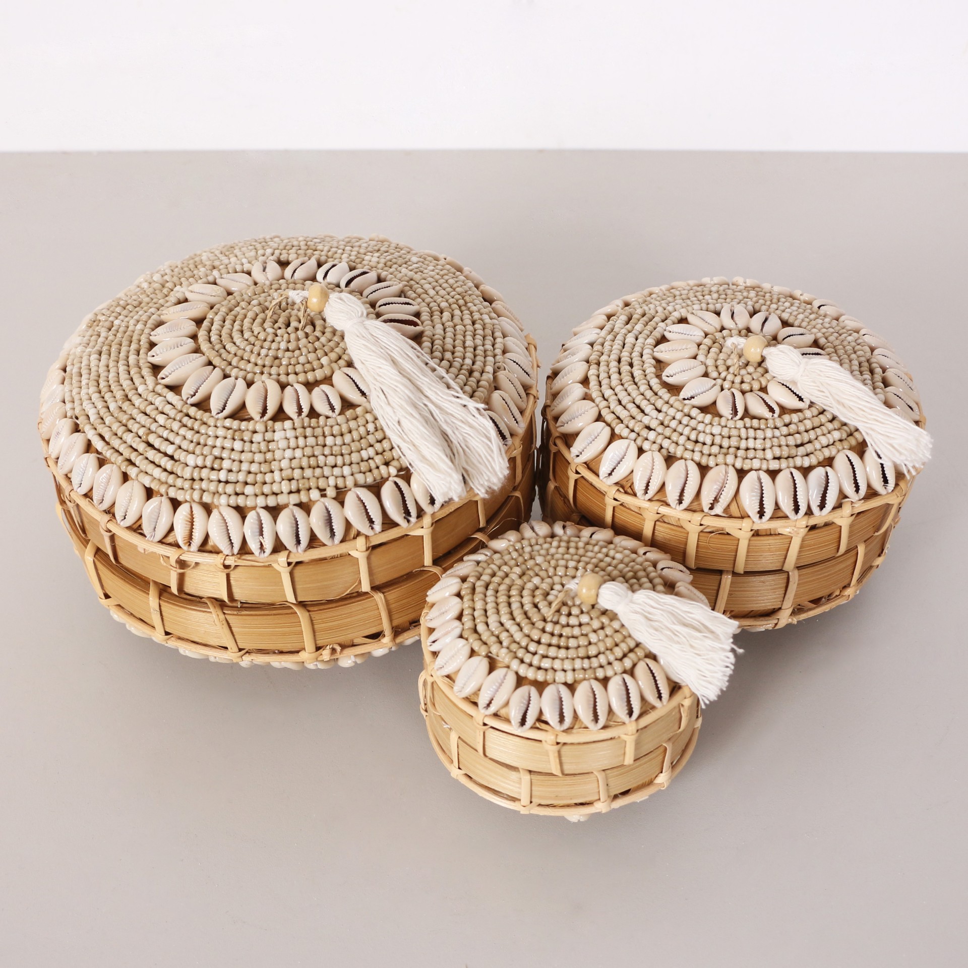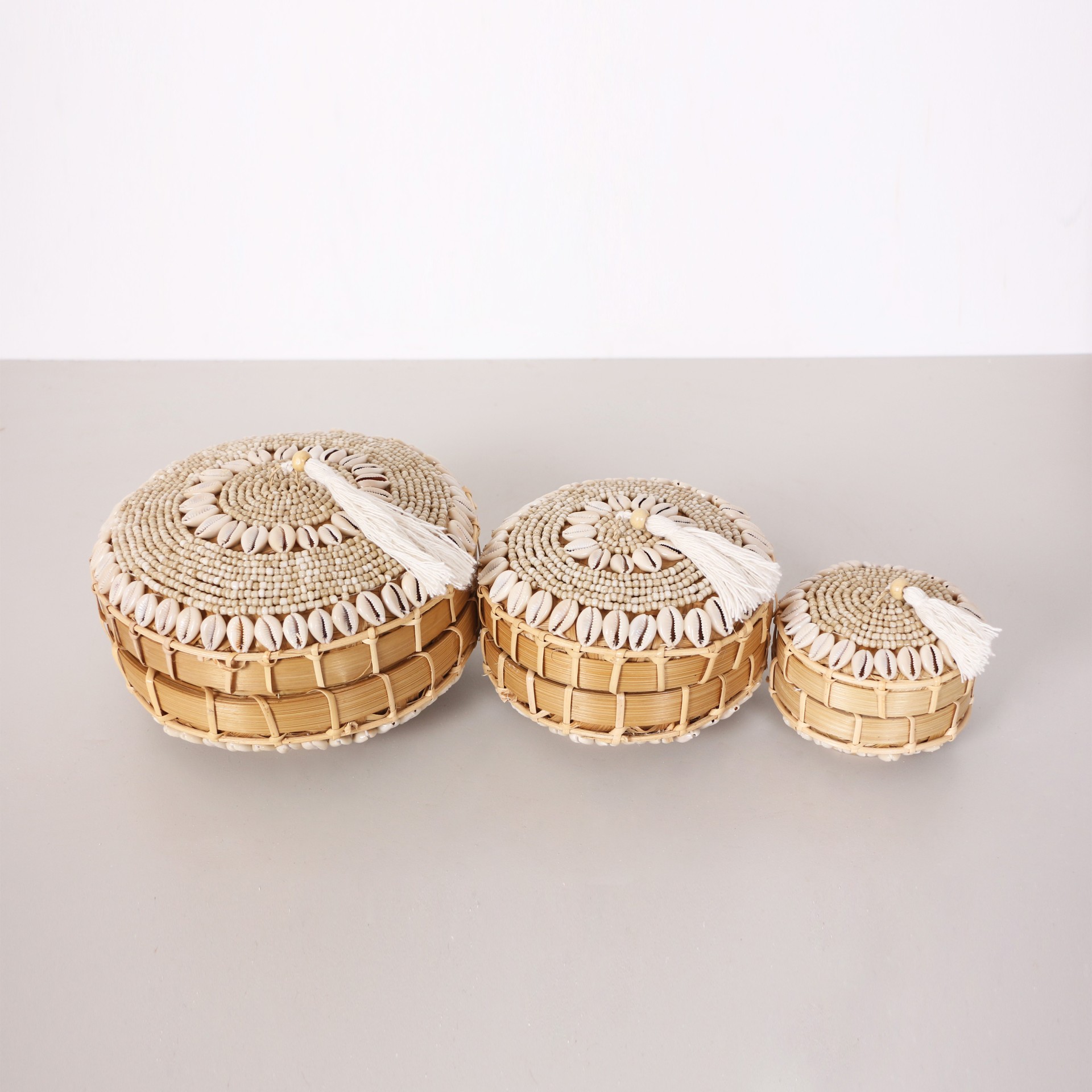- Doğal Bambunun dış kabuğundan el işçiliği ile örülmüştür. Minik Cam boncuklarla farklı desen ve renklerde bambu kutunun üzerinde el işçiliği ile dekor verilerek, kapak kısmında püskülle tamamlanmıştır.