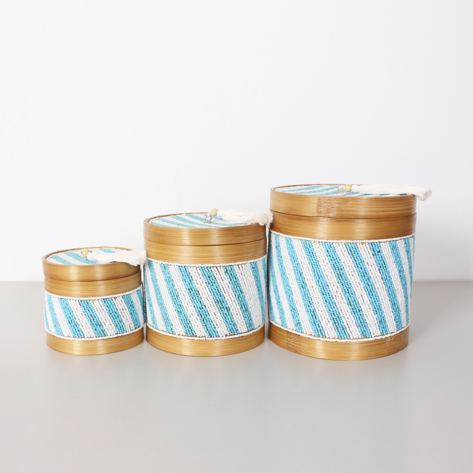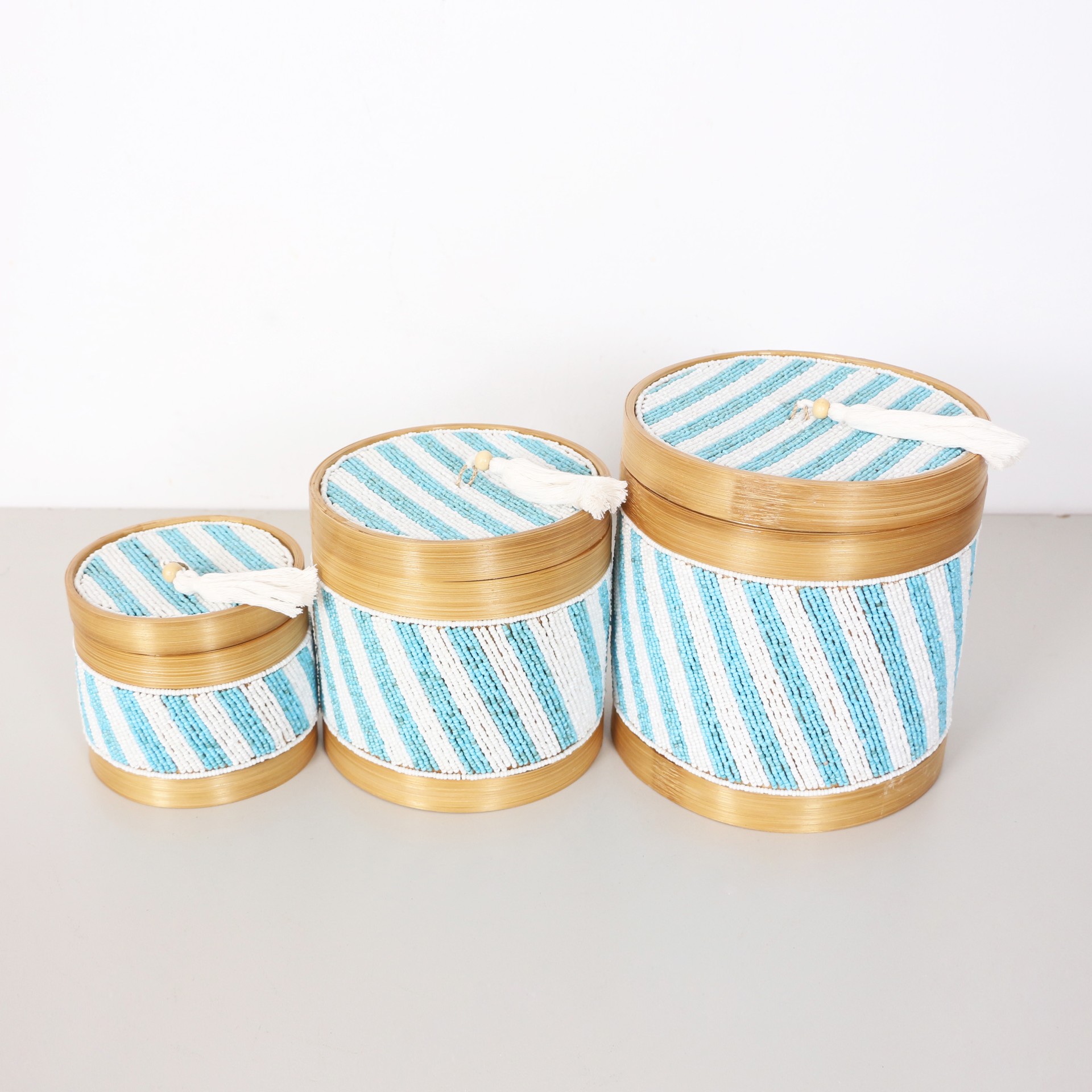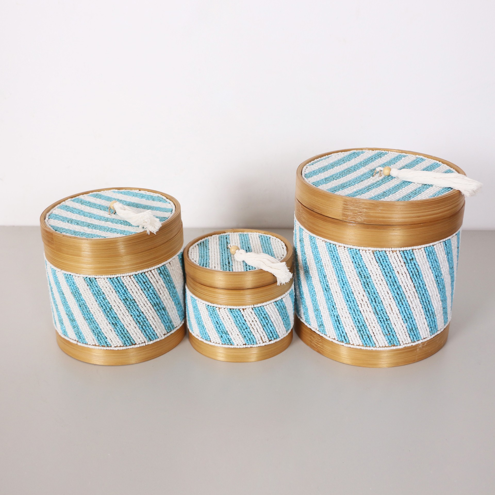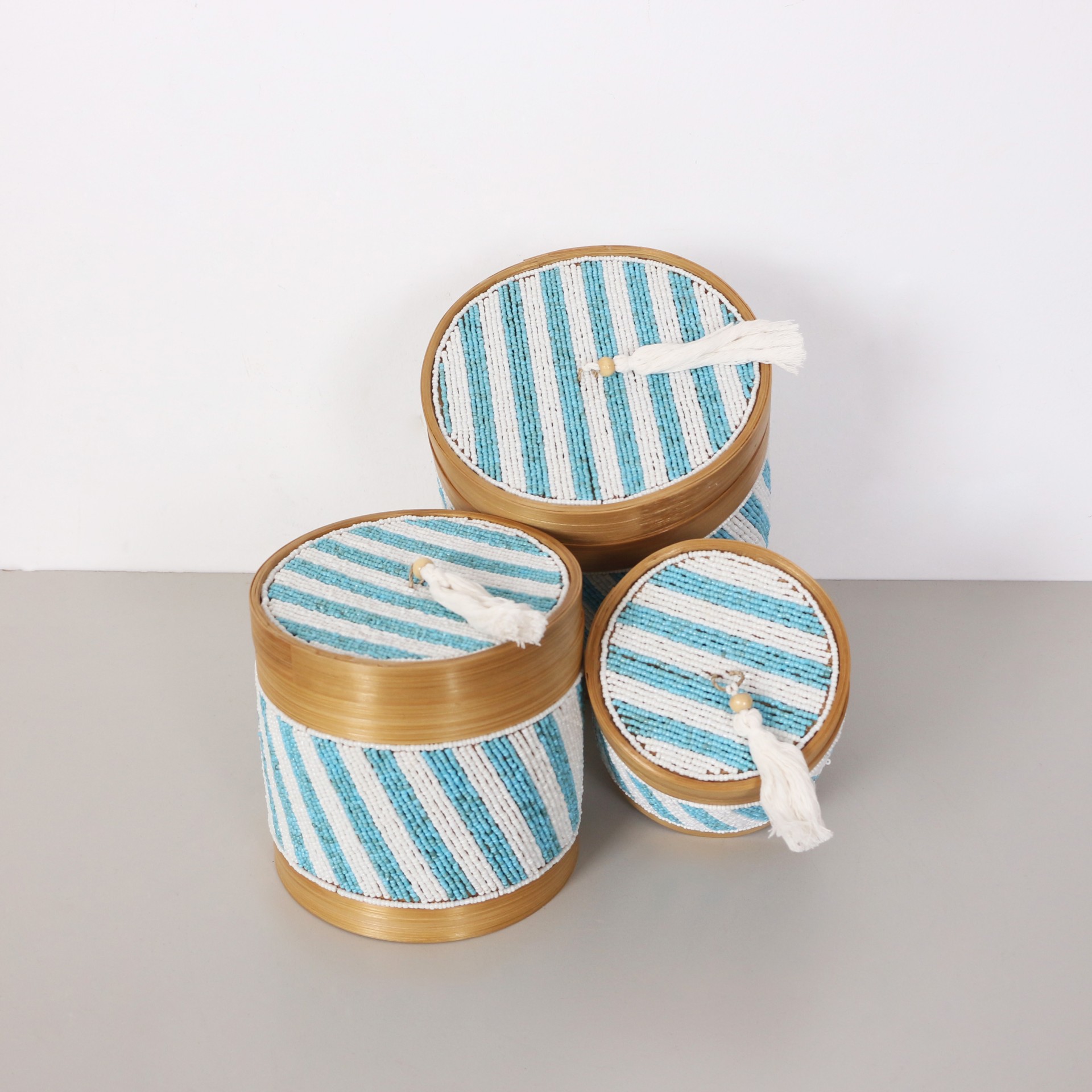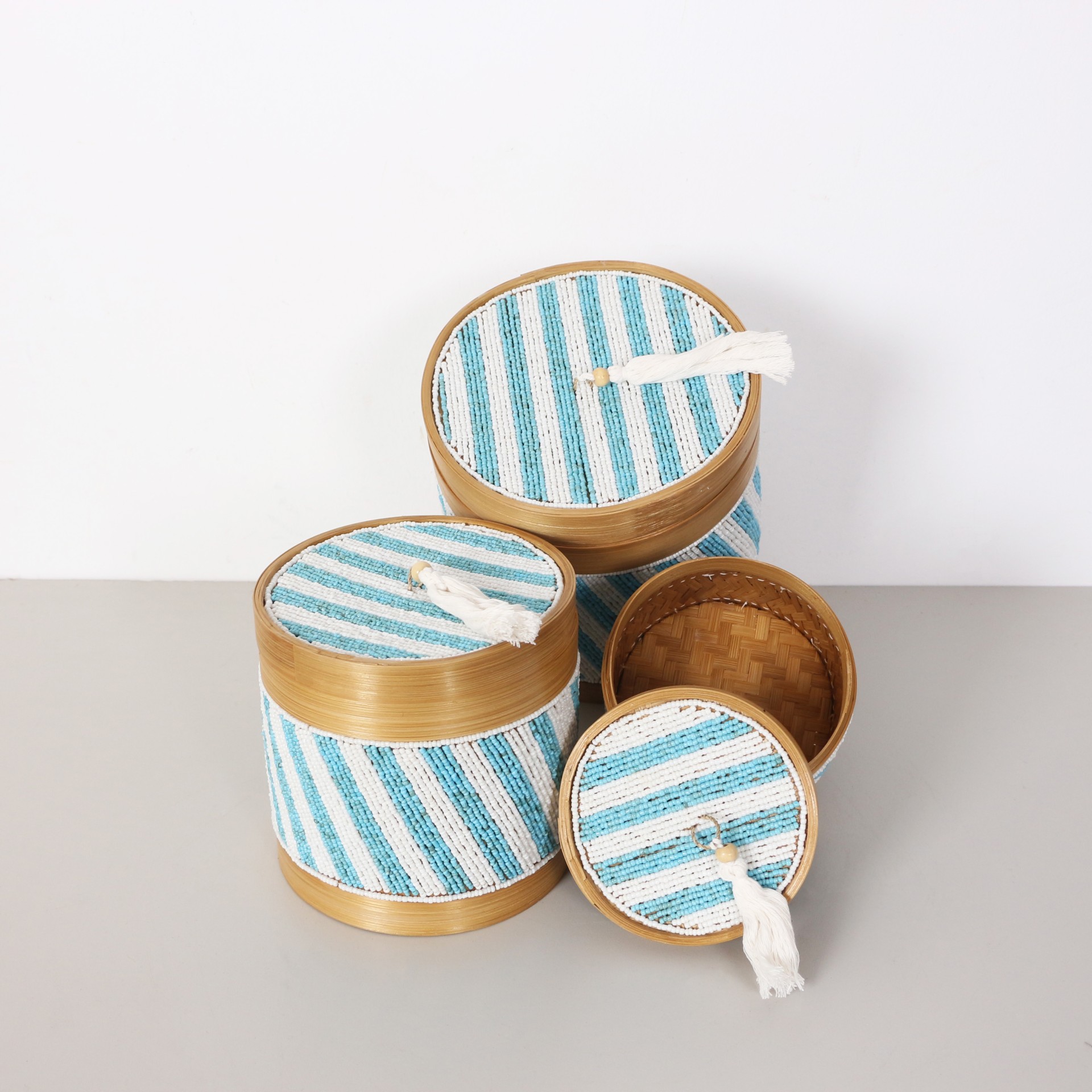 - Doğal Bambunun dış kabuğundan el işçiliği ile örülmüştür. Minik Cam boncuklarla farklı desen ve renklerde bambu kutunun üzerinde el işçiliği ile dekor verilerek, kapak kısmında püskülle tamamlanmıştır.