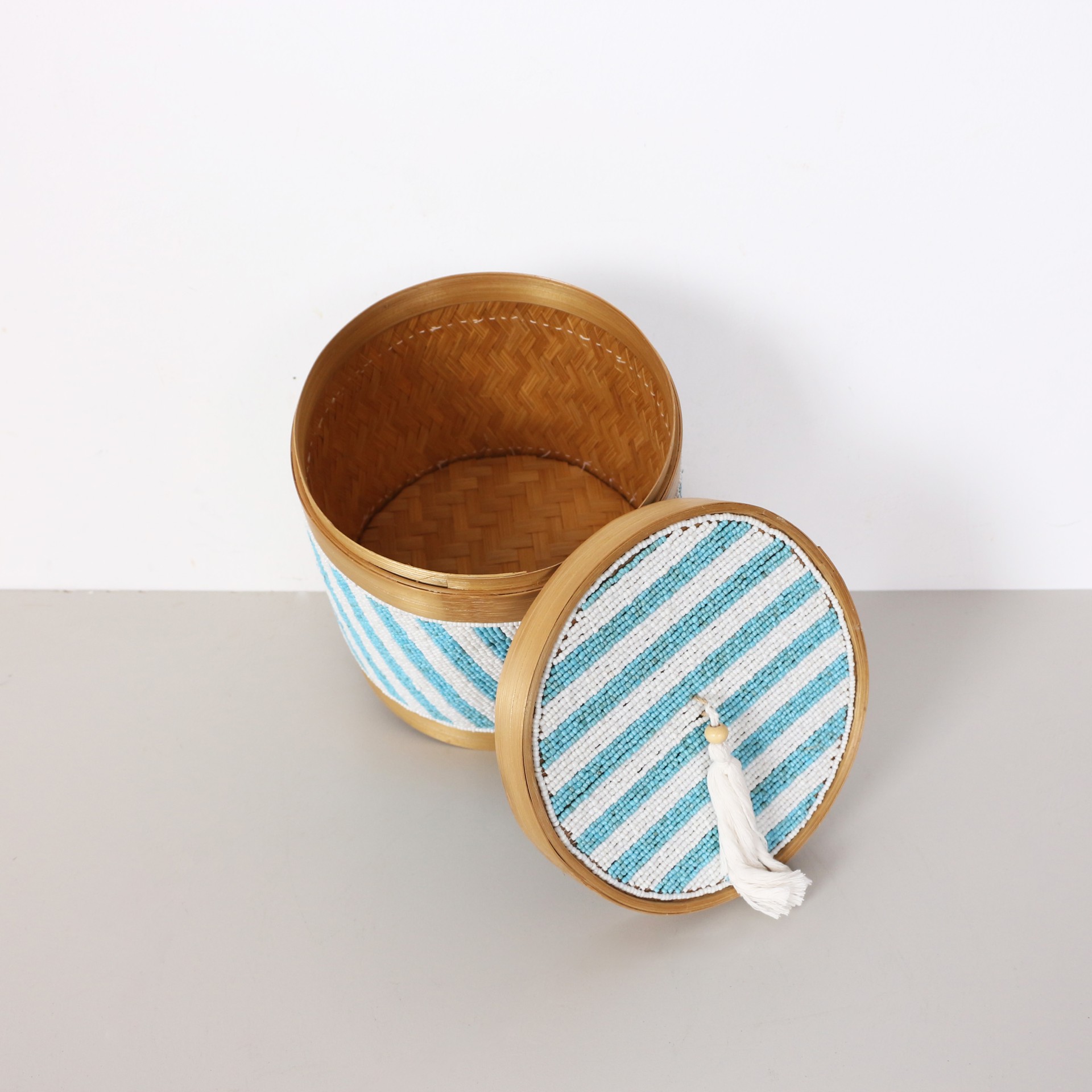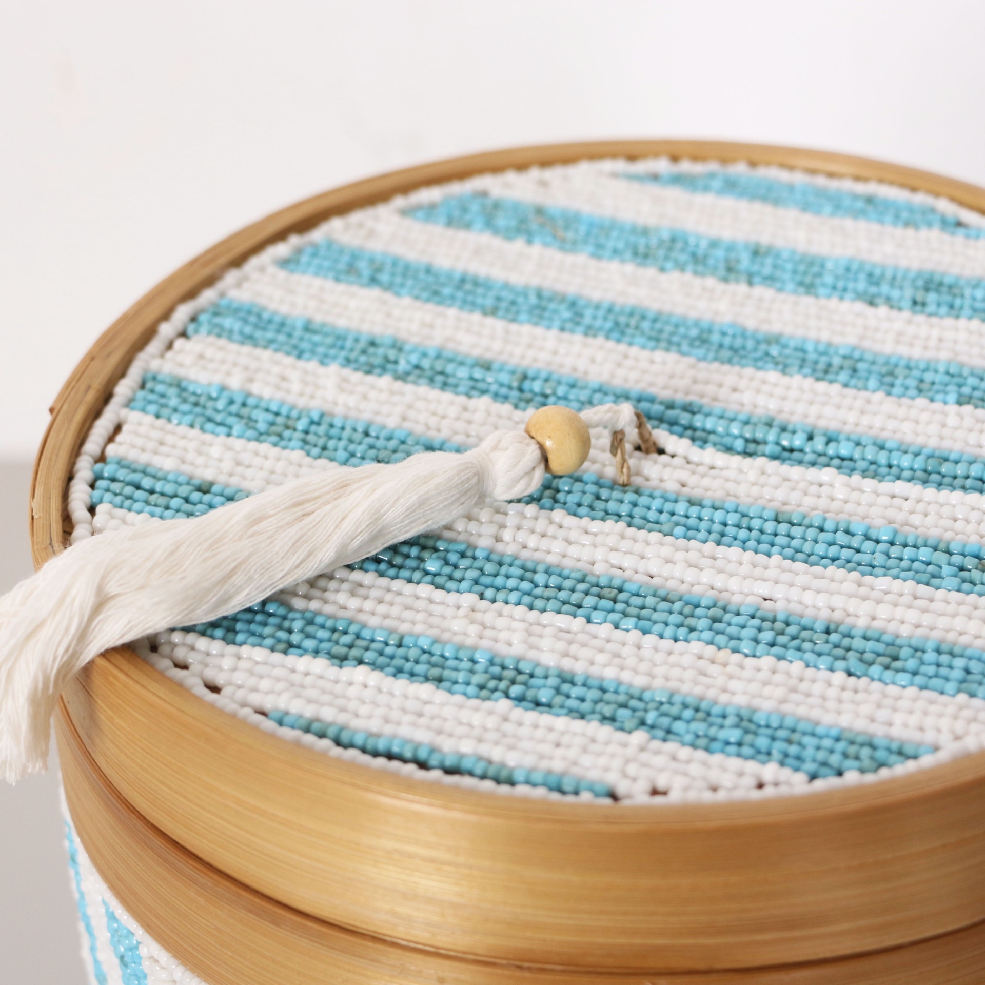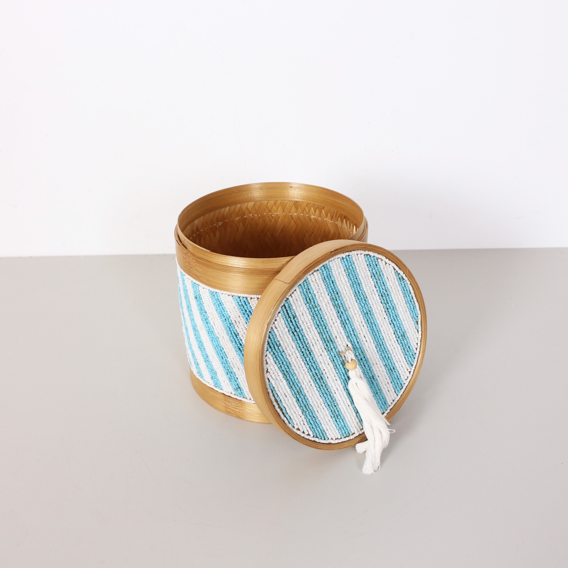 - Doğal Bambunun dış kabuğundan el işçiliği ile örülmüştür. Minik Cam boncuklarla farklı desen ve renklerde bambu kutunun üzerinde el işçiliği ile dekor verilerek, kapak kısmında püskülle tamamlanmıştır.
