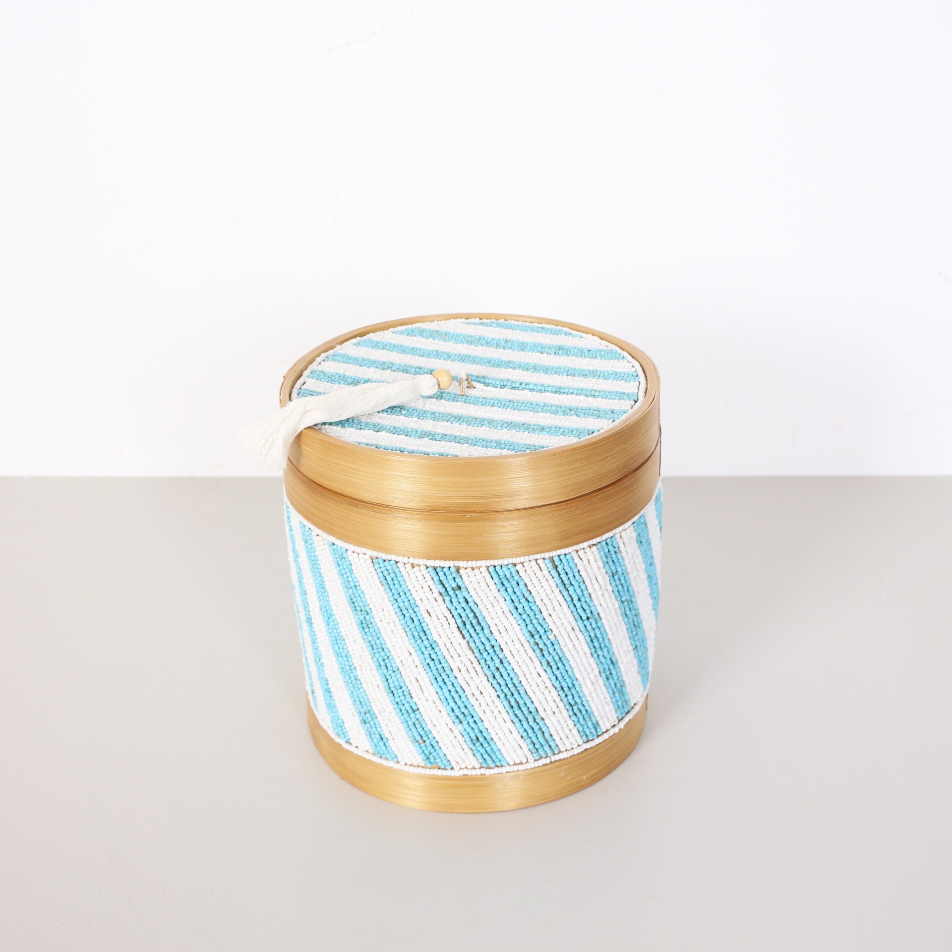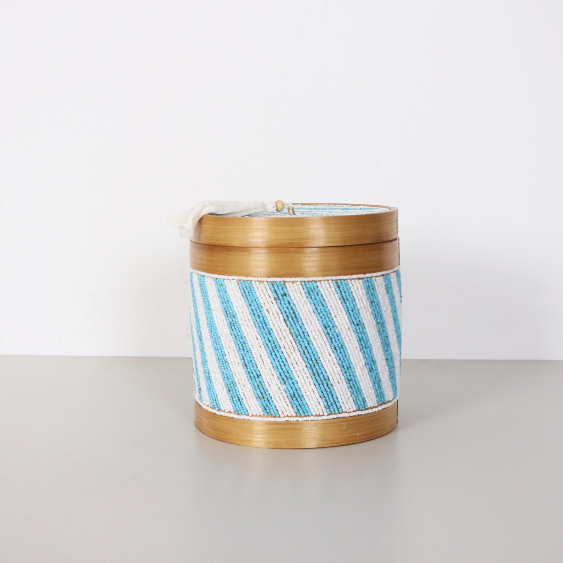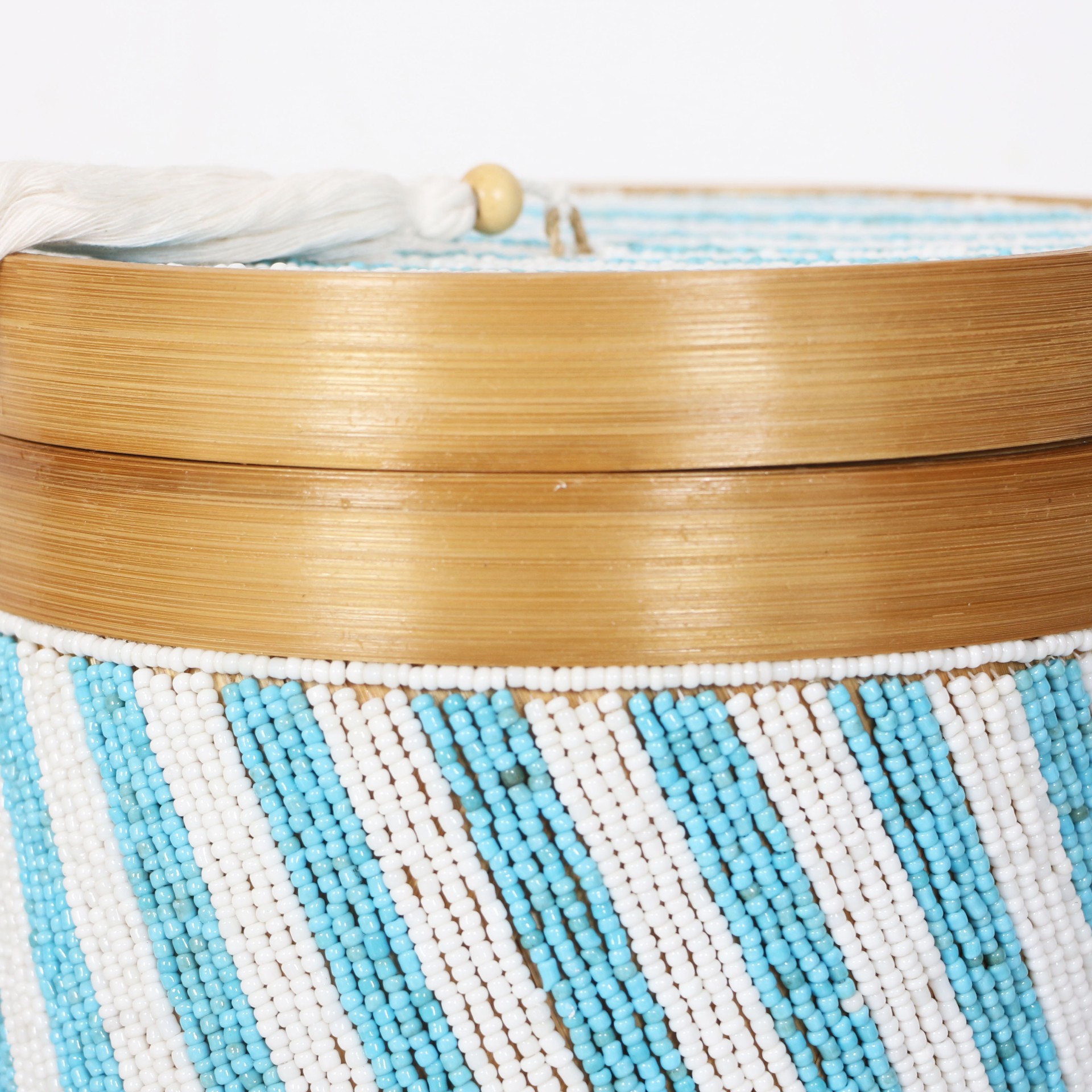 - Doğal Bambunun dış kabuğundan el işçiliği ile örülmüştür. Minik Cam boncuklarla farklı desen ve renklerde bambu kutunun üzerinde el işçiliği ile dekor verilerek, kapak kısmında püskülle tamamlanmıştır.