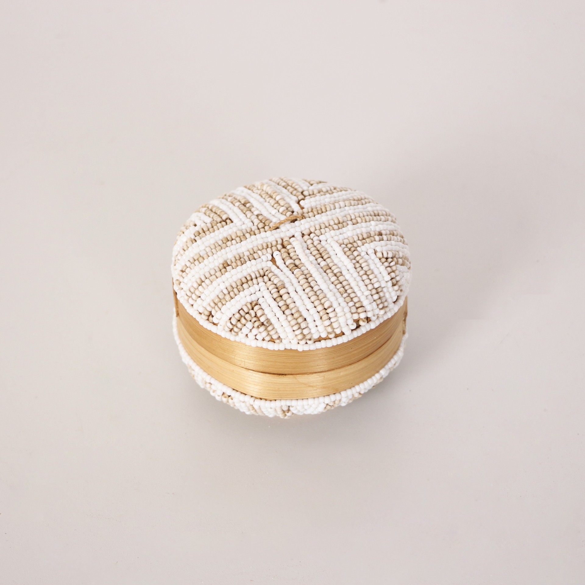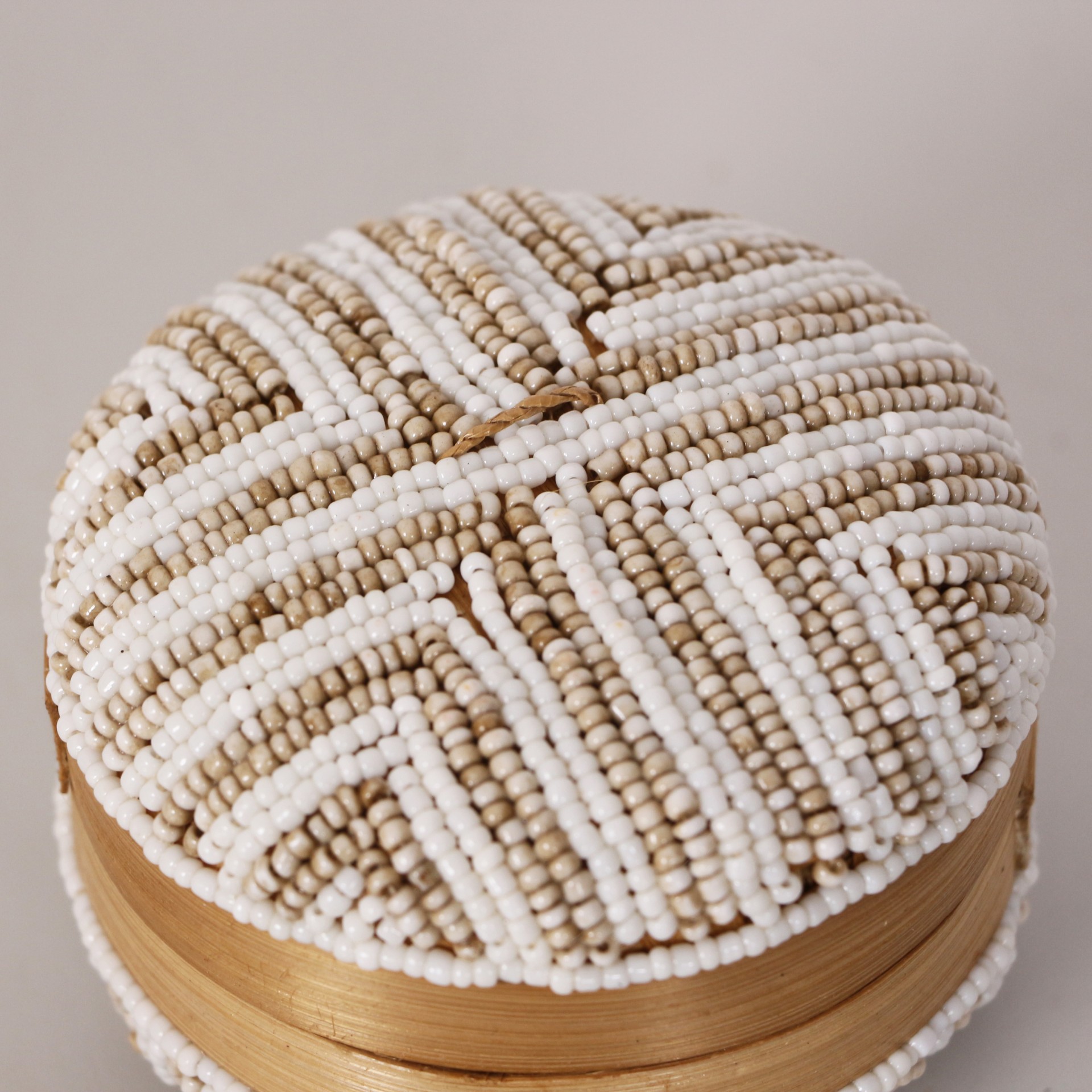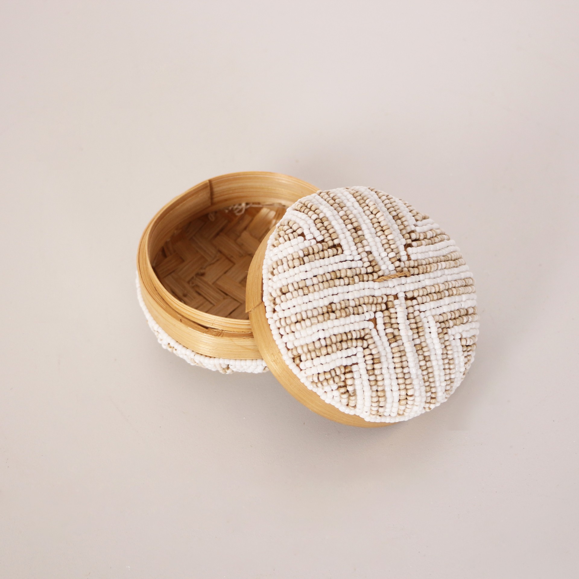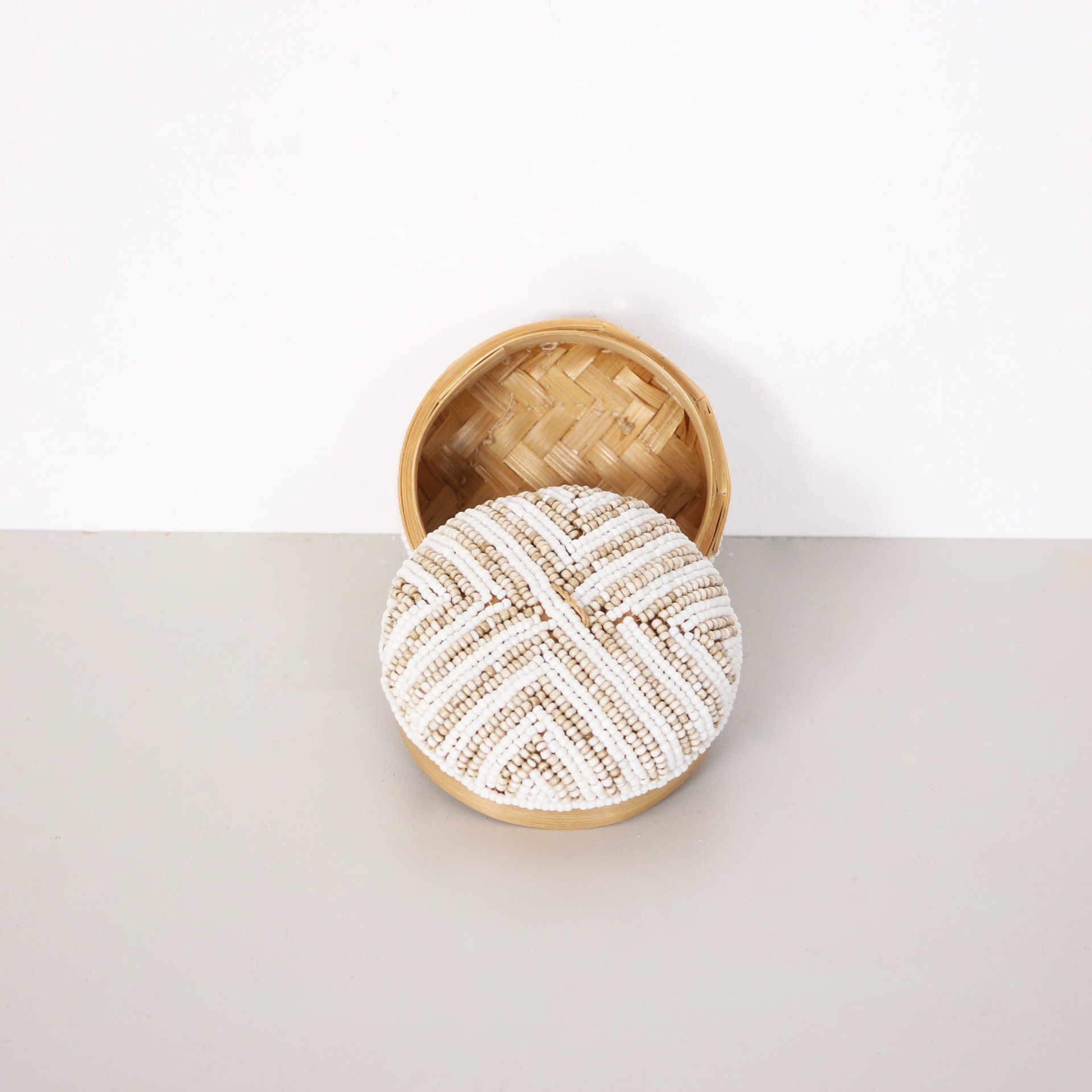 - Doğal Bambunun dış kabuğundan el işçiliği ile örülmüştür. Minik Cam boncuklarla farklı desen ve renklerde bambu kutunun üzerinde el işçiliği ile dekor verilerek, kapak kısmında püskülle tamamlanmıştır.