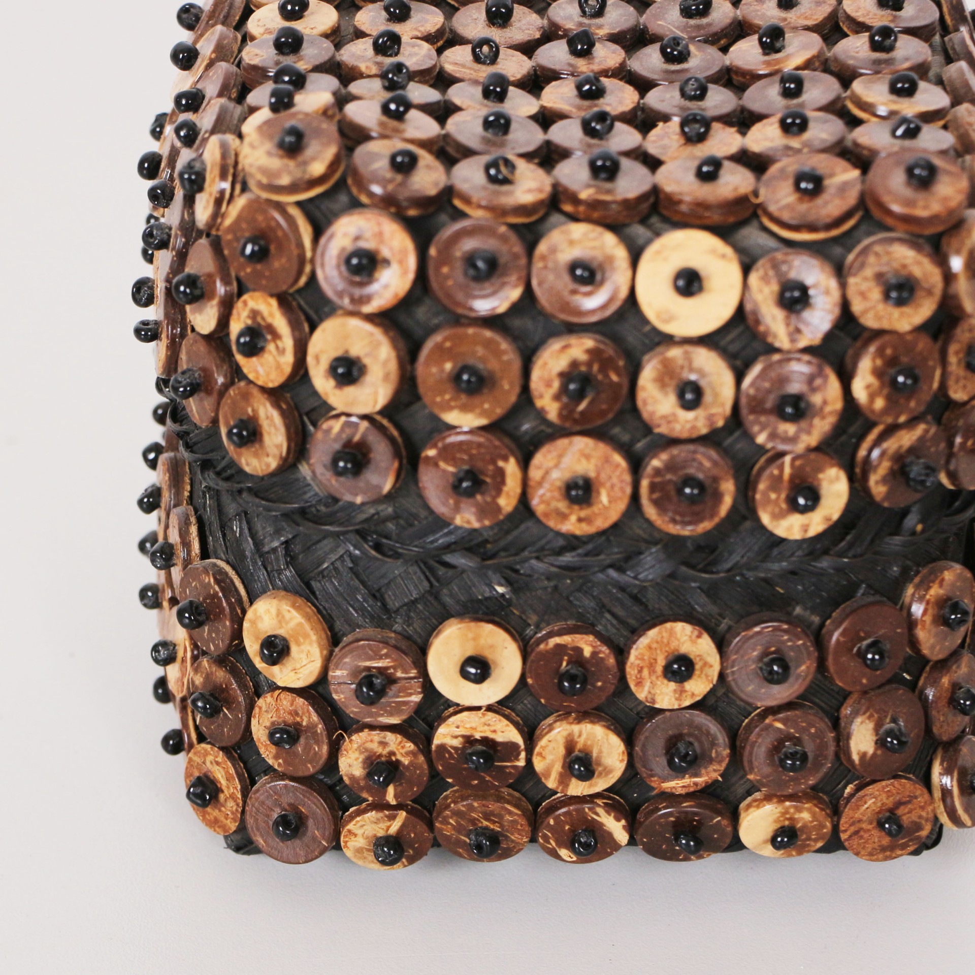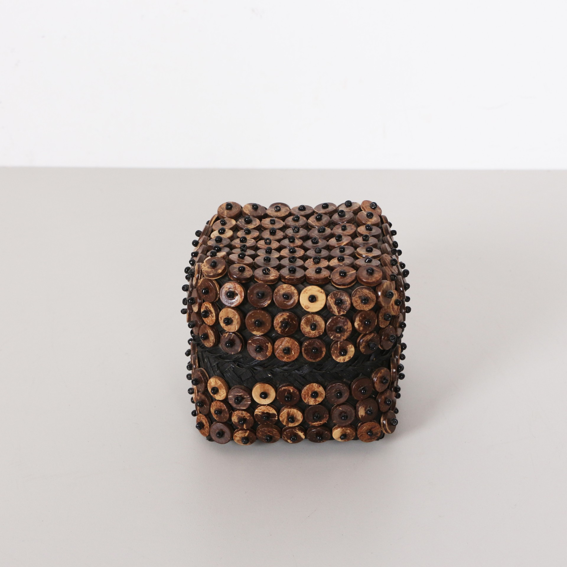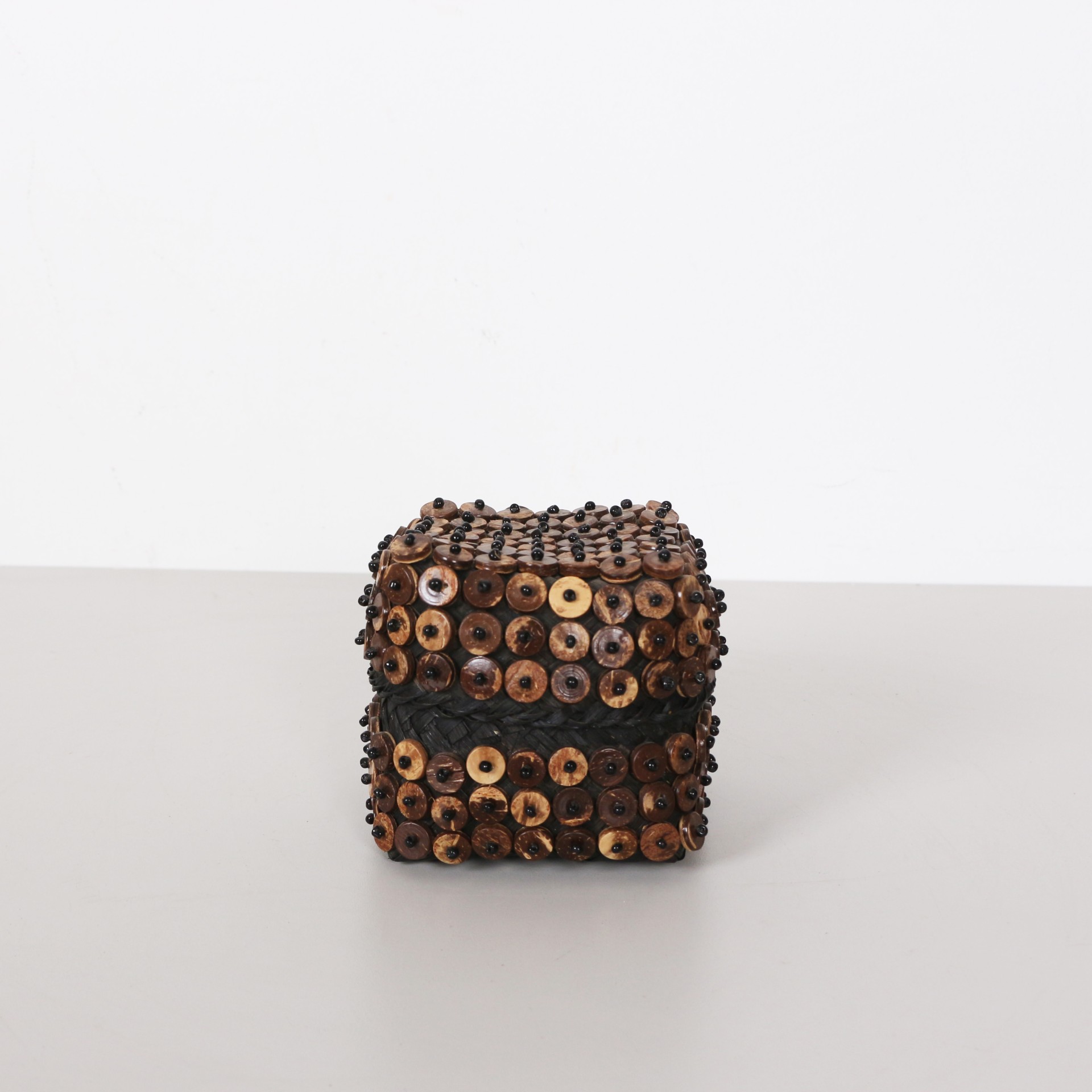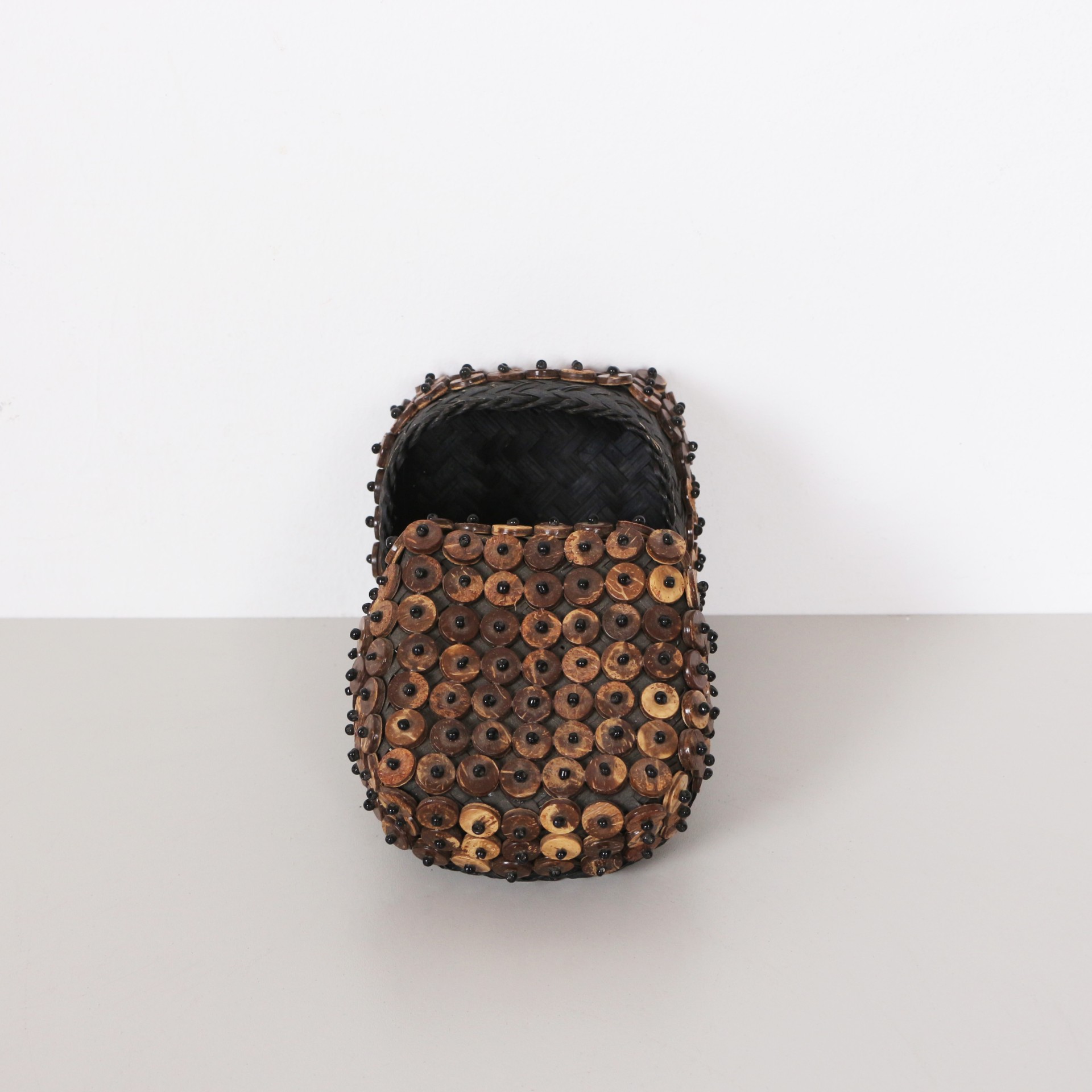 - Doğal Bambunun dış kabuğundan el işçiliği ile örülmüştür. Hindistan cevizinin yuvarlak kesilip cam bocuklarla bambu kutunun üzerinde el işçiliği ile dekor verilmiştir.