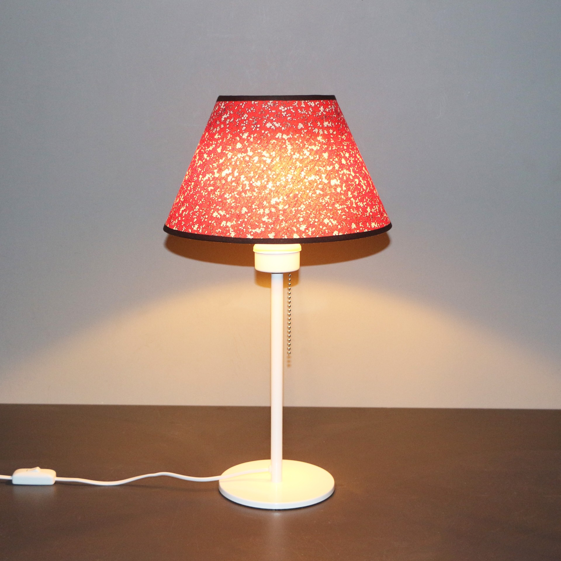 Ürünümüz; Duy kısmının altında Çekme zinciri ile kolay açma kapama yapmanız için tasarlanmıştır. Aynı zamanda kablosunda da bir arapuar vardır. Ayrıca devrilmeyi önlemesi ve stabil durması için, 18 cm çapında ve 8 mm kalınlığında DKP lazer kesim tabanlıdır. Sanatkar ustalarımızca pvc tabanlı ışık geçirgenliği olan özel baskı abajur kumaşından, statik boyalı tel üzerine el işçiliği ile titizlikle yapılmıştır.
